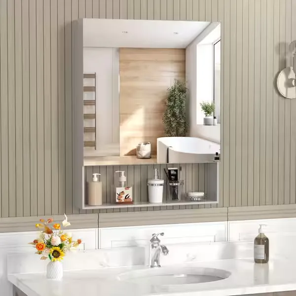 Enhance your bathroom storage with the incredibly functional and stylish Rectangular Medicine Cabinet with Mirror. This modern fixture perfectly blends form and utility, featuring a sleek, reflective mirrored surface that easily brightens up your space. It is designed to provide ample storage room for all of your daily essentials, keeping your vanity neat and organized. The integrated external shelf offers convenient, quick access for frequently used items or decorative accents, ensuring a highly customized and practical layout. Built for durability and everyday use, this cabinet is an excellent solution for anyone looking to maximize their bathroom space without sacrificing aesthetic appeal. Browse our catalog to discover how this highly versatile medicine cabinet can complete your next bathroom upgrade.