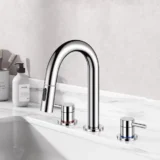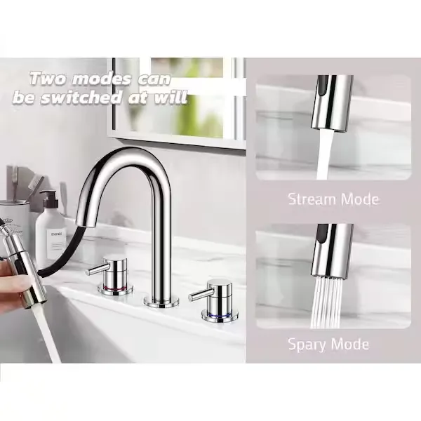 Elevate your daily routine with the AKLFGN Widespread Bathroom Sink Faucet, an innovative fixture designed to bring ultimate convenience to your vanity space. Featuring a unique pull out sprayer and a high arc nozzle that smoothly rotates 360 degrees, this double handle faucet provides complete sink coverage with no dead angles. It offers two versatile water dispensing modes, allowing you to easily switch between a standard stream and a powerful spray rinse—perfect for everyday tasks or quick cleanups. Engineered for reliable performance, the built in aerator delivers a quiet and splash free water flow while conserving water. This beautifully crafted faucet fits a standard 3 hole widespread configuration and comes complete with all necessary hardware for a quick installation. Available in a selection of elegant finishes including Matte Black, Brushed Gold, Brushed Nickel, and Chrome. Browse our catalog to discover how this highly functional and stylish piece can transform your bathroom remodel.