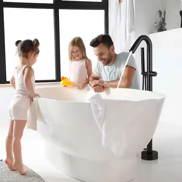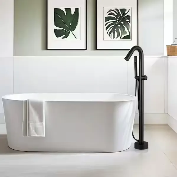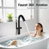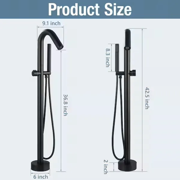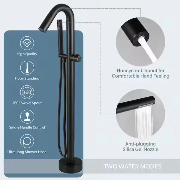 Elevate your bathroom oasis with the sleek and modern AKLFGN Floor Mount Roman Tub Faucet. This freestanding tub filler is expertly designed to provide both durability and reliability, featuring a solid brass construction and a smooth operating ceramic cartridge for long lasting performance. The stunning matte black finish ensures resistance against corrosion and tarnishing while adding a bold, contemporary statement to any bathroom space. It features a convenient single handle design for easy water temperature and flow adjustments, alongside a diverter valve knob that smoothly switches the water flow from the waterfall tub spout to the handheld shower. The modern handheld shower wand delivers a powerful, full body spray that is perfect for rinsing off or keeping your bathtub clean. Designed for straightforward floor standing installation, it comes complete with extra long screws and step by step instructions, allowing you to complete your bathroom upgrade without the need for a professional plumber. Browse our catalog to discover how this elegantly crafted fixture can perfectly complement your bathtub setup.