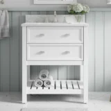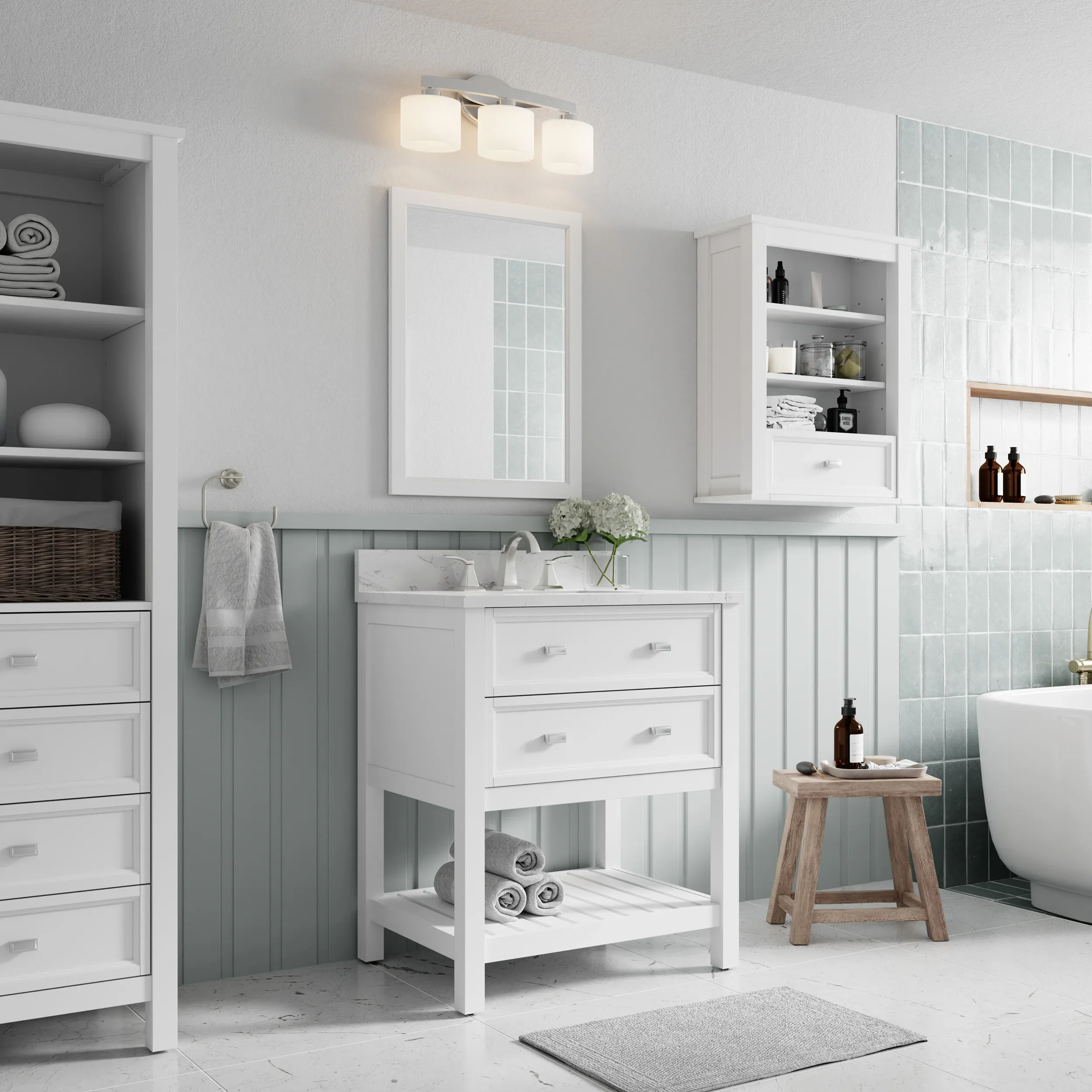 Update your space with the classic charm of the allen + roth Canterbury Bathroom Vanity collection. Built with a sturdy solid wood frame and painted in a crisp White finish, this vanity provides a clean and timeless look for any bathroom remodel. The piece is crowned with a beautiful Carrara engineered marble top that features a pre-attached undermount rectangular sink, offering both durability and easy maintenance for daily use. Available in multiple sizes to suit any floor plan, you can select from a 30 inch or 36 inch single sink for guest baths, a 48 inch single sink for added counter space, or a spacious 60 inch double vanity for master bathrooms. The design includes functional storage options to keep your toiletries organized and neatly tucked away. Browse our catalog to explore the full Canterbury collection and find the exact dimensions needed to complete your next bathroom renovation.