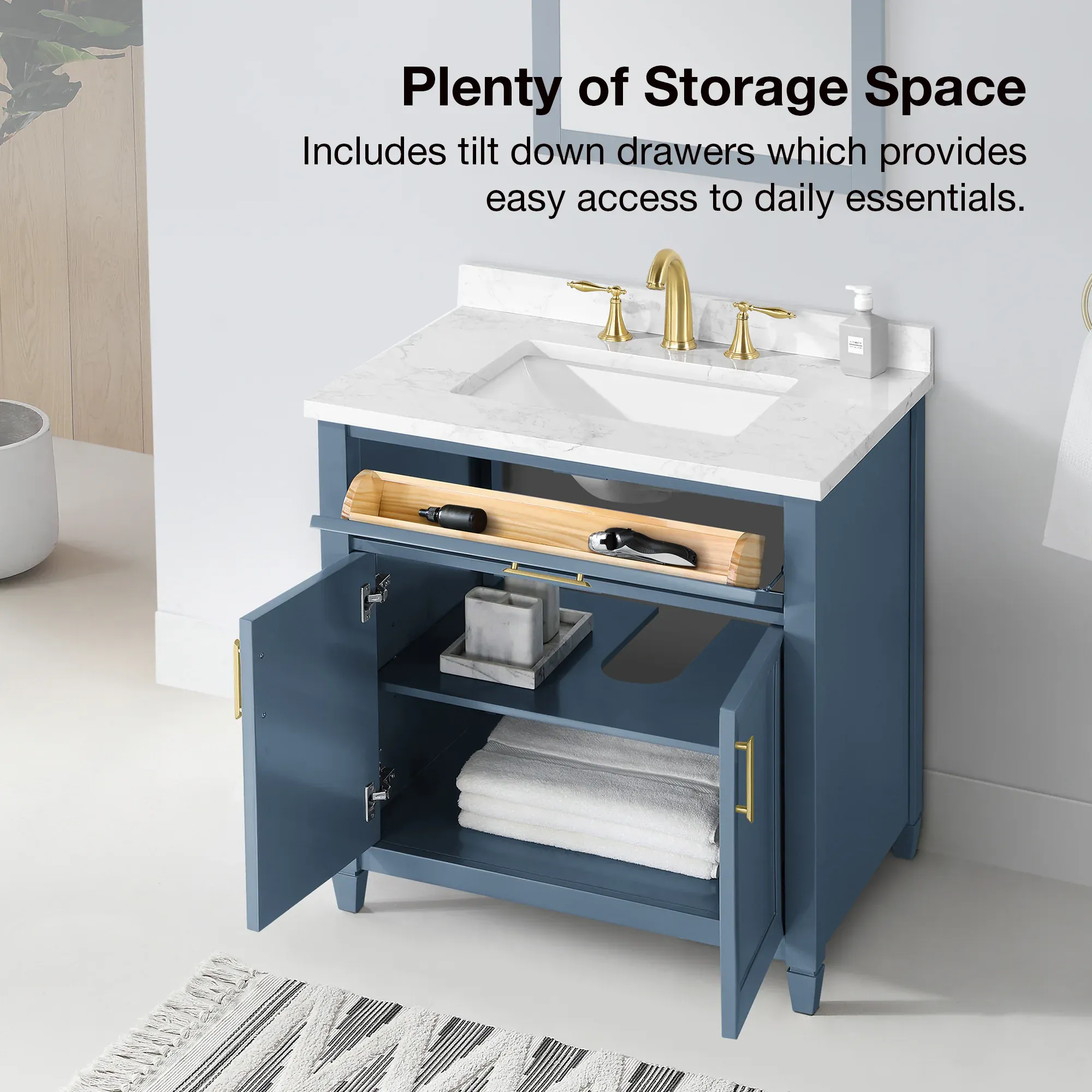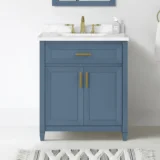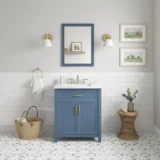 Elevate your bathroom remodel with the allen + roth Lancashire Bathroom Vanity collection. Built to endure daily use without compromising on style, this freestanding vanity combines a timeless aesthetic with durable construction. Designed with a sturdy solid wood frame and it is beautifully complemented by brushed gold hardware for a refined look. The vanity features a pre attached white engineered marble top with a seamless ceramic undermount rectangular sink, making maintenance effortless. Spanning multiple sizes to accommodate any layout, you can select from a 30 inch single sink ideal for half baths and powder rooms, all the way to a spacious 60 inch double sink for master bathrooms. The collection is thoughtfully crafted with smart storage solutions, including soft close doors, an adjustable interior shelf, and a convenient tilt down drawer to keep your space organized. Available in versatile finishes like White, Chambray Blue, and Sage Green. Browse our catalog to discover the perfect size and color to inspire your next bathroom transformation.
