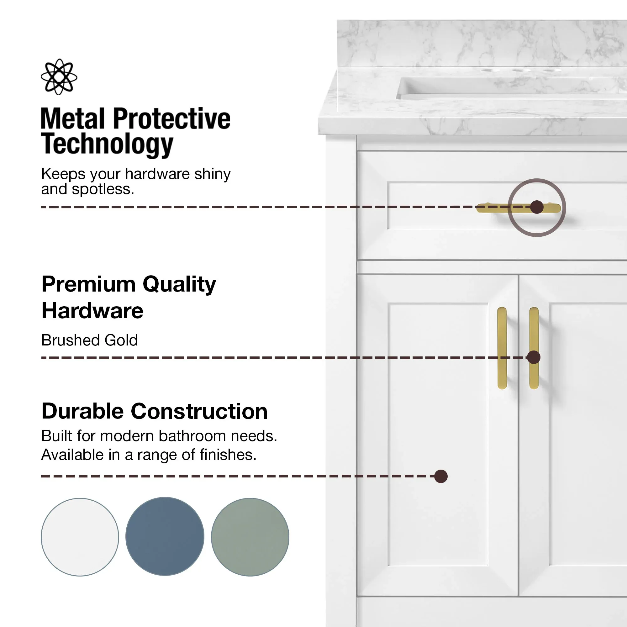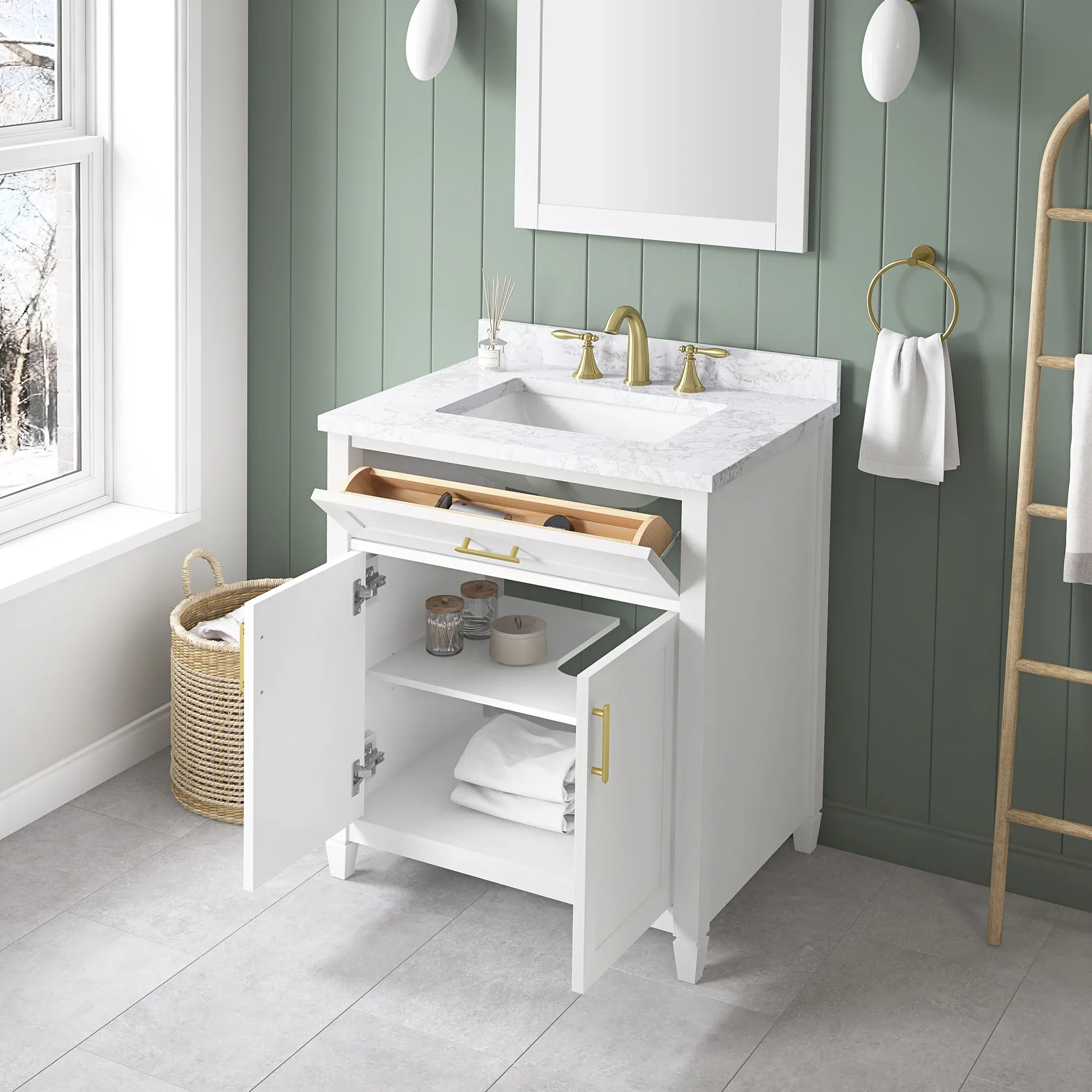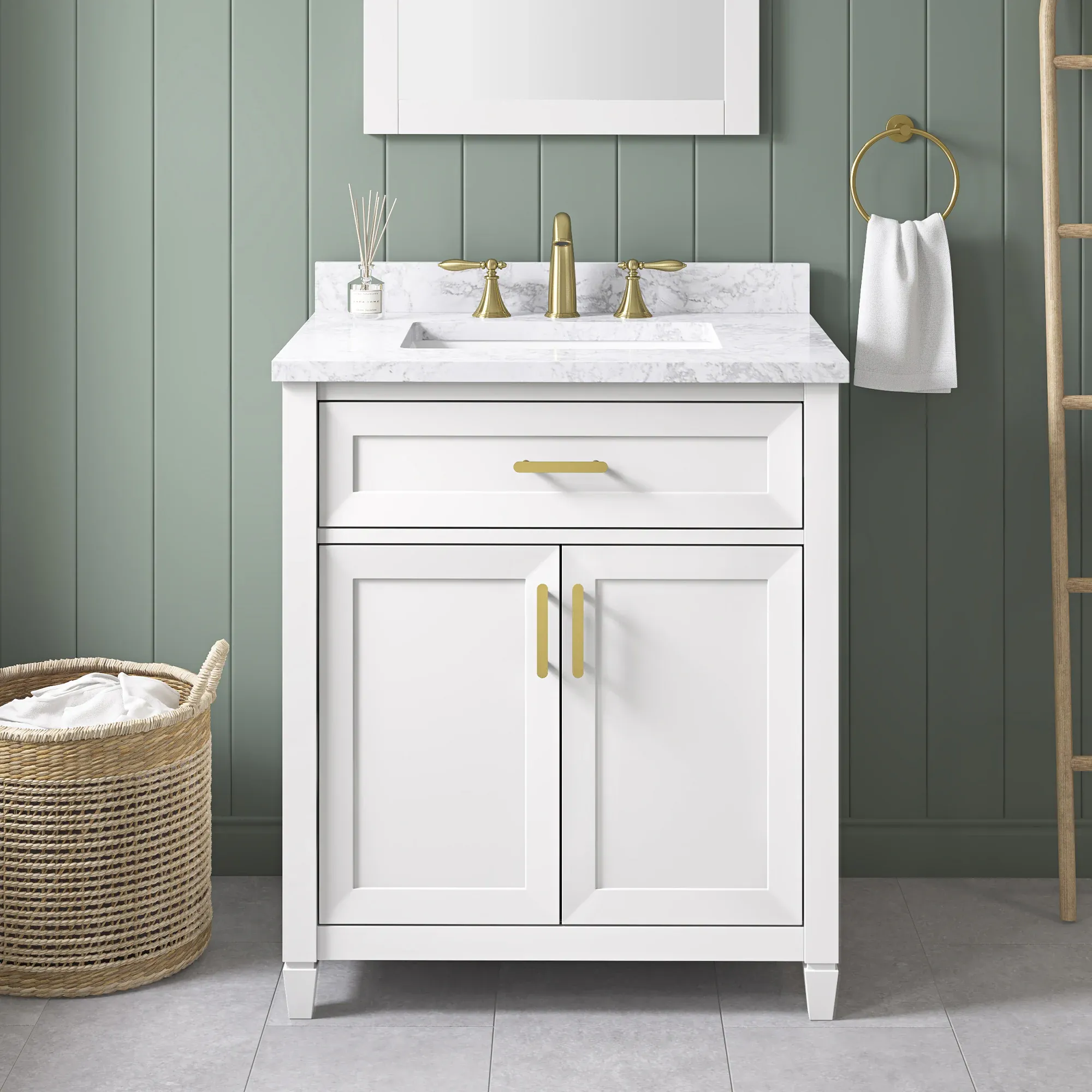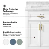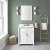 Elevate your bathroom remodel with the allen + roth Lancashire Bathroom Vanity collection. Built to endure daily use without compromising on style, this freestanding vanity combines a timeless aesthetic with durable construction. Designed with a sturdy solid wood frame and it is beautifully complemented by brushed gold hardware for a refined look. The vanity features a pre attached white engineered marble top with a seamless ceramic undermount rectangular sink, making maintenance effortless. Spanning multiple sizes to accommodate any layout, you can select from a 30 inch single sink ideal for half baths and powder rooms, all the way to a spacious 60 inch double sink for master bathrooms. The collection is thoughtfully crafted with smart storage solutions, including soft close doors, an adjustable interior shelf, and a convenient tilt down drawer to keep your space organized. Available in versatile finishes like White, Chambray Blue, and Sage Green. Browse our catalog to discover the perfect size and color to inspire your next bathroom transformation.