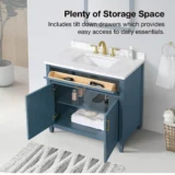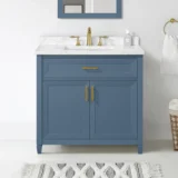 Elevate your bathroom remodel with the allen + roth Lancashire Bathroom Vanity collection. Built to endure daily use without compromising on style, this freestanding vanity combines a timeless aesthetic with durable construction. Designed with a sturdy solid wood frame and it is beautifully complemented by brushed gold hardware for a refined look. The vanity features a pre attached white engineered marble top with a seamless ceramic undermount rectangular sink, making maintenance effortless. Spanning multiple sizes to accommodate any layout, you can select from a 30 inch single sink ideal for half baths and powder rooms, all the way to a spacious 60 inch double sink for master bathrooms. The collection is thoughtfully crafted with smart storage solutions, including soft close doors, an adjustable interior shelf, and a convenient tilt down drawer to keep your space organized. Available in versatile finishes like White, Chambray Blue, and Sage Green. Browse our catalog to discover the perfect size and color to inspire your next bathroom transformation.