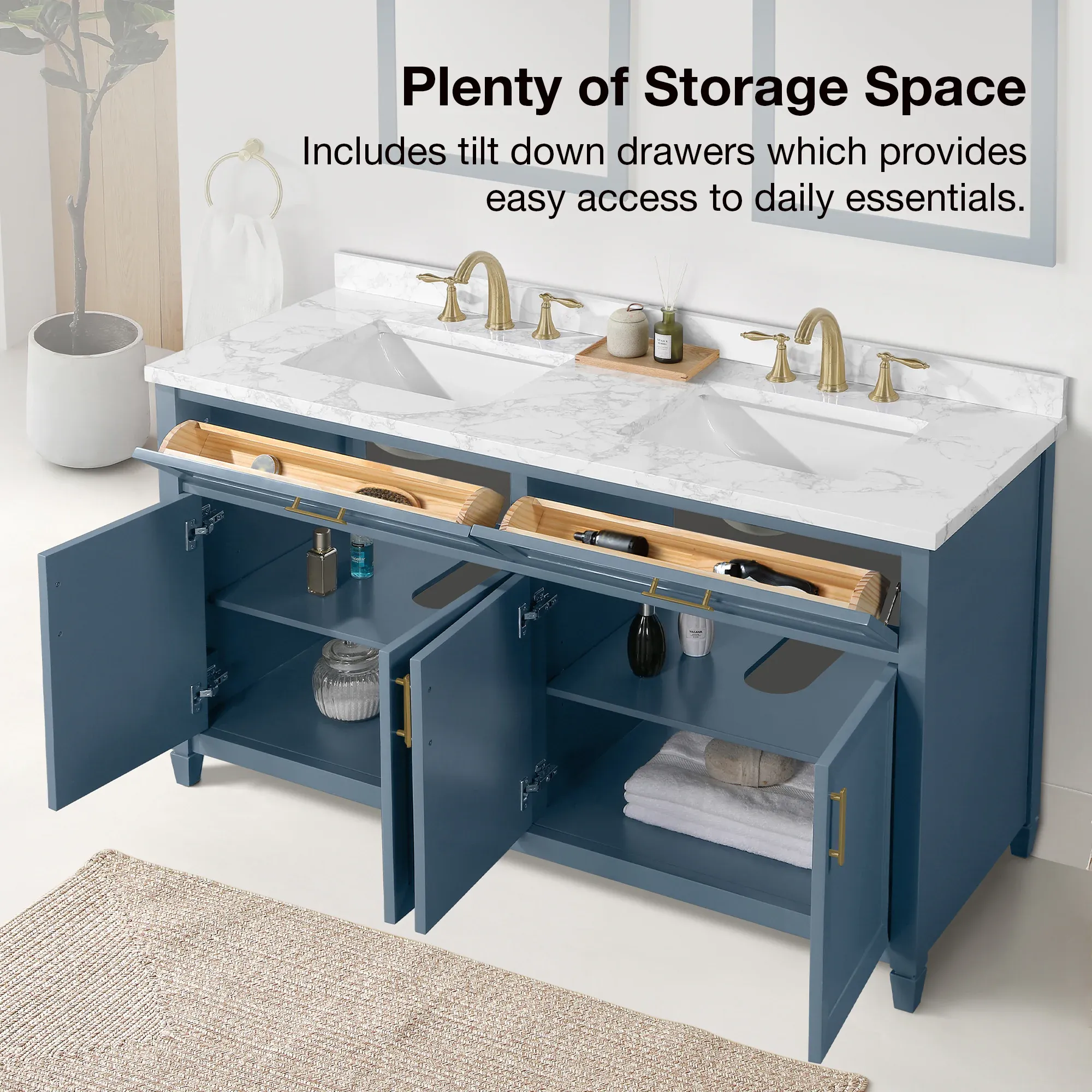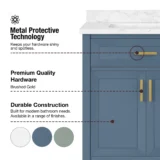 Elevate your bathroom remodel with the allen + roth Lancashire Bathroom Vanity collection. Built to endure daily use without compromising on style, this freestanding vanity combines a timeless aesthetic with durable construction. Designed with a sturdy solid wood frame and it is beautifully complemented by brushed gold hardware for a refined look. The vanity features a pre attached white engineered marble top with a seamless ceramic undermount rectangular sink, making maintenance effortless. Spanning multiple sizes to accommodate any layout, you can select from a 30 inch single sink ideal for half baths and powder rooms, all the way to a spacious 60 inch double sink for master bathrooms. The collection is thoughtfully crafted with smart storage solutions, including soft close doors, an adjustable interior shelf, and a convenient tilt down drawer to keep your space organized. Available in versatile finishes like White, Chambray Blue, and Sage Green. Browse our catalog to discover the perfect size and color to inspire your next bathroom transformation.