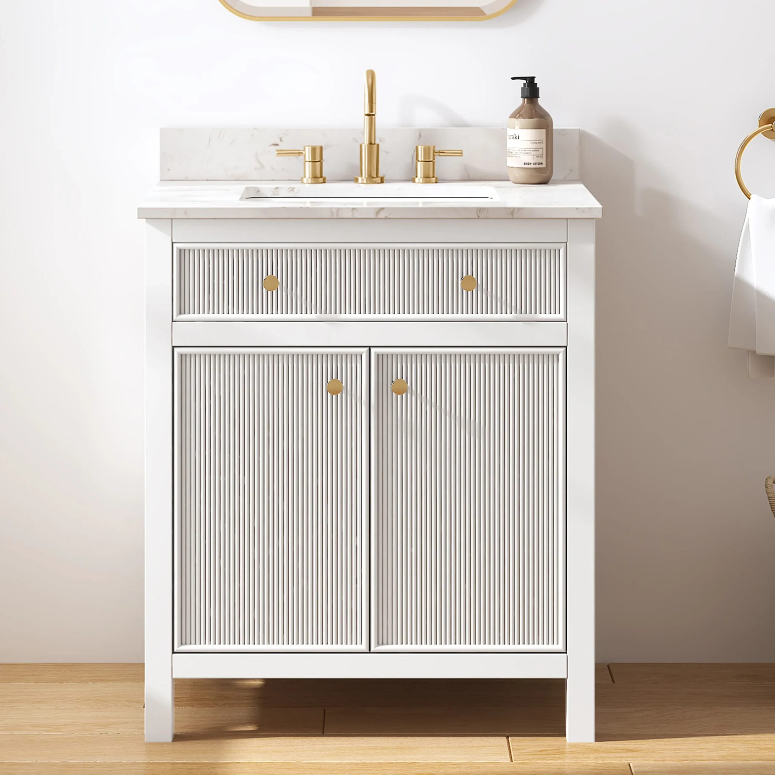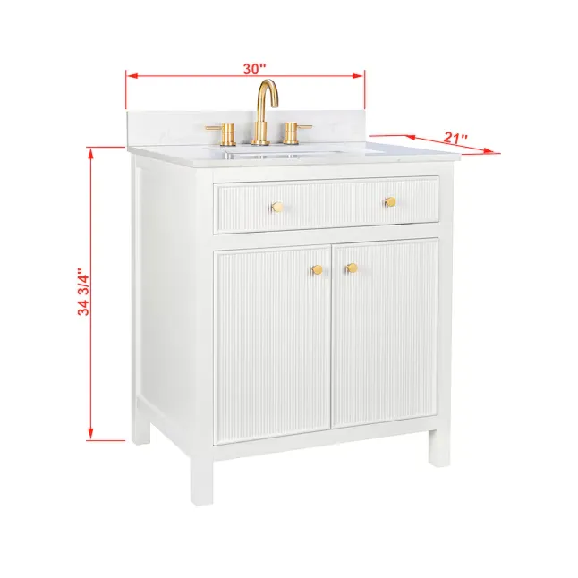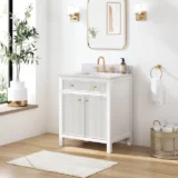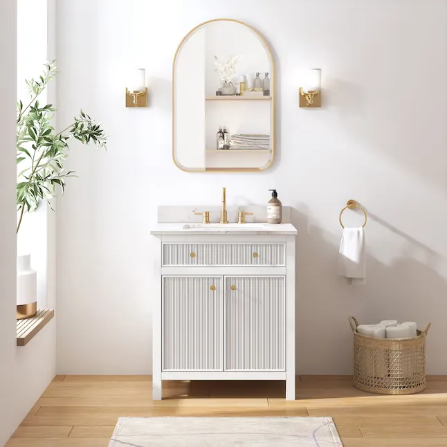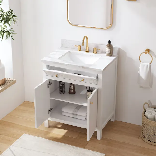 Elevate your bathroom remodel with the allen + roth Sandbanks Undermount Bathroom Vanity collection, a perfect blend of timeless elegance and everyday functionality. Crafted with a durable solid wood frame and featuring a stunning Volakas white engineered stone top, this vanity is designed to be the centerpiece of any home. Choose from multiple colors—including classic White, and modern Flaxen Greige—and find the perfect fit for your space with sizes ranging from a compact 30-inch single sink to a spacious 60-inch double vanity. Designed for optimal convenience, the Sandbanks series includes soft-close drawers and doors, built-in storage organizers, and high-quality undermount sinks. Accented with sophisticated matte gold hardware, this collection offers both luxury and longevity. Browse our catalog to discover the perfect size and finish to inspire your next master or guest bathroom transformation.