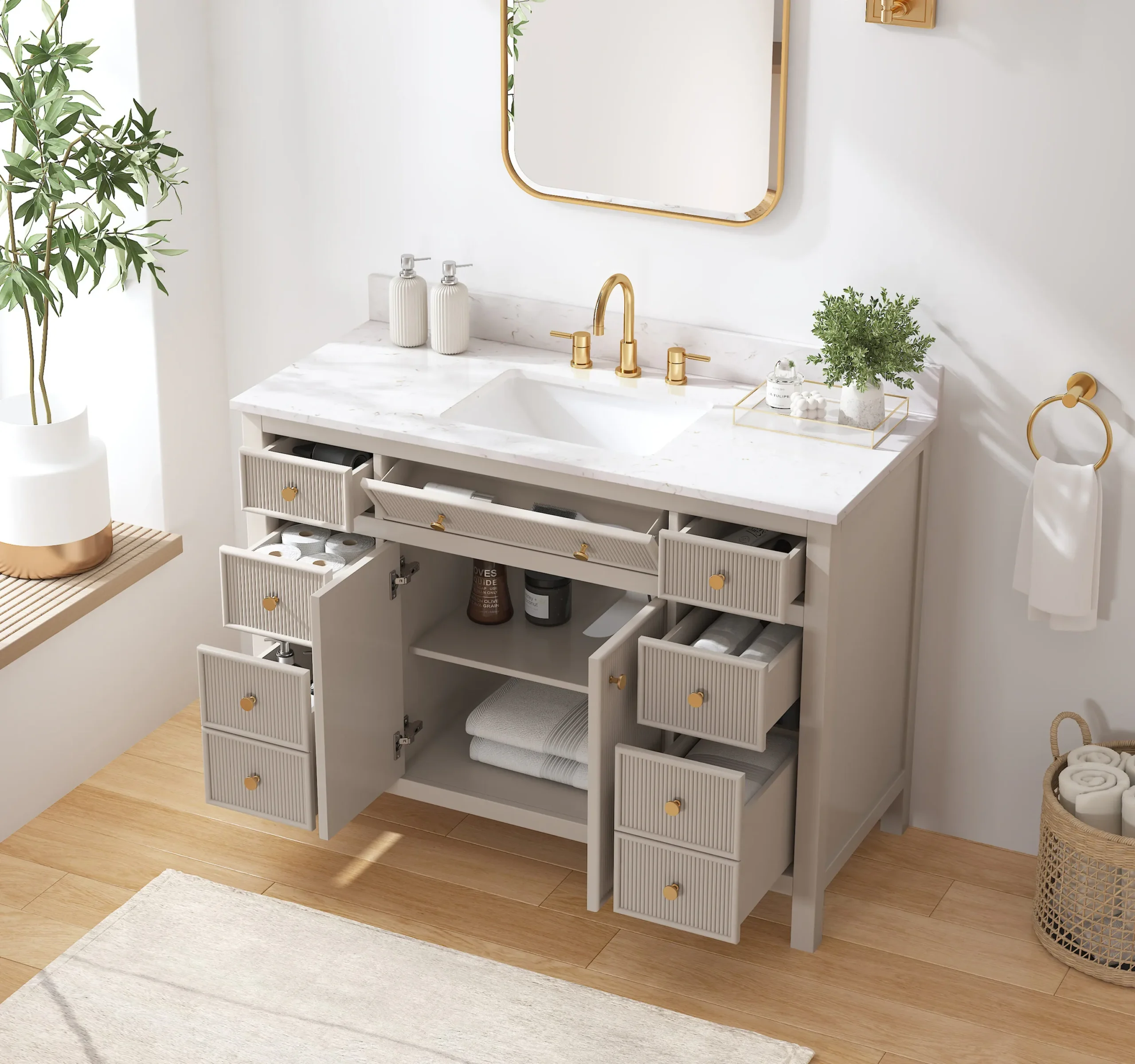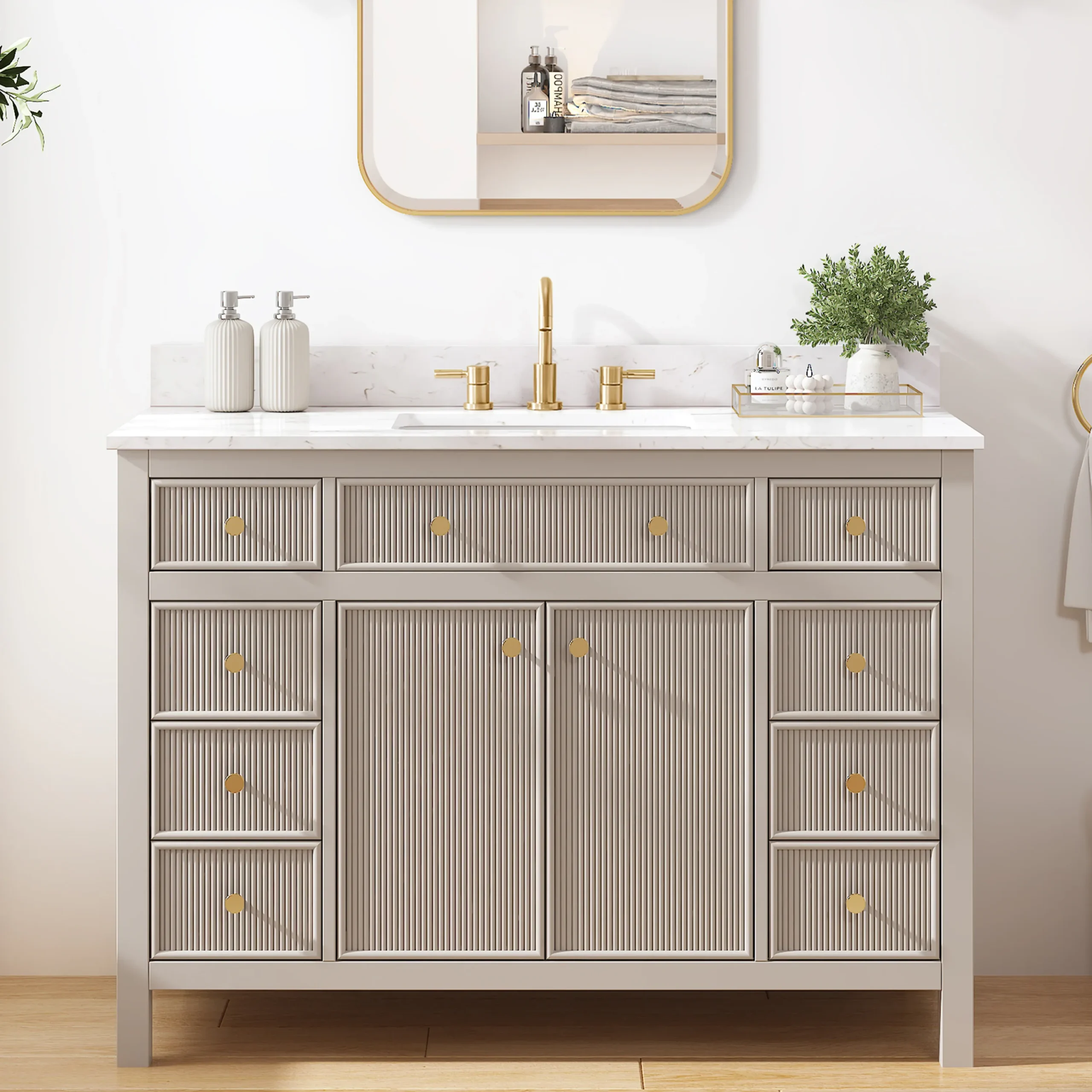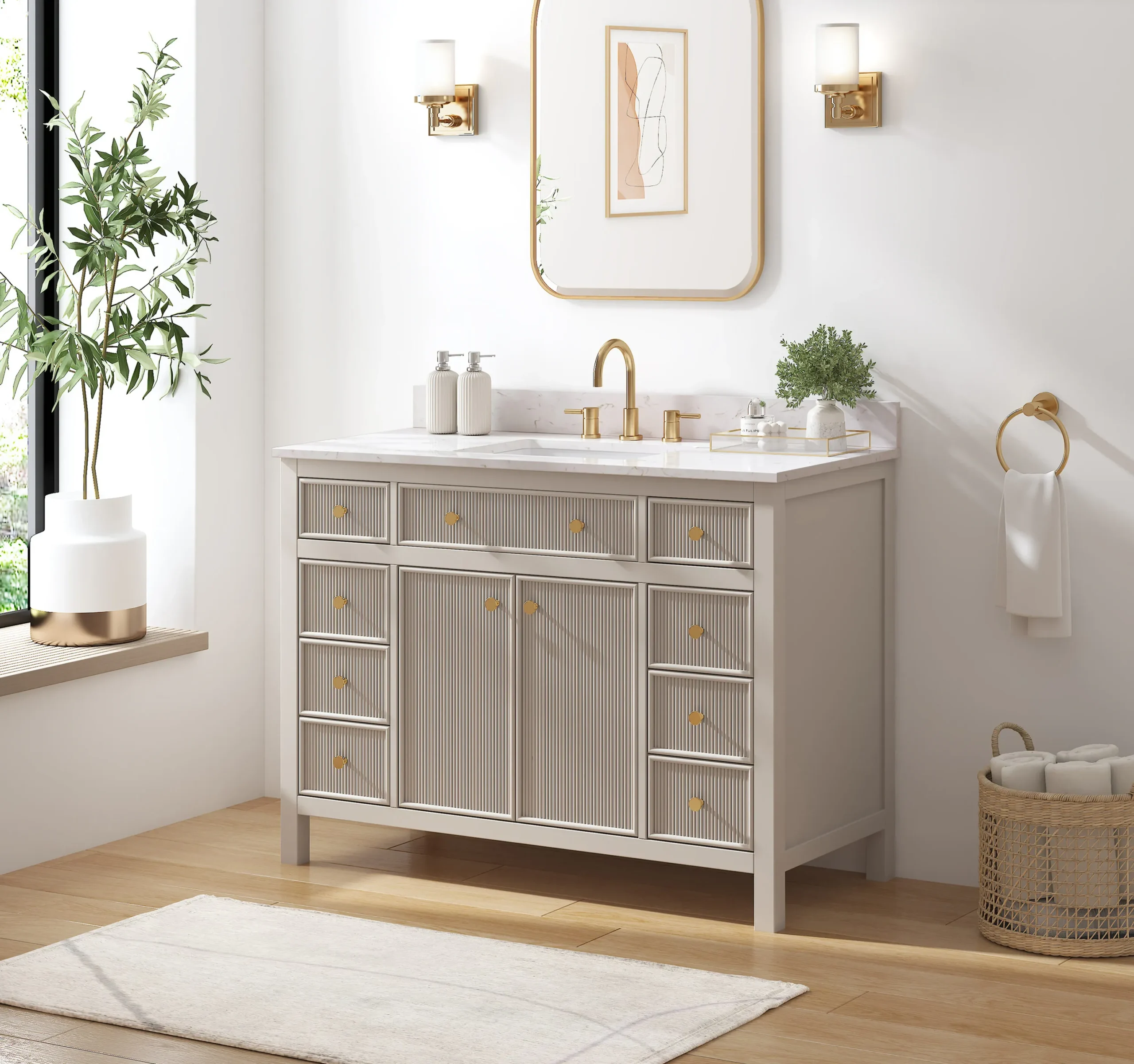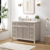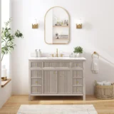 Elevate your bathroom remodel with the allen + roth Sandbanks Undermount Bathroom Vanity collection, a perfect blend of timeless elegance and everyday functionality. Crafted with a durable solid wood frame and featuring a stunning Volakas white engineered stone top, this vanity is designed to be the centerpiece of any home. Choose from multiple colors—including classic White, and modern Flaxen Greige—and find the perfect fit for your space with sizes ranging from a compact 30-inch single sink to a spacious 60-inch double vanity. Designed for optimal convenience, the Sandbanks series includes soft-close drawers and doors, built-in storage organizers, and high-quality undermount sinks. Accented with sophisticated matte gold hardware, this collection offers both luxury and longevity. Browse our catalog to discover the perfect size and finish to inspire your next master or guest bathroom transformation.