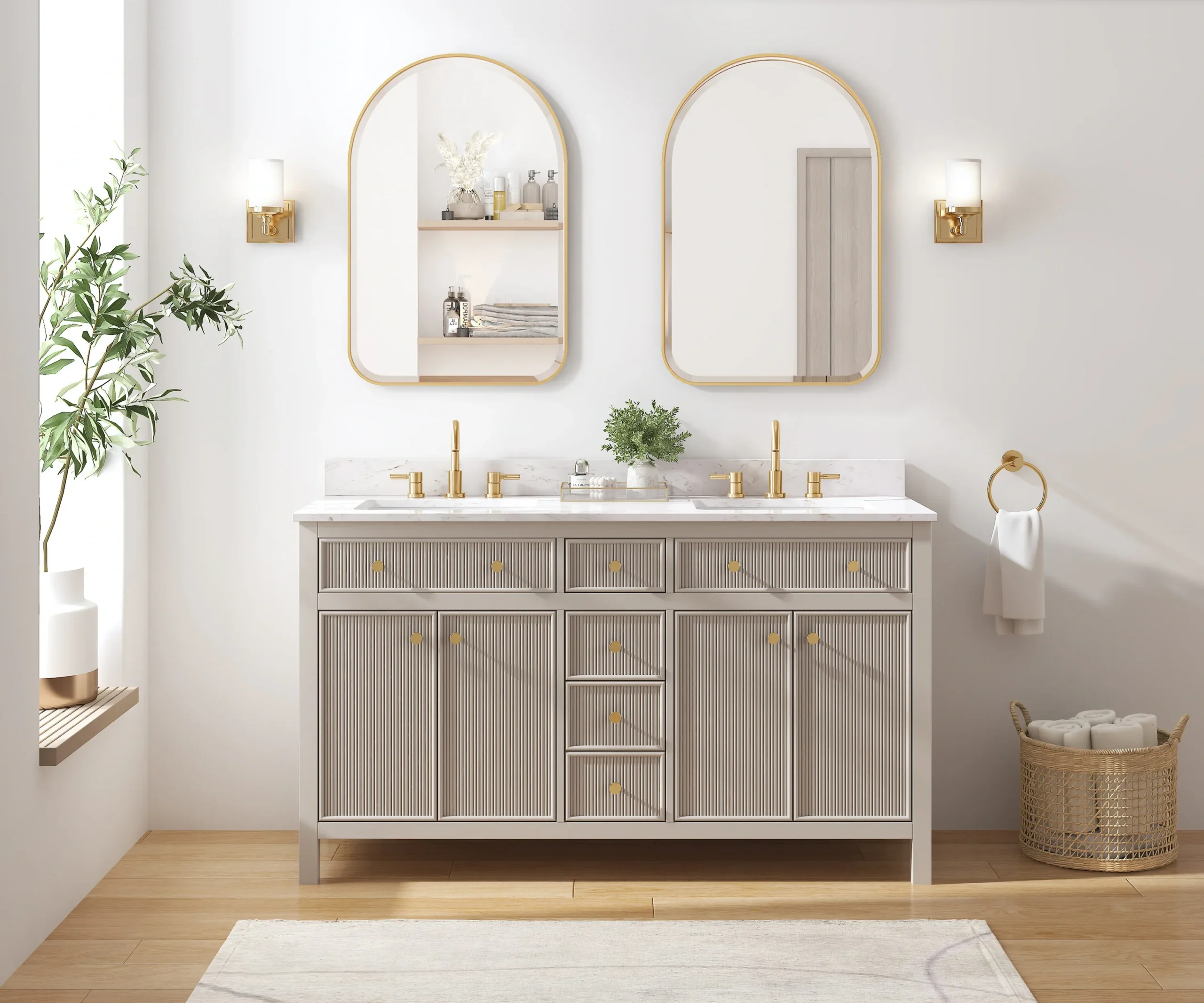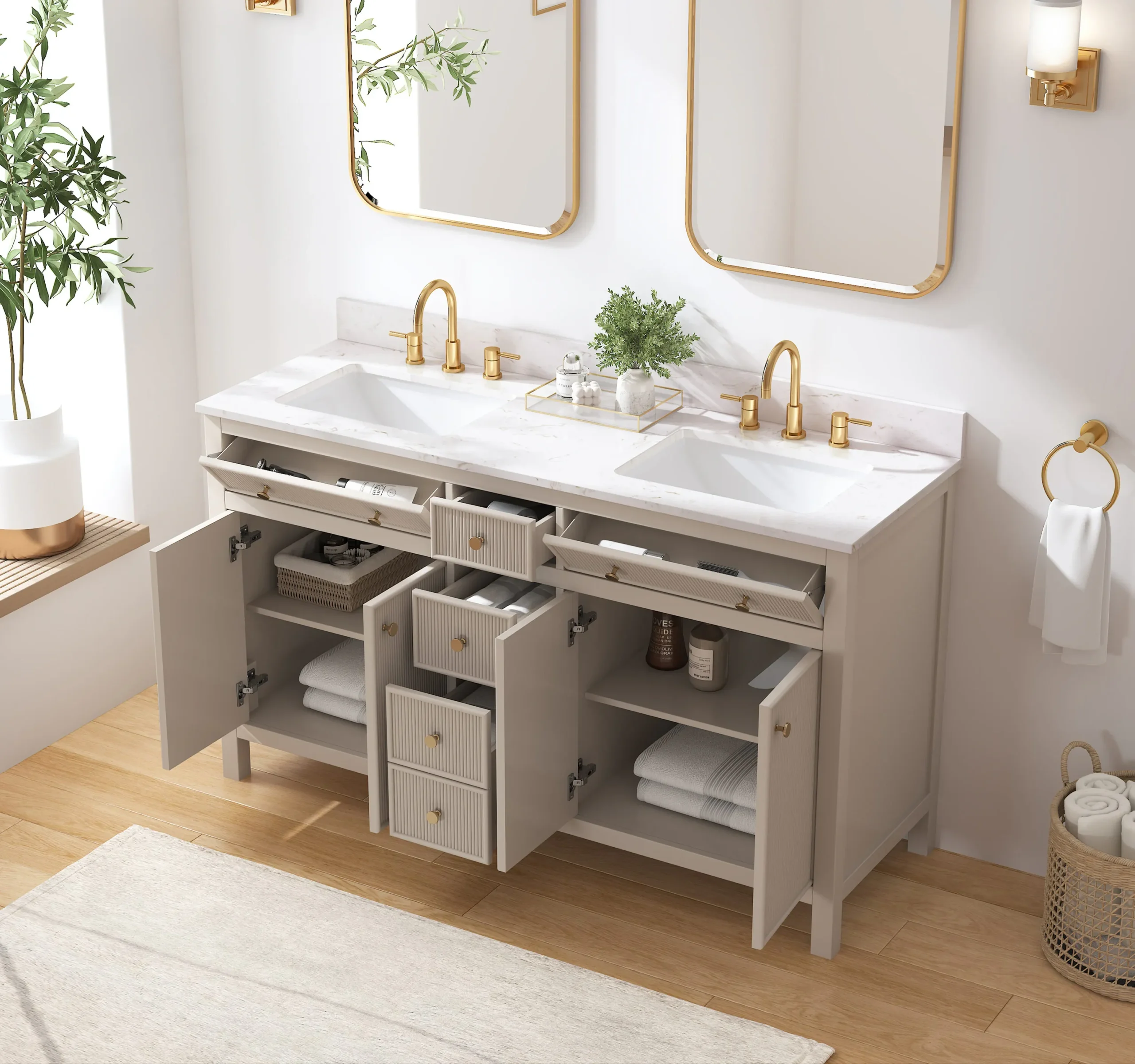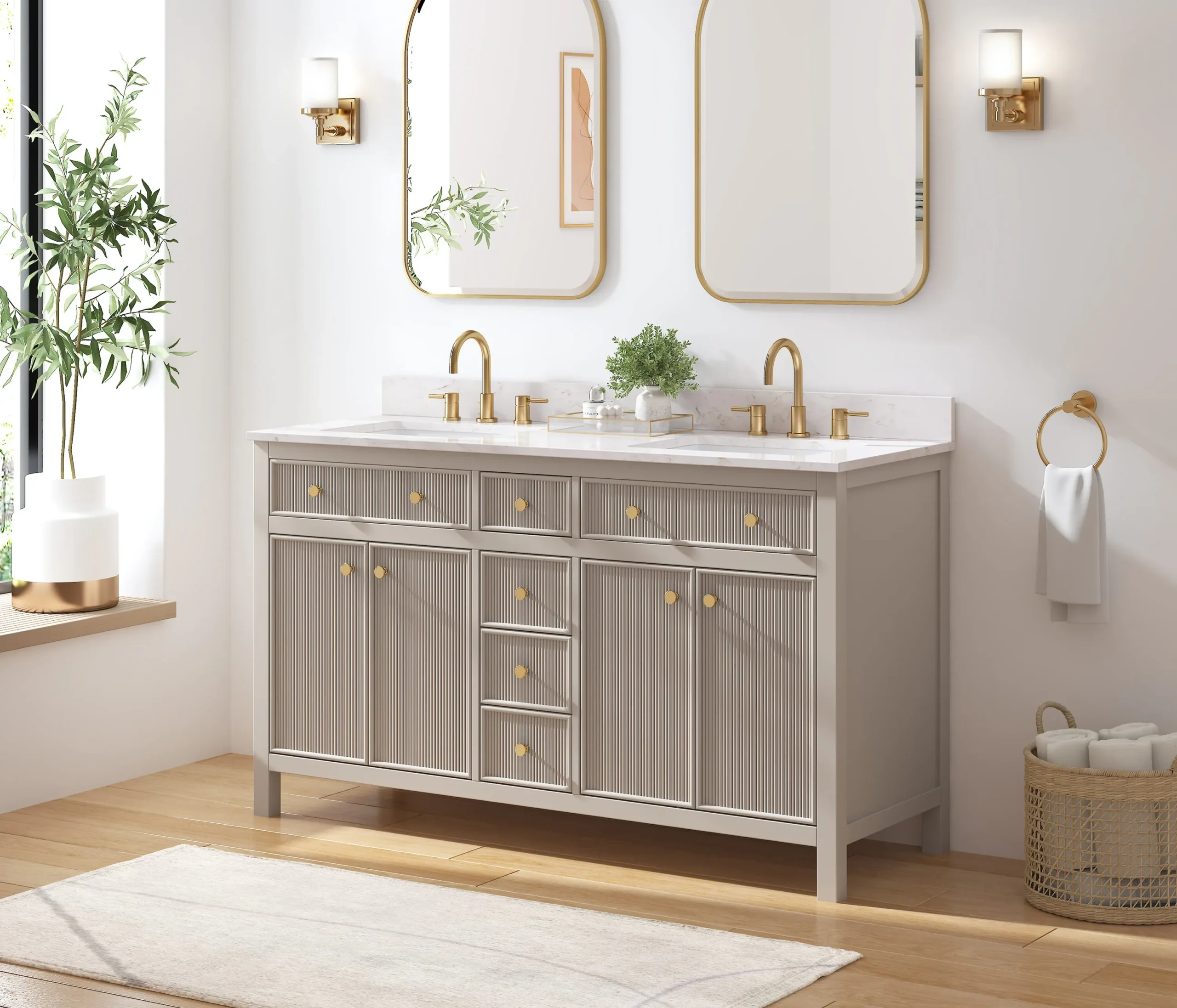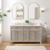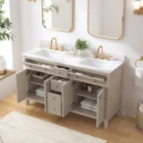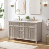 Elevate your bathroom remodel with the allen + roth Sandbanks Undermount Bathroom Vanity collection, a perfect blend of timeless elegance and everyday functionality. Crafted with a durable solid wood frame and featuring a stunning Volakas white engineered stone top, this vanity is designed to be the centerpiece of any home. Choose from multiple colors—including classic White, and modern Flaxen Greige—and find the perfect fit for your space with sizes ranging from a compact 30-inch single sink to a spacious 60-inch double vanity. Designed for optimal convenience, the Sandbanks series includes soft-close drawers and doors, built-in storage organizers, and high-quality undermount sinks. Accented with sophisticated matte gold hardware, this collection offers both luxury and longevity. Browse our catalog to discover the perfect size and finish to inspire your next master or guest bathroom transformation.