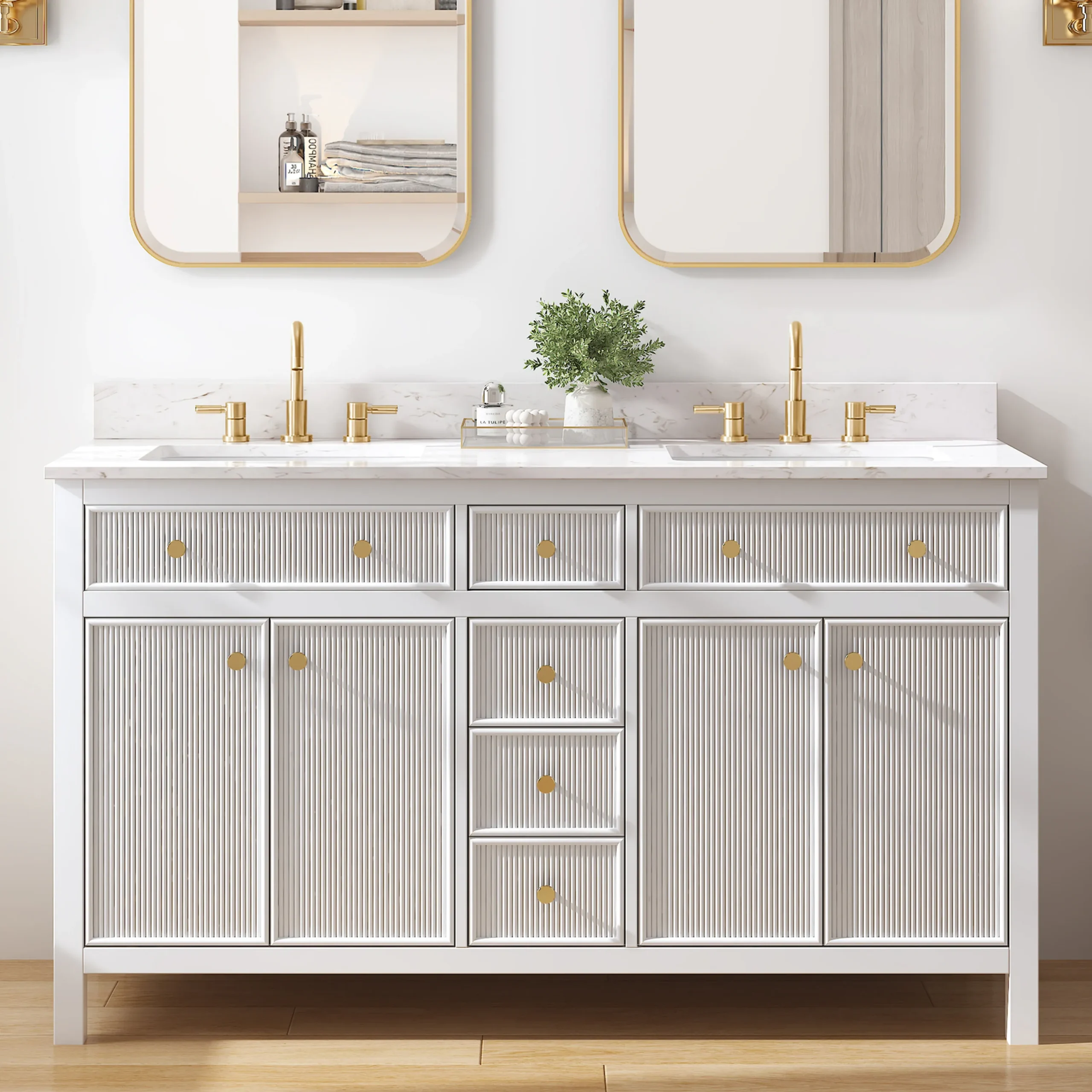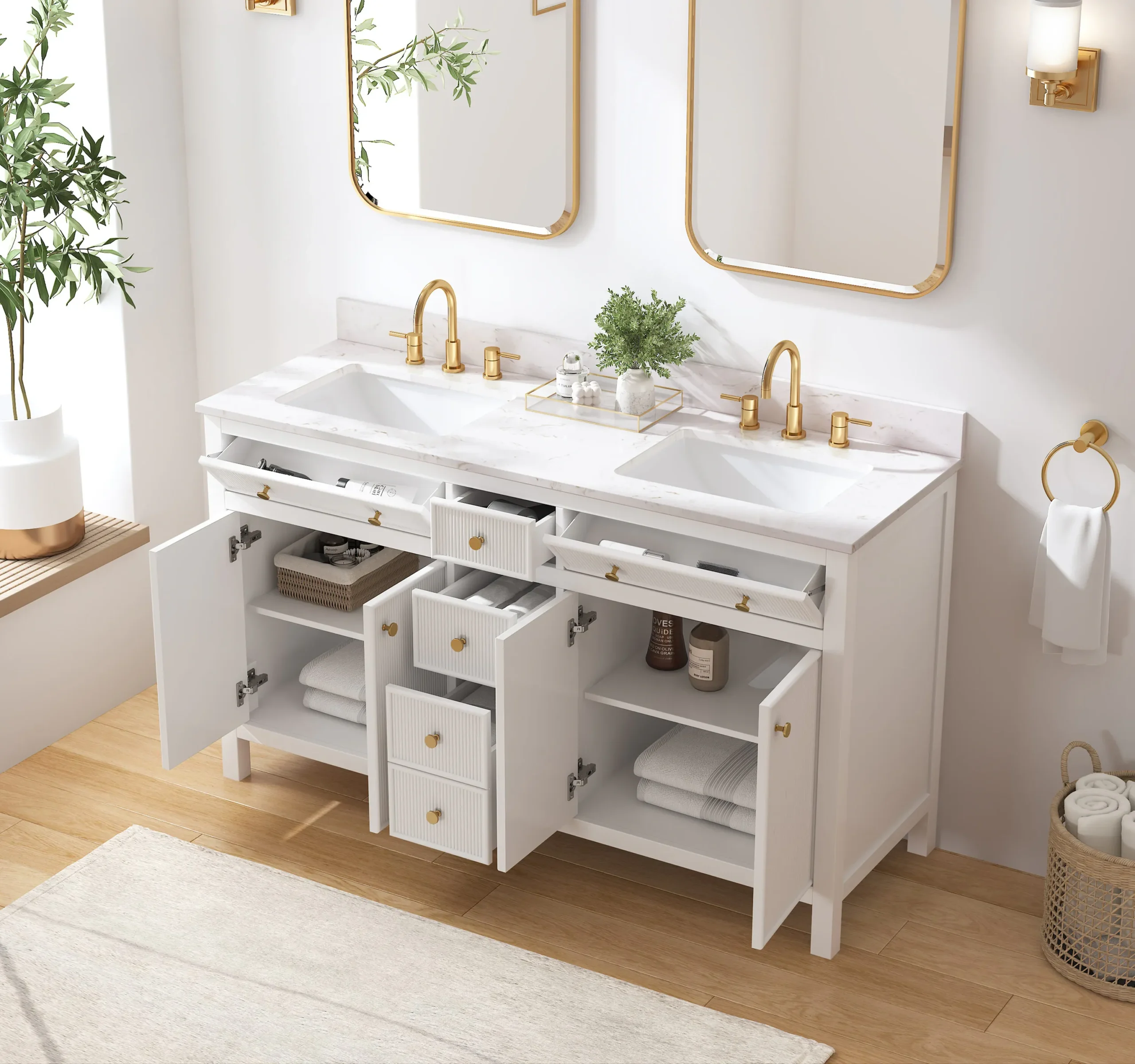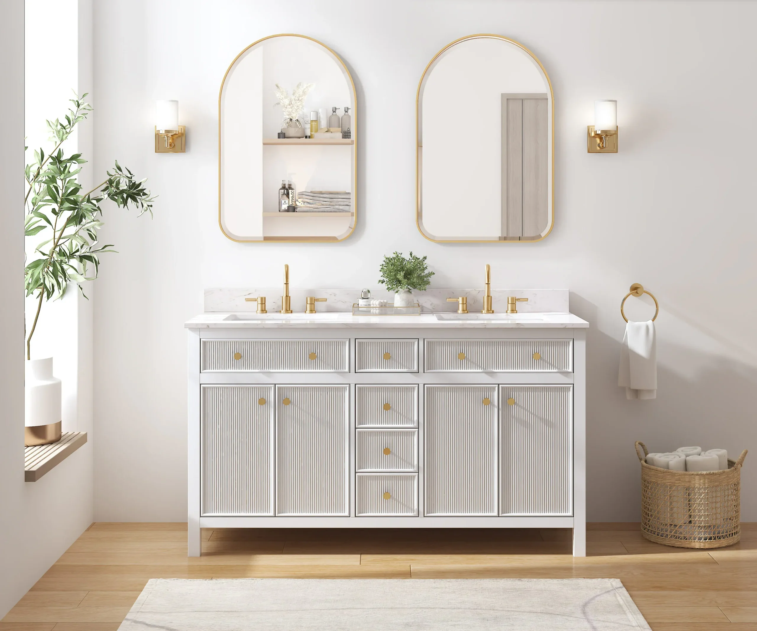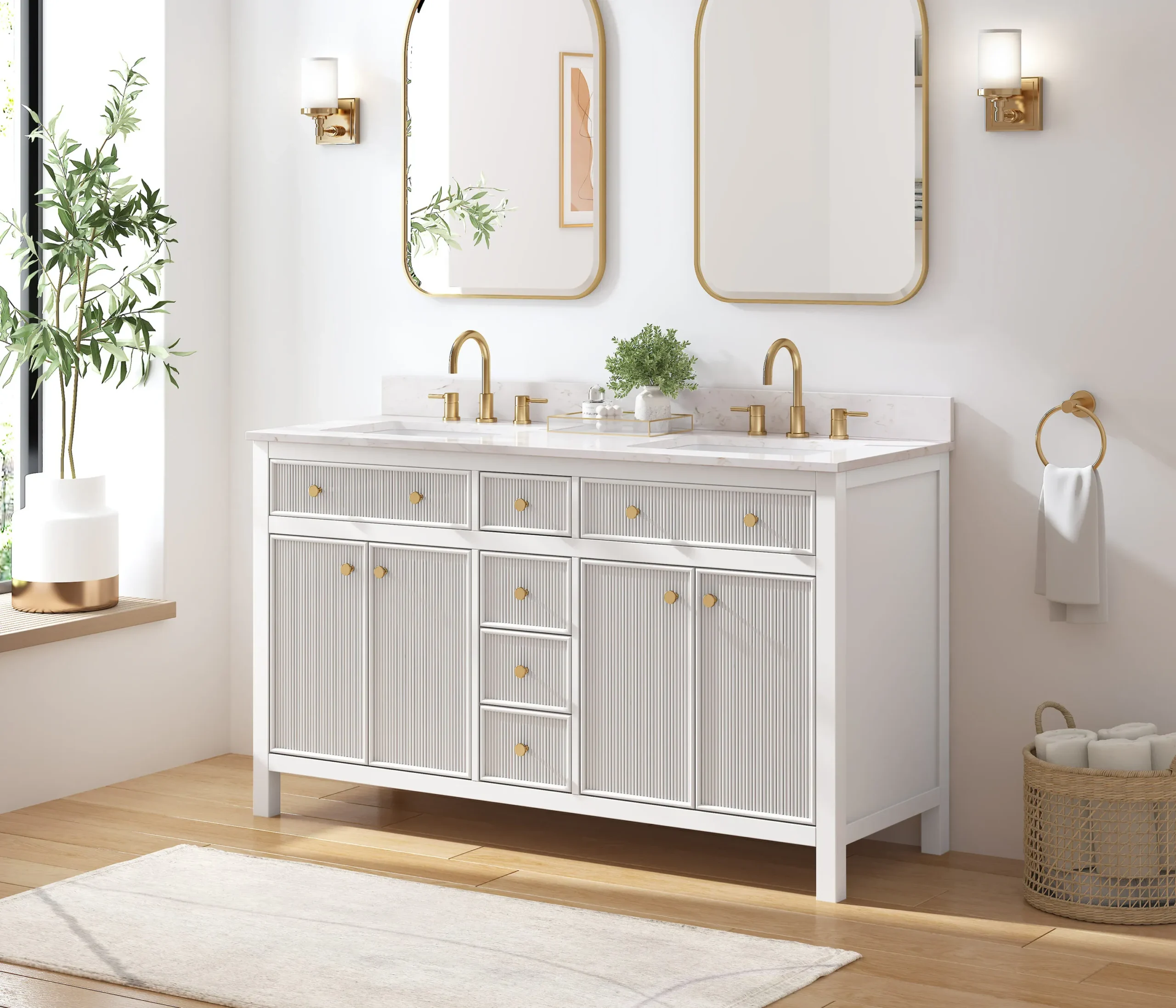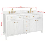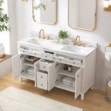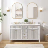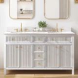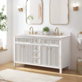 Elevate your bathroom remodel with the allen + roth Sandbanks Undermount Bathroom Vanity collection, a perfect blend of timeless elegance and everyday functionality. Crafted with a durable solid wood frame and featuring a stunning Volakas white engineered stone top, this vanity is designed to be the centerpiece of any home. Choose from multiple colors—including classic White, and modern Flaxen Greige—and find the perfect fit for your space with sizes ranging from a compact 30-inch single sink to a spacious 60-inch double vanity. Designed for optimal convenience, the Sandbanks series includes soft-close drawers and doors, built-in storage organizers, and high-quality undermount sinks. Accented with sophisticated matte gold hardware, this collection offers both luxury and longevity. Browse our catalog to discover the perfect size and finish to inspire your next master or guest bathroom transformation.