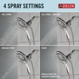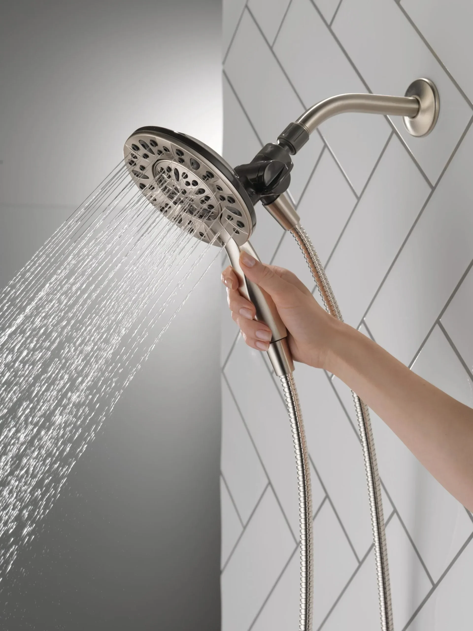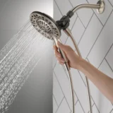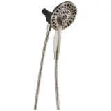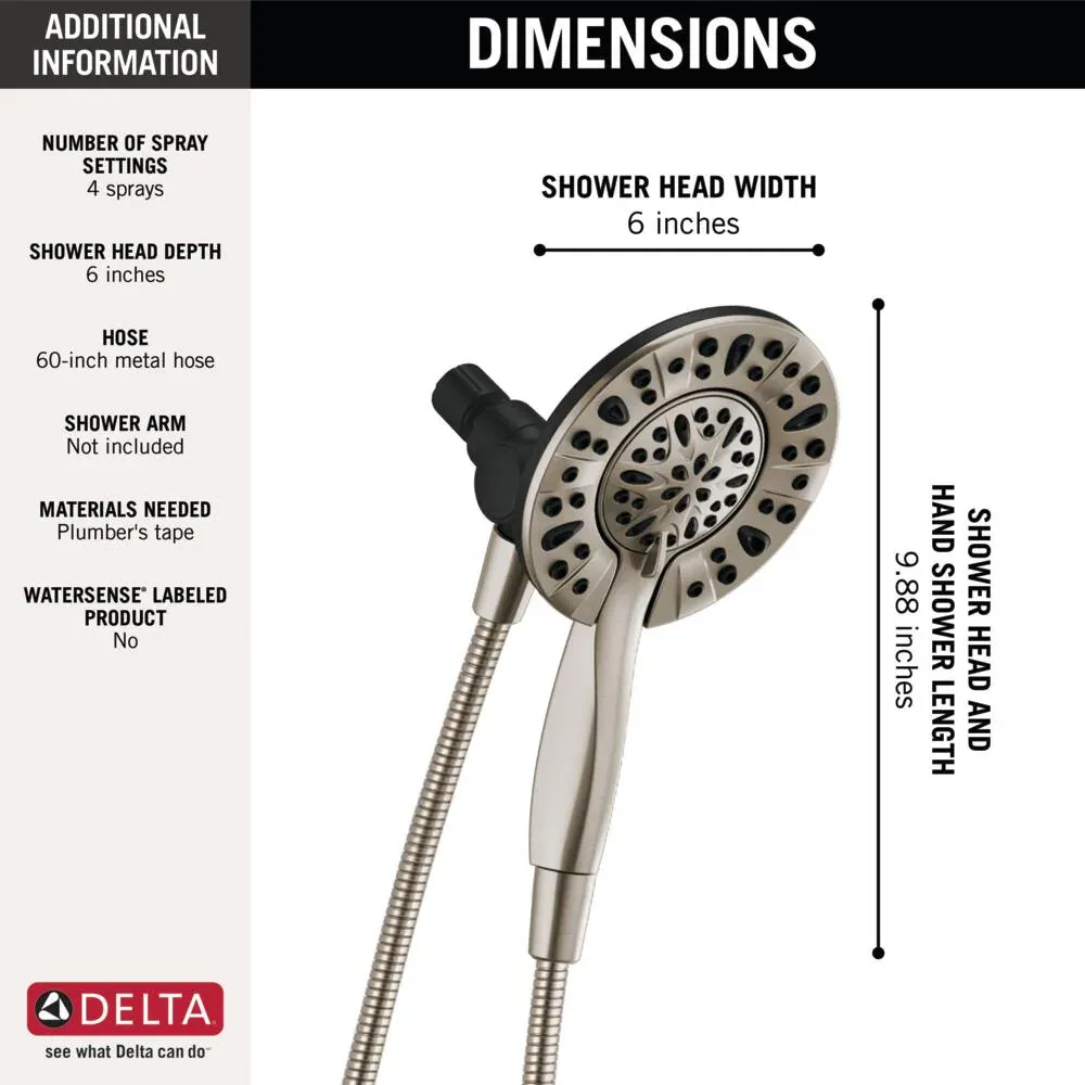 Experience maximum flexibility in your daily routine with the Delta In2ition Two in One Shower Head. Designed with integrated dual functionality, this innovative fixture features a detachable hand shower that docks securely into the main shower head. The built in diverter allows you to run water from the shower head only, the hand shower only, or both simultaneously, ensuring you never have to sacrifice warmth or coverage. With four distinct spray settings—including Full Body, Massaging, Full Spray with Massage, and a convenient Pause feature—you can easily customize your wash. The Pause setting reduces water flow to a trickle, giving you ample space for shaving or lathering without wasting hot water. Maintenance is completely hassle free thanks to the soft rubber Touch Clean spray holes, which allow you to effortlessly wipe away calcium and lime buildup with just the touch of a finger. Delivering a flow rate of 2.5 gallons per minute and including a flexible 60 inch metal hose, this combo installs in minutes. Browse our catalog to discover how this versatile fixture can perfectly complete your next bathroom upgrade.