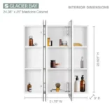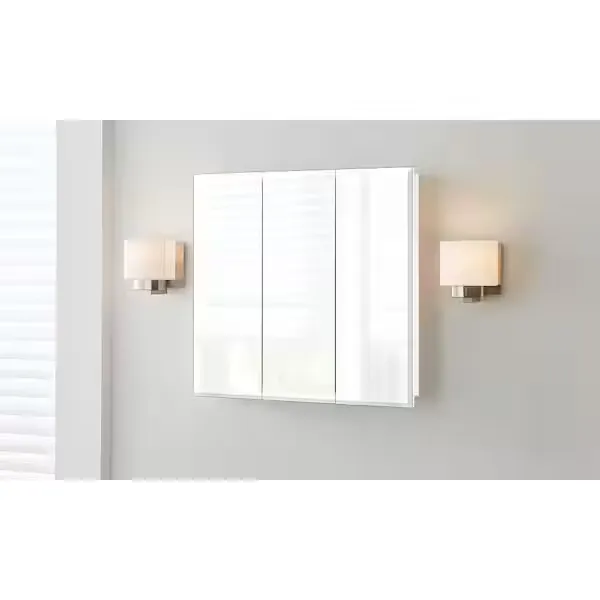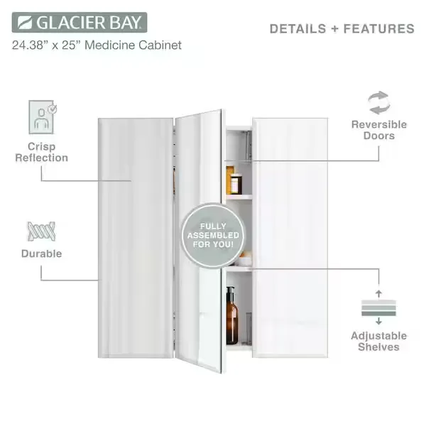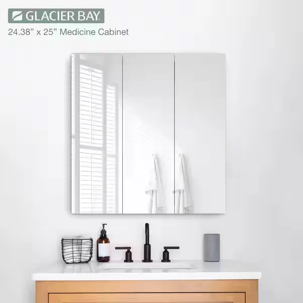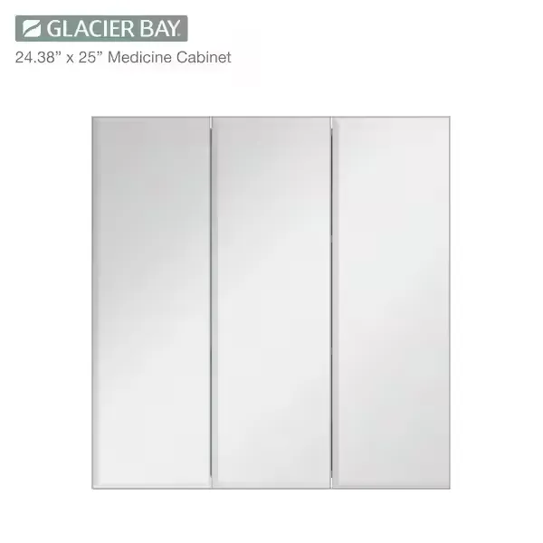Add versatile storage and a clean aesthetic to your space with the Glacier Bay Rectangular Tri View Medicine Cabinet. Featuring a classic frameless design with elegantly beveled half inch edges, this piece effortlessly complements any modern or traditional decor. The innovative tri view mirror provides multiple viewing angles, enhancing both functionality and convenience for your daily routine. Inside the bright white cabinet, you will find two adjustable shelves supported by double shelf pegs, allowing you to quickly and easily customize the space to fit your toiletries. Designed for a simple surface mount installation, the unit also features a reversible middle door that can be set to open from either the left or the right based on your personal preference. Arriving fully assembled for your convenience, this durable cabinet is built to provide reliable storage for years to come. Browse our catalog to discover how this highly practical and stylish piece can complete your vanity setup.