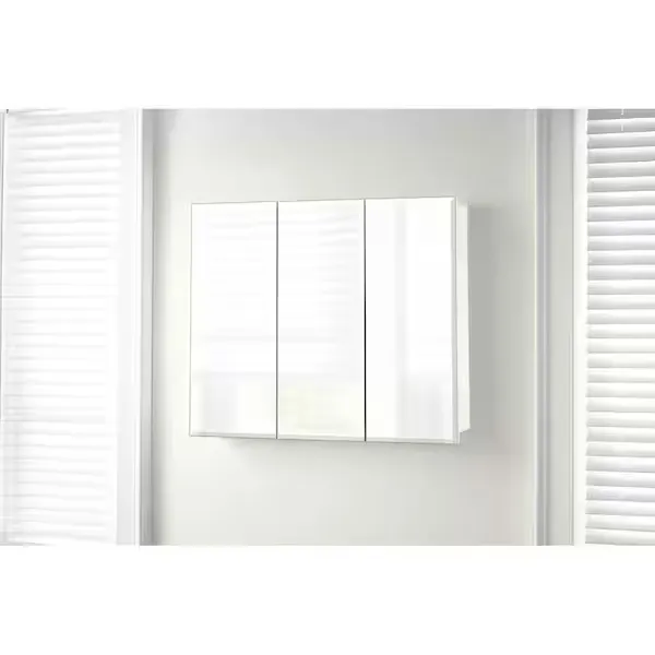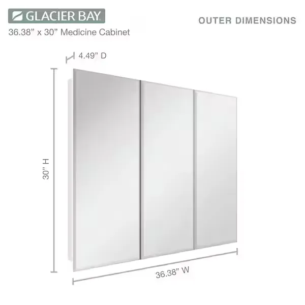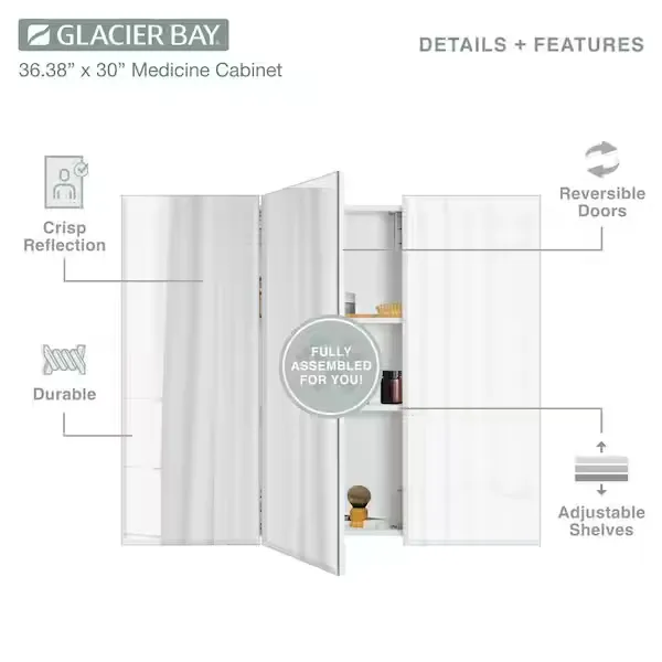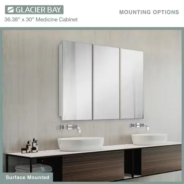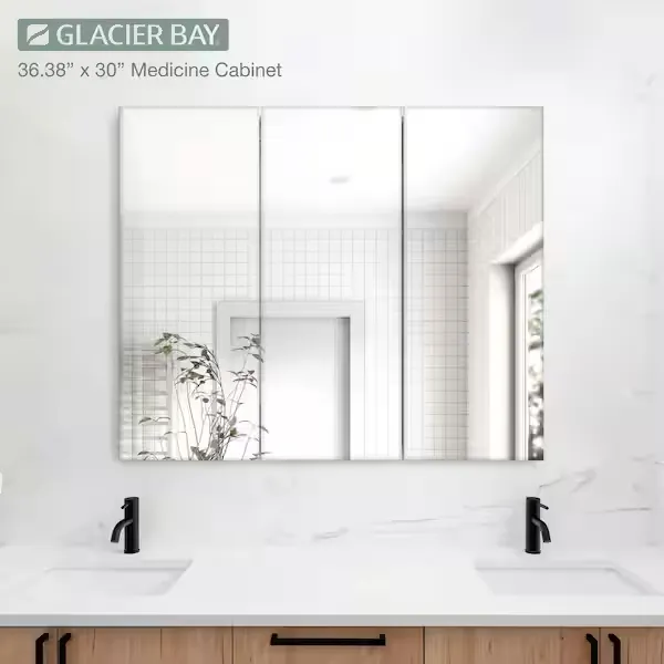 Add versatile storage and a clean aesthetic to your space with the Glacier Bay Rectangular Tri View Medicine Cabinet. Featuring a classic frameless design with elegantly beveled half inch edges, this piece effortlessly complements any modern or traditional decor. The innovative tri view mirror provides multiple viewing angles, enhancing both functionality and convenience for your daily routine. Inside the bright white cabinet, you will find two adjustable shelves supported by double shelf pegs, allowing you to quickly and easily customize the space to fit your toiletries. Designed for a simple surface mount installation, the unit also features a reversible middle door that can be set to open from either the left or the right based on your personal preference. Arriving fully assembled for your convenience, this durable cabinet is built to provide reliable storage for years to come. Browse our catalog to discover how this highly practical and stylish piece can complete your vanity setup.