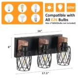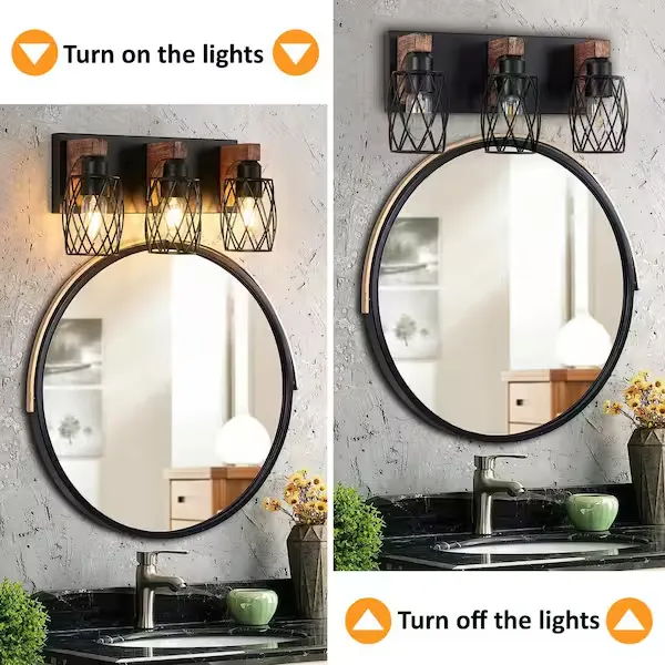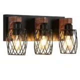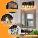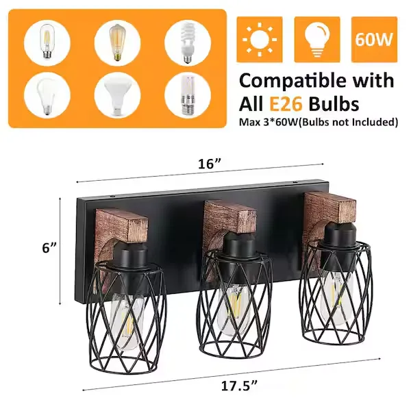 Elevate your space with the GMGSROM Vanity Light, beautifully blending industrial chic with natural warmth. This striking fixture pairs a sleek black metal frame with solid wood accents, delivering a uniquely edgy yet rustic charm. It features distinctive wire cage shades that offer an open, airy look, casting a cozy and practical glow across your bathroom, entryway, or hallway. Built with sturdy metal and real wood, the durable construction ensures long lasting stability for daily use while naturally resisting rust in damp environments. Compatible with standard E26 LED, incandescent, or energy saving bulbs, it offers easy customization for your lighting preferences. With all necessary mounting hardware included for a quick, hassle free setup, this dual style light effortlessly complements both modern and classic decor. Browse our catalog to discover how this trendy and versatile fixture can transform your home.