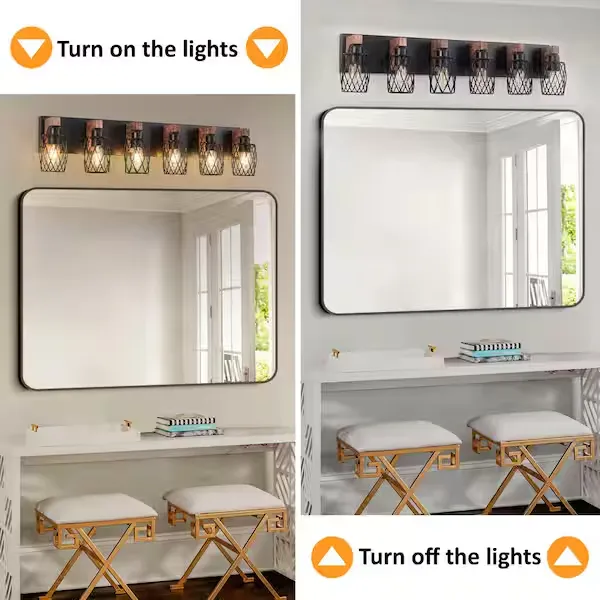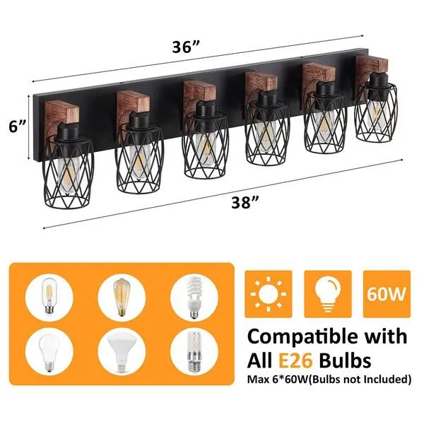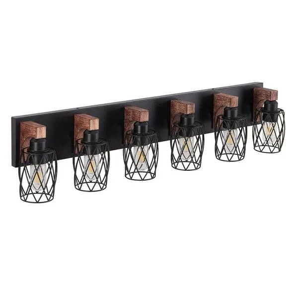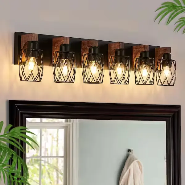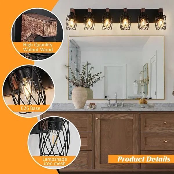 Elevate your space with the GMGSROM Vanity Light, beautifully blending industrial chic with natural warmth. This striking fixture pairs a sleek black metal frame with solid wood accents, delivering a uniquely edgy yet rustic charm. It features distinctive wire cage shades that offer an open, airy look, casting a cozy and practical glow across your bathroom, entryway, or hallway. Built with sturdy metal and real wood, the durable construction ensures long lasting stability for daily use while naturally resisting rust in damp environments. Compatible with standard E26 LED, incandescent, or energy saving bulbs, it offers easy customization for your lighting preferences. With all necessary mounting hardware included for a quick, hassle free setup, this dual style light effortlessly complements both modern and classic decor. Browse our catalog to discover how this trendy and versatile fixture can transform your home.