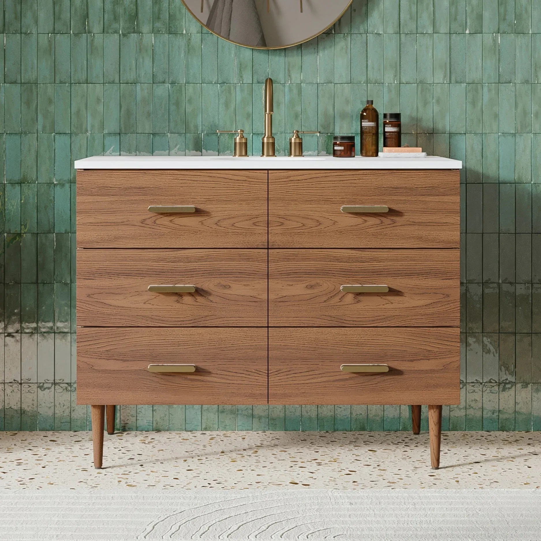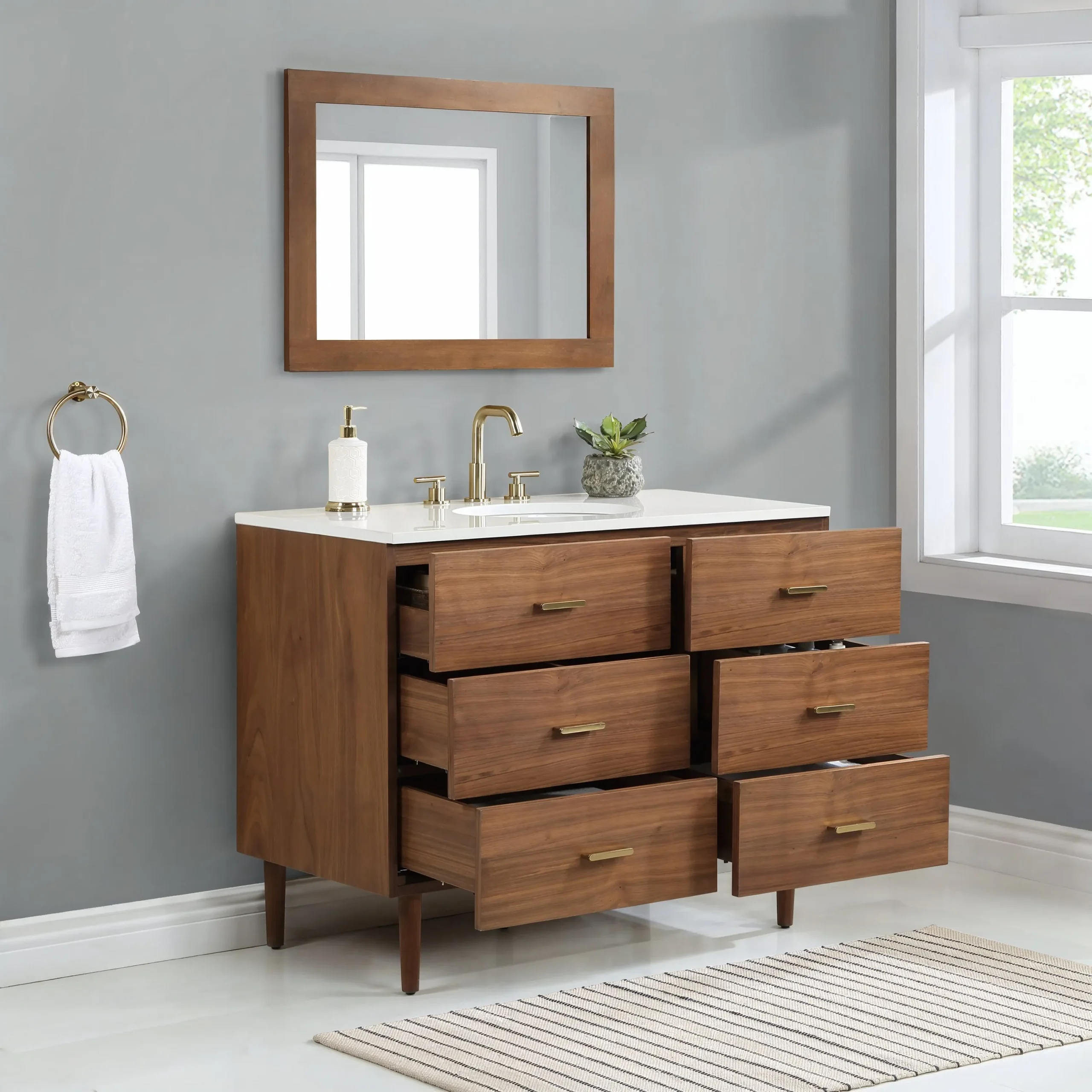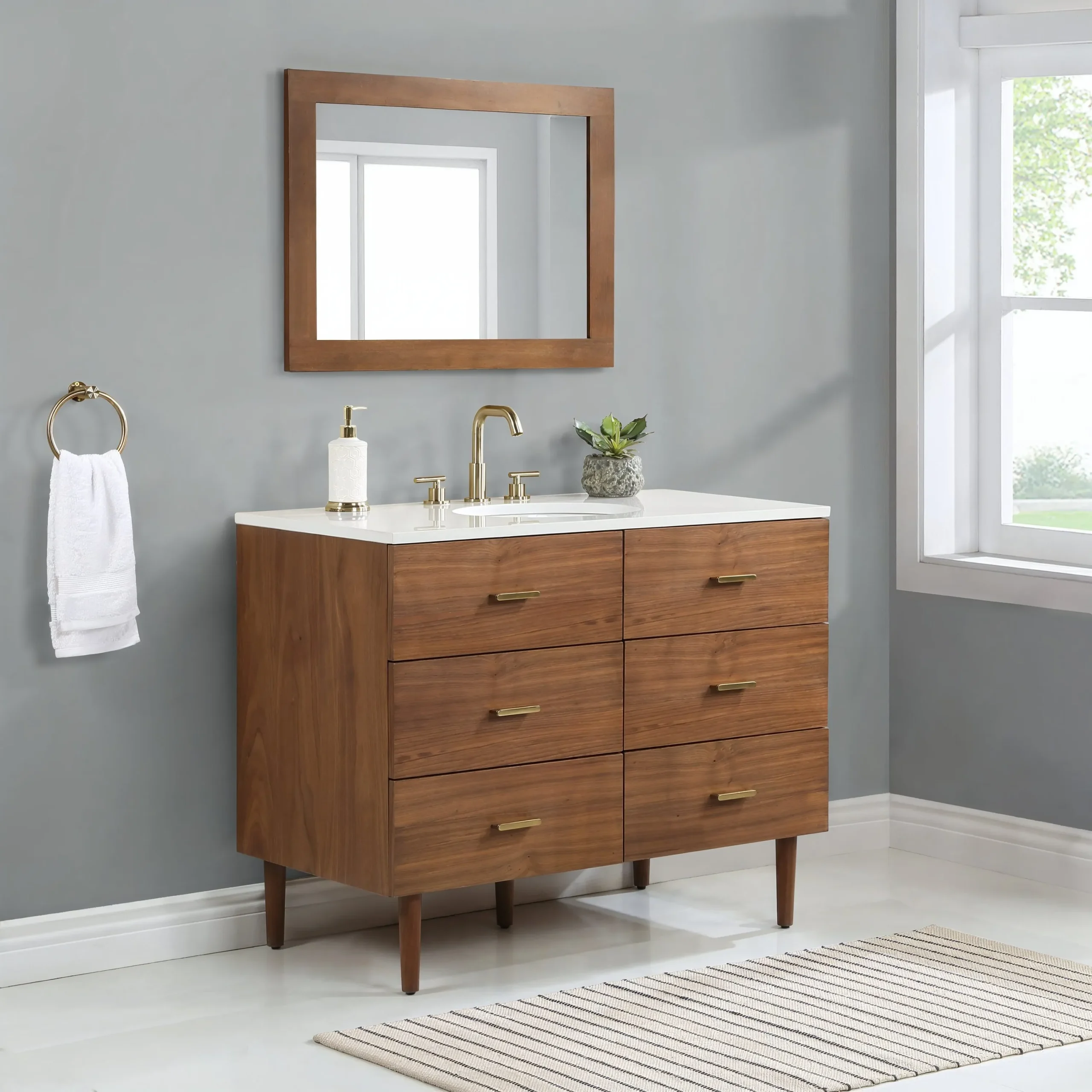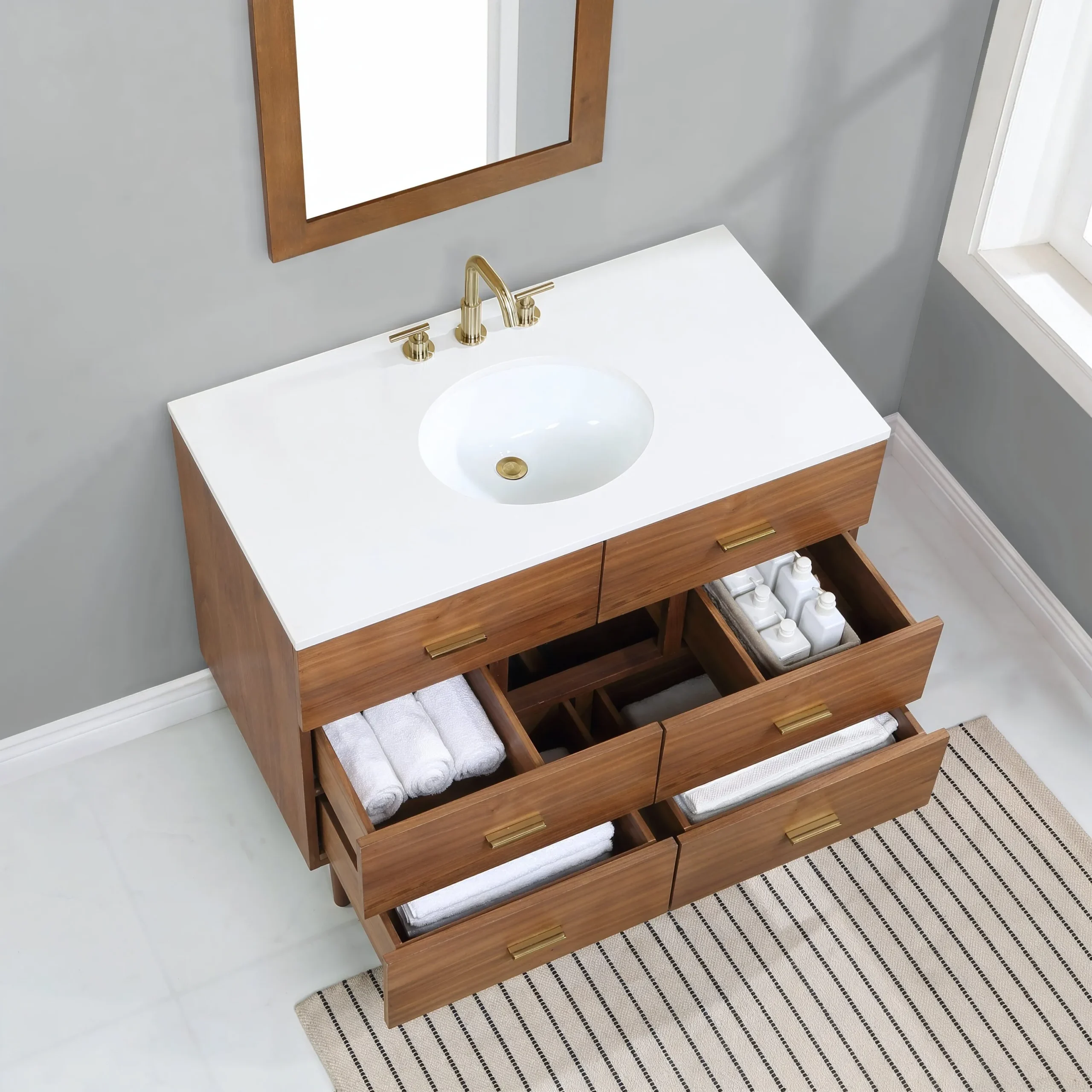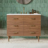 Embrace luxurious mornings and evenings with the Highbury Furnishings Haoqi Bathroom Vanity collection. Designed to create a spa like retreat right in your own home, this freestanding vanity features a solid wood frame finished with elegant real walnut veneers. It is crowned with a sleek matte white quartz countertop and includes an easy to clean ceramic undermount oval sink. With an array of sizes to choose from, ranging from a 36 inch single sink for standard bathrooms to an expansive 72 inch double vanity for a grand master suite, this collection easily adapts to your specific layout needs. To ensure tranquility and keep your essentials perfectly organized, the vanity is equipped with dovetail drawers featuring soft close undermount slides and brushed gold hardware. Browse our catalog to discover how this beautiful piece can make your next bathroom renovation a haven of peace and harmony.
