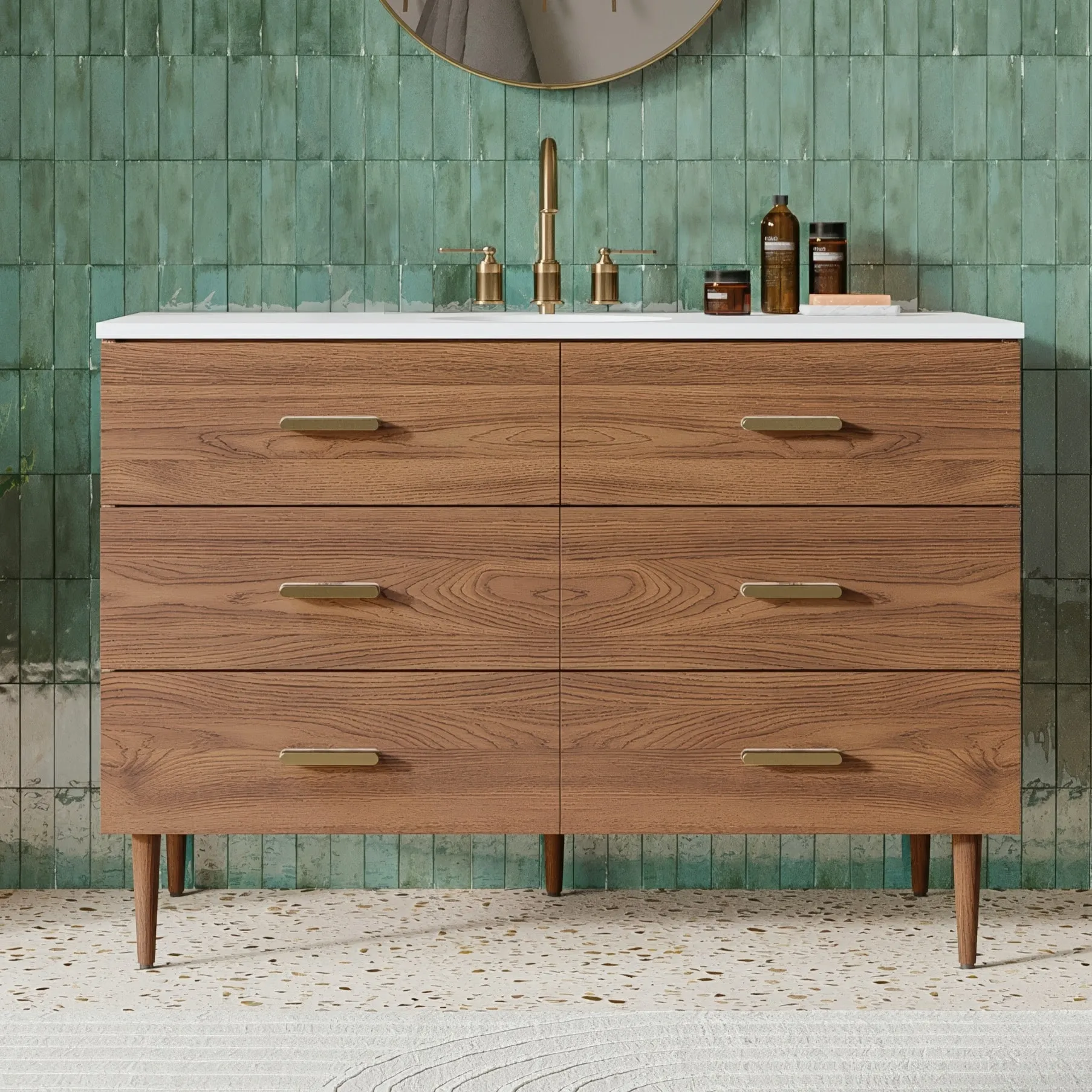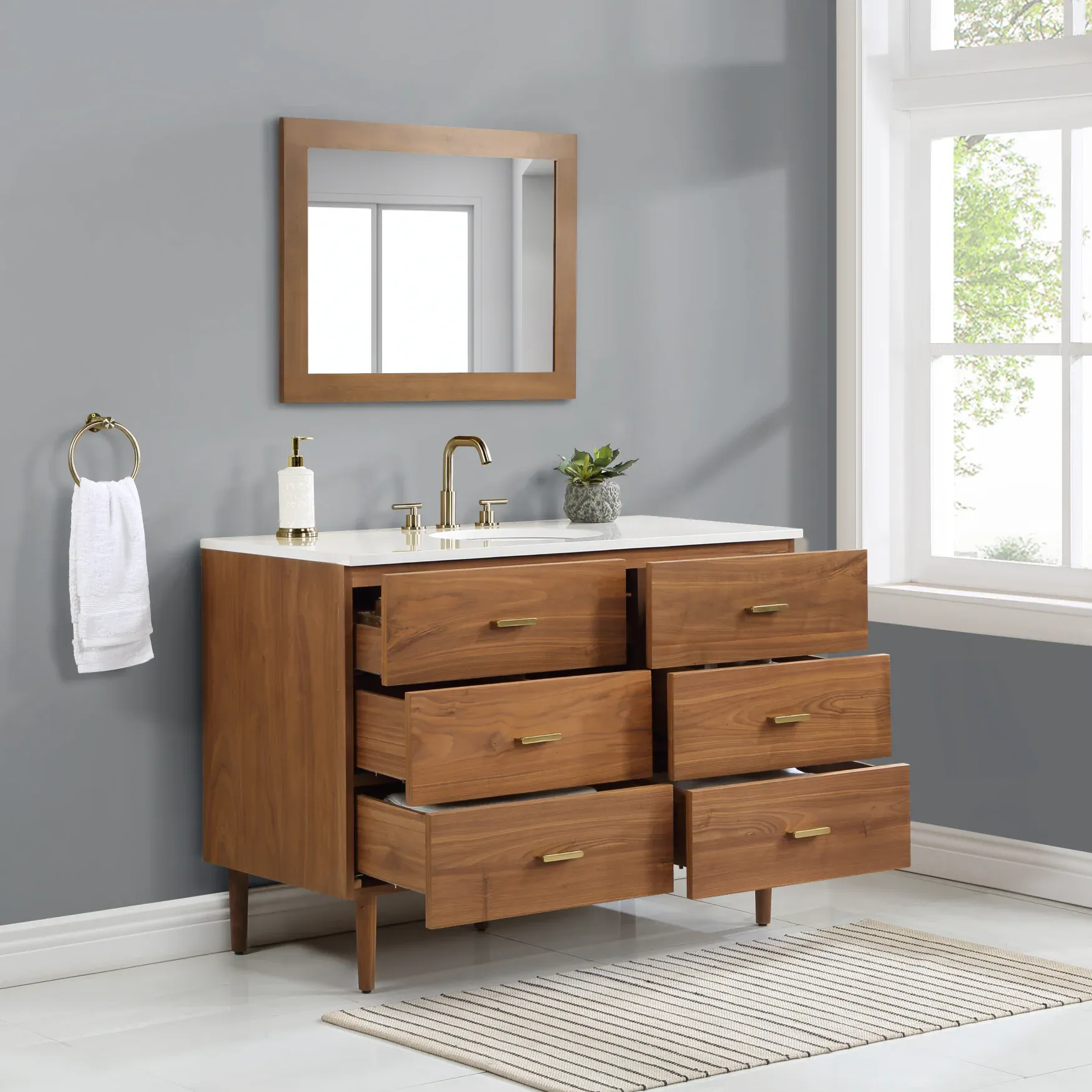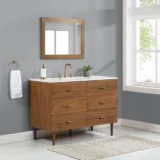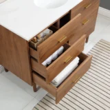Embrace luxurious mornings and evenings with the Highbury Furnishings Haoqi Bathroom Vanity collection. Designed to create a spa like retreat right in your own home, this freestanding vanity features a solid wood frame finished with elegant real walnut veneers. It is crowned with a sleek matte white quartz countertop and includes an easy to clean ceramic undermount oval sink. With an array of sizes to choose from, ranging from a 36 inch single sink for standard bathrooms to an expansive 72 inch double vanity for a grand master suite, this collection easily adapts to your specific layout needs. To ensure tranquility and keep your essentials perfectly organized, the vanity is equipped with dovetail drawers featuring soft close undermount slides and brushed gold hardware. Browse our catalog to discover how this beautiful piece can make your next bathroom renovation a haven of peace and harmony.