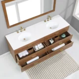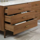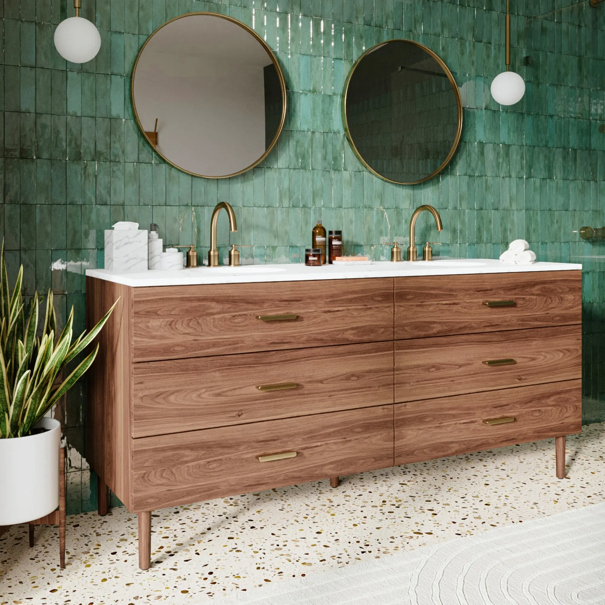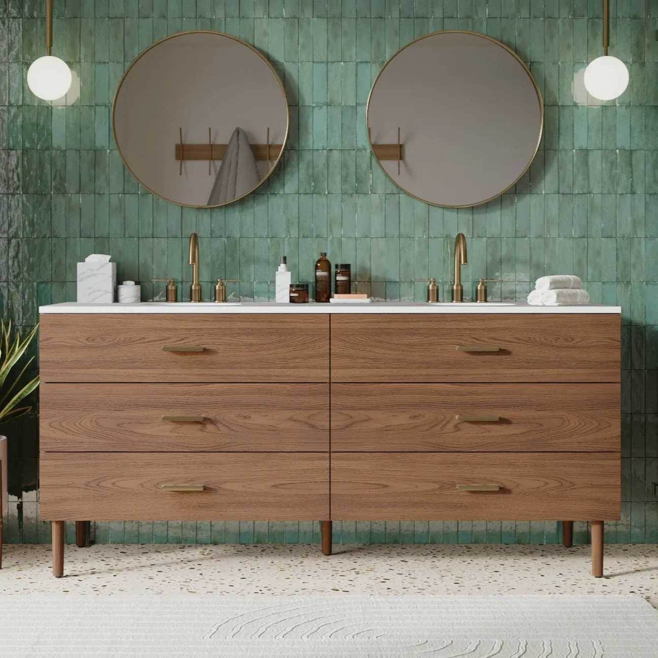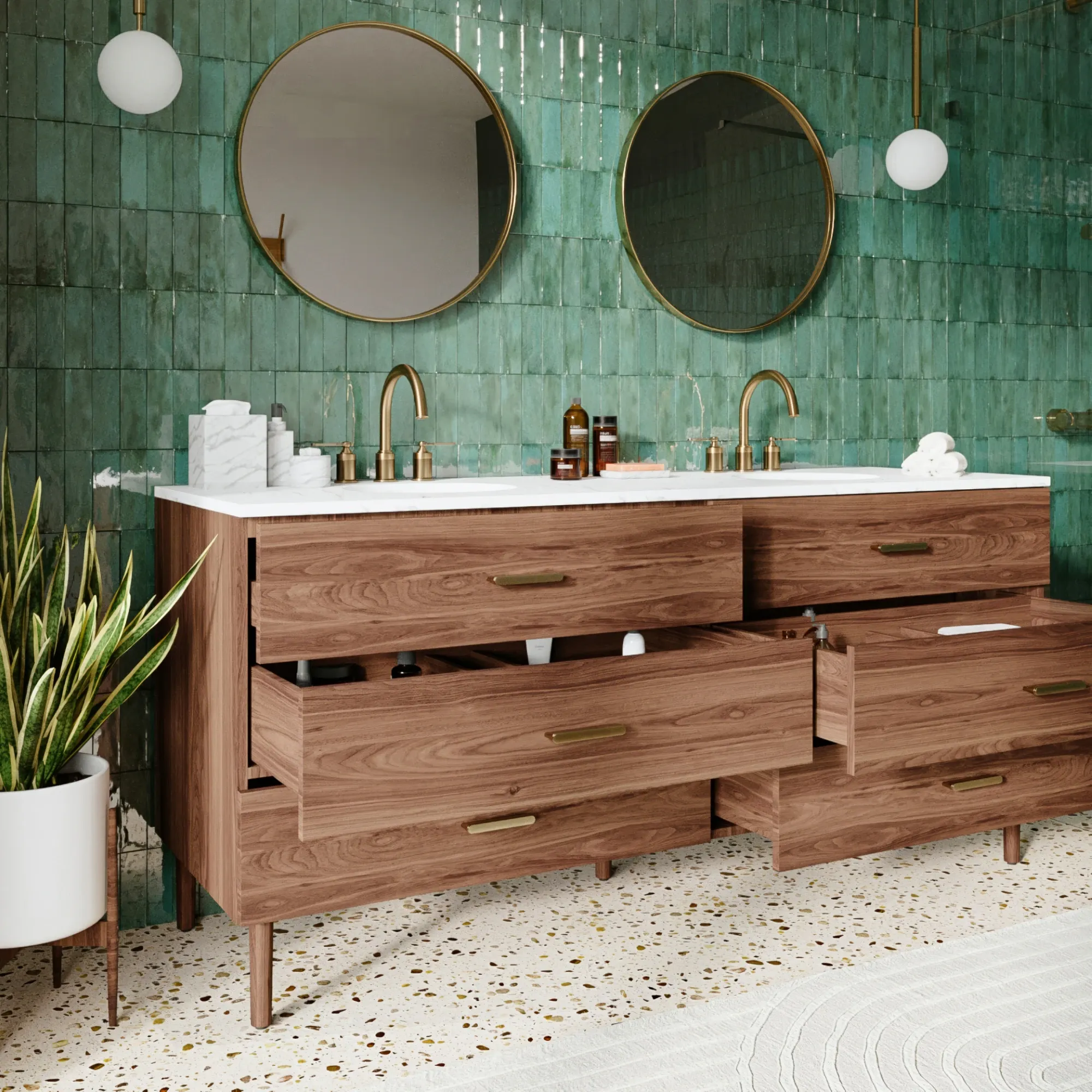 Embrace luxurious mornings and evenings with the Highbury Furnishings Haoqi Bathroom Vanity collection. Designed to create a spa like retreat right in your own home, this freestanding vanity features a solid wood frame finished with elegant real walnut veneers. It is crowned with a sleek matte white quartz countertop and includes an easy to clean ceramic undermount oval sink. With an array of sizes to choose from, ranging from a 36 inch single sink for standard bathrooms to an expansive 72 inch double vanity for a grand master suite, this collection easily adapts to your specific layout needs. To ensure tranquility and keep your essentials perfectly organized, the vanity is equipped with dovetail drawers featuring soft close undermount slides and brushed gold hardware. Browse our catalog to discover how this beautiful piece can make your next bathroom renovation a haven of peace and harmony.
