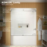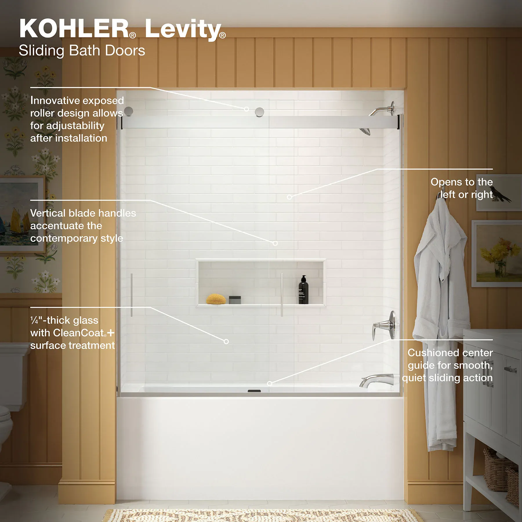 Elevate your bathroom with the sleek, contemporary style of the KOHLER Levity Frameless Bypass Sliding Bathtub Door. This innovative tub door features a unique bypass system and an exposed roller design, providing an amazingly smooth and quiet sliding action that you can feel every time you use it. Crafted with premium 1/4-inch (6 mm) thick Crystal Clear tempered glass, it offers reliable safety and a minimalist aesthetic that makes your space feel open and inviting. The glass is treated with CleanCoat+ technology, a hydrophobic barrier that effectively repels water, soap scum, and residue for practically effortless maintenance. Complemented by vertical blade handles and rust-resistant anodized aluminum hardware, this door is built to last. The clever fully bypassable panels allow for easy installation, offering convenient out-of-plumb adjustability and the flexibility to open from the left or right side to perfectly suit your layout. Browse our catalog to see how this elegant bathtub door can modernize your daily routine.