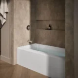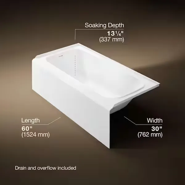 Defined by crisp lines and a clean, simple aesthetic, the KOHLER Paces Alcove Bath seamlessly complements a wide range of modern and traditional designs. Crafted from durable acrylic, this rectangular bathtub features a low step-over apron height that allows for exceptionally easy entry and exit, while its integral apron creates a polished, finished look. The integrated slotted overflow paired with the included color-matched toe-tap drain allows for a deep, 13.25-inch soaking experience. Designed for ultimate relaxation, the tub is contoured with integral sloped lumbar support and a raised neck rest to cradle your body as you unwind. Finished with a subtly textured bottom surface for added safety and style, the Paces bathtub simplifies installation while delivering an incredibly comfortable and spa-like bathing experience right in your home. Browse our catalog to discover how this elegant soaking tub can beautifully complete your bathroom renovation.