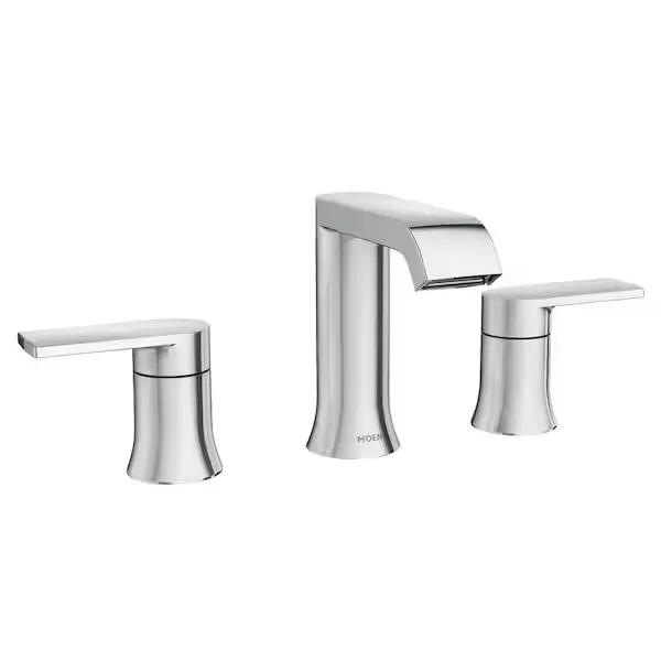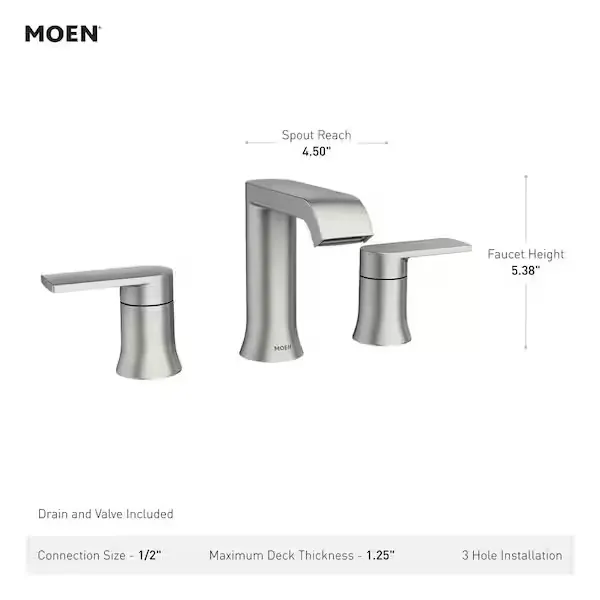 Elevate your bathroom remodel with the MOEN Genta Widespread Bathroom Faucet, a stunning blend of contemporary curved edges and substantial style. Built to withstand real world wear and tear, this double handle faucet delivers an ageless yet fashion forward presence that easily complements modern spaces. It is engineered with the innovative Duralock quick connect system for a hassle free and smooth installation, perfectly fitting 3 hole widespread configurations with handles that can be placed at any distance between 8 and 16 inches. The fixture includes a pop up drain that eliminates the need for a lift rod, creating a cleaner, more streamlined look on your vanity. As an EPA WaterSense certified product, it delivers a highly efficient 1.2 gallons per minute to conserve water without sacrificing performance. Every drop is also certified safe, complying with the Federal Safe Drinking Water Act. Available in versatile finishes like Matte Black, Chrome, and Brushed Nickel. Browse our catalog to explore how this lustrous fixture can bring a sleek and balanced feel to your home.