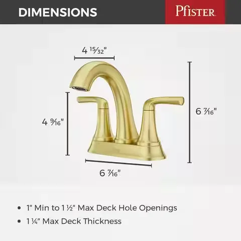 Upgrade your bathroom remodel with the Pfister Ladera Centerset Bathroom Faucet, a beautiful fixture that perfectly blends transitional style with everyday functionality. Engineered to maintain its brilliant shine, this double handle faucet features a Spot Defense Brushed Nickel finish that actively resists water spots and fingerprints for incredibly easy cleaning. The high quality ceramic disc valve technology ensures a lifetime of drip free and reliable performance. As a WaterSense certified product, it uses a highly efficient 1.2 gallons per minute to help you save water while delivering a strong and consistent flow. Designed for quick and easy installation in a standard 3 hole configuration, this set also includes an innovative Push and Seal drain that seals tightly every time. Available in a variety of versatile finishes including Spot Defense Brushed Nickel, Brushed Gold, Polished Chrome, and Tuscan Bronze. Browse our catalog to explore how this elegant and durable faucet can complete your next bathroom update.