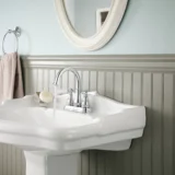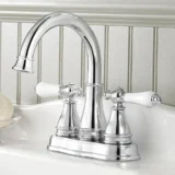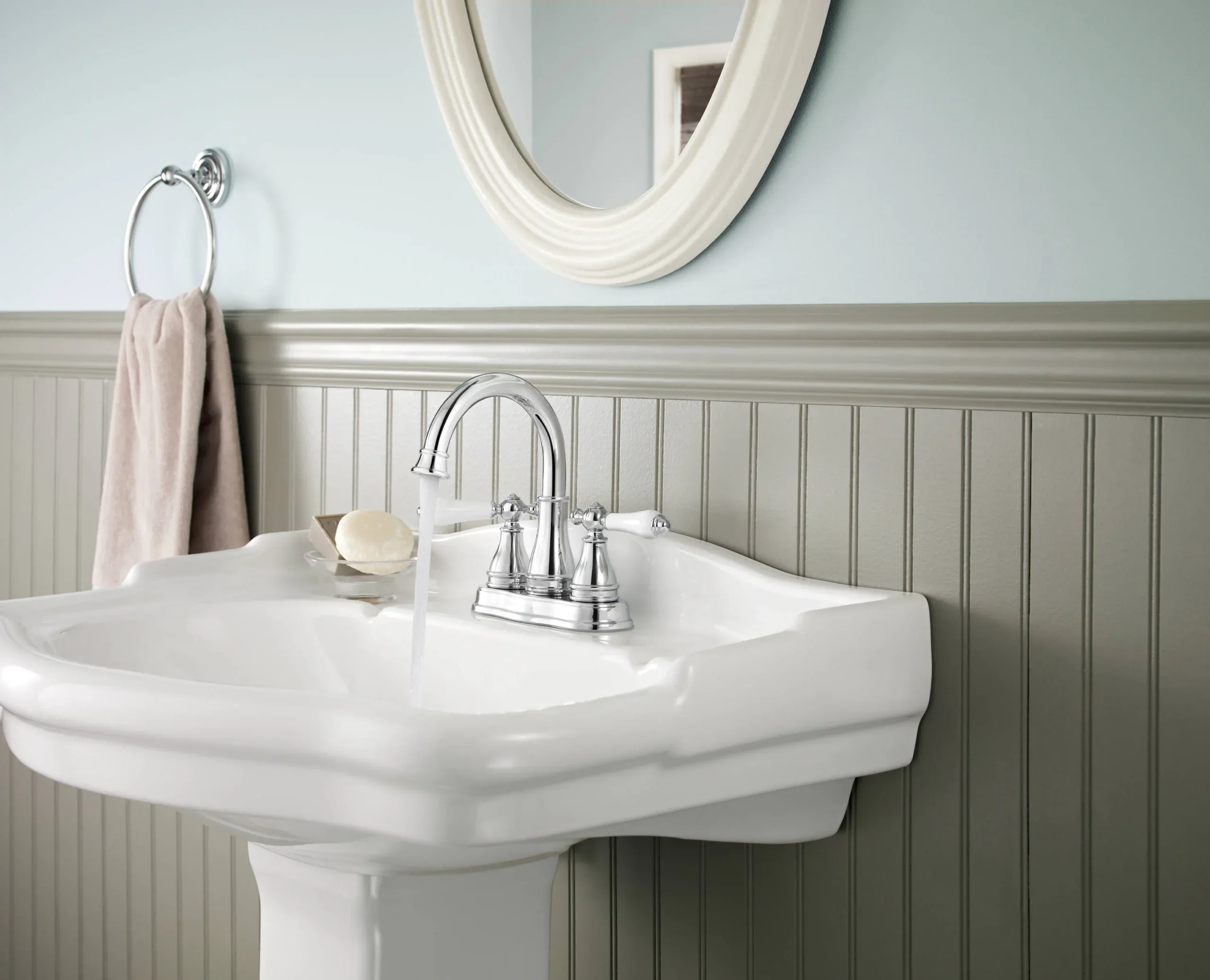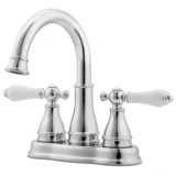 Add a touch of timeless charm to your bathroom remodel with the Pfister Sonterra Centerset Bathroom Sink Faucet. This traditional fixture offers an elegant, antique look complete with two white ceramic lever handles that swivel smoothly for easy temperature control. Designed for convenience, the high arc spout rotates a full 360 degrees, providing ample space for washing hands or filling a flower vase. Engineered with Pforever Seal advanced ceramic disc valve technology, this faucet guarantees a lifetime of reliable, never leak performance. It is an EPA WaterSense certified product, delivering a highly efficient 1.2 gallons per minute to help conserve water without compromising flow. Designed for a standard 3 hole installation, the set includes an easy to use Push and Seal drain that requires no tools and guarantees a tight seal every single time. Browse our catalog to discover how this classic and dependable faucet can beautifully complete your next vanity update.