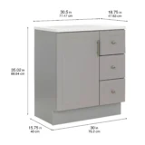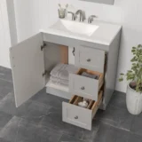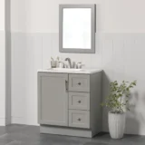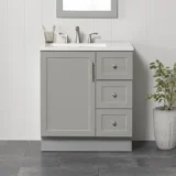 Refresh your space with the Project Source Davies Bathroom Vanity collection, a highly practical choice offering dependable style and reliable quality. Built for daily use, this vanity collection provides a simple and effective way to upgrade any bathroom remodel project. The durable engineered wood base features clean lines and comes paired with a soft white cultured marble top containing an easy to clean integrated rectangular sink. Choose from an array of beautiful finishes including Light Gray, True White, and Beige Oak to perfectly match your aesthetic. Ranging in size from a compact 24 inch model to a spacious 36 inch option, these freestanding vanities fit exceptionally well in half baths, guest bathrooms, or smaller master suites. Designed for functionality, the collection includes full overlay recessed panel doors and full extension drawers for generous storage, all beautifully accented by satin nickel hardware. Browse our catalog to explore the sizes and finishes that will seamlessly complete your next home renovation.