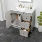 Refresh your space with the Project Source Davies Bathroom Vanity collection, a highly practical choice offering dependable style and reliable quality. Built for daily use, this vanity collection provides a simple and effective way to upgrade any bathroom remodel project. The durable engineered wood base features clean lines and comes paired with a soft white cultured marble top containing an easy to clean integrated rectangular sink. Choose from an array of beautiful finishes including Light Gray, True White, and Beige Oak to perfectly match your aesthetic. Ranging in size from a compact 24 inch model to a spacious 36 inch option, these freestanding vanities fit exceptionally well in half baths, guest bathrooms, or smaller master suites. Designed for functionality, the collection includes full overlay recessed panel doors and full extension drawers for generous storage, all beautifully accented by satin nickel hardware. Browse our catalog to explore the sizes and finishes that will seamlessly complete your next home renovation.