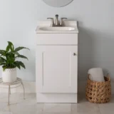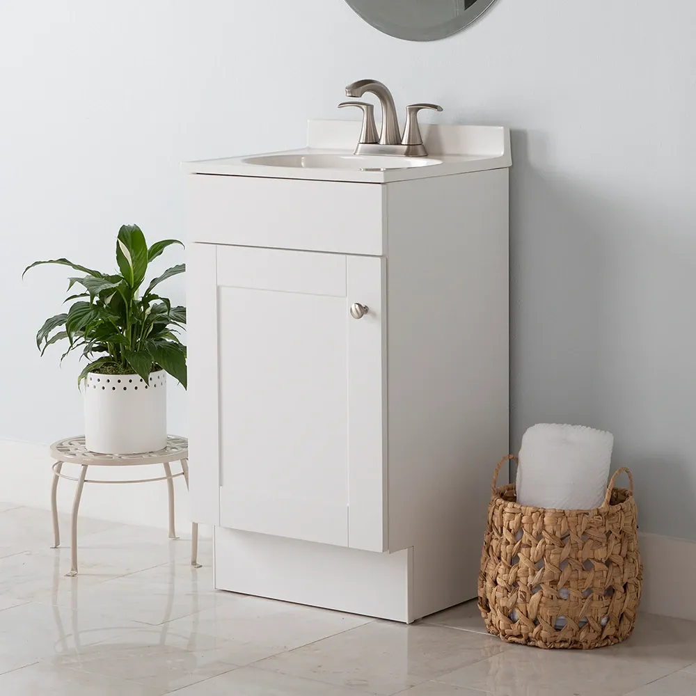 Refresh your space with the Project Source Dover Bathroom Vanity collection, a dependable and highly functional choice for your next home remodel. Built for daily use, this freestanding vanity combines straightforward style with reliable quality to easily upgrade any bathroom. The durable engineered wood base features a full overlay recessed panel door accented by stylish brushed nickel hardware. It is topped with a soft white cultured marble surface that includes an easy to clean integrated oval sink. Ranging in size from a space saving 18 inch model perfectly suited for powder rooms and half baths, all the way up to a 30 inch vanity for larger spaces, the Dover collection adapts to your specific needs. Available in a selection of versatile finishes including crisp True White, Light Gray, and Navy Blue. Browse our catalog to discover the ideal size and color to complete your bathroom renovation project.