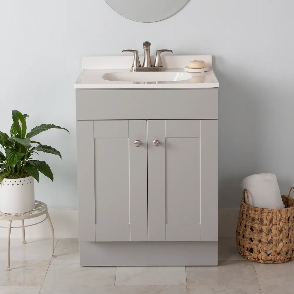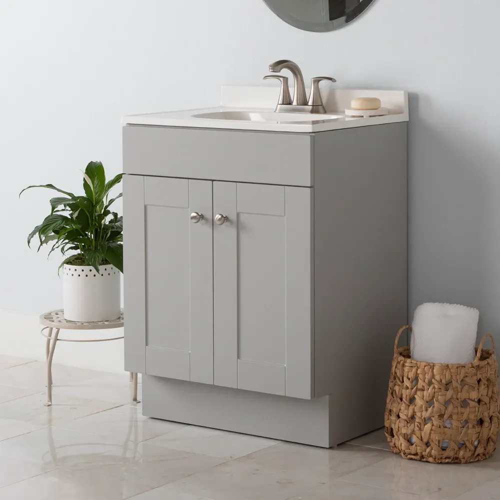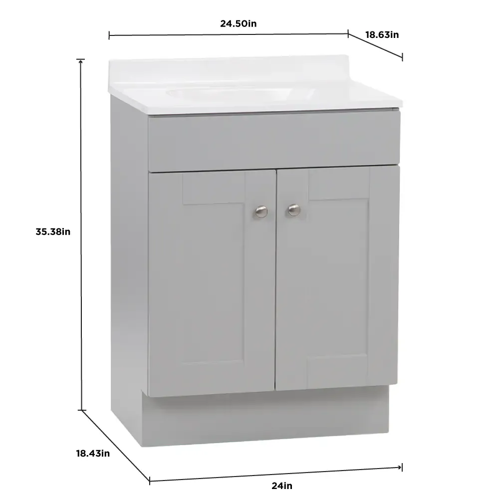 Refresh your space with the Project Source Dover Bathroom Vanity collection, a dependable and highly functional choice for your next home remodel. Built for daily use, this freestanding vanity combines straightforward style with reliable quality to easily upgrade any bathroom. The durable engineered wood base features a full overlay recessed panel door accented by stylish brushed nickel hardware. It is topped with a soft white cultured marble surface that includes an easy to clean integrated oval sink. Ranging in size from a space saving 18 inch model perfectly suited for powder rooms and half baths, all the way up to a 30 inch vanity for larger spaces, the Dover collection adapts to your specific needs. Available in a selection of versatile finishes including crisp True White, Light Gray, and Navy Blue. Browse our catalog to discover the ideal size and color to complete your bathroom renovation project.