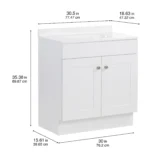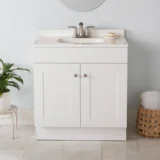 Refresh your space with the Project Source Dover Bathroom Vanity collection, a dependable and highly functional choice for your next home remodel. Built for daily use, this freestanding vanity combines straightforward style with reliable quality to easily upgrade any bathroom. The durable engineered wood base features a full overlay recessed panel door accented by stylish brushed nickel hardware. It is topped with a soft white cultured marble surface that includes an easy to clean integrated oval sink. Ranging in size from a space saving 18 inch model perfectly suited for powder rooms and half baths, all the way up to a 30 inch vanity for larger spaces, the Dover collection adapts to your specific needs. Available in a selection of versatile finishes including crisp True White, Light Gray, and Navy Blue. Browse our catalog to discover the ideal size and color to complete your bathroom renovation project.