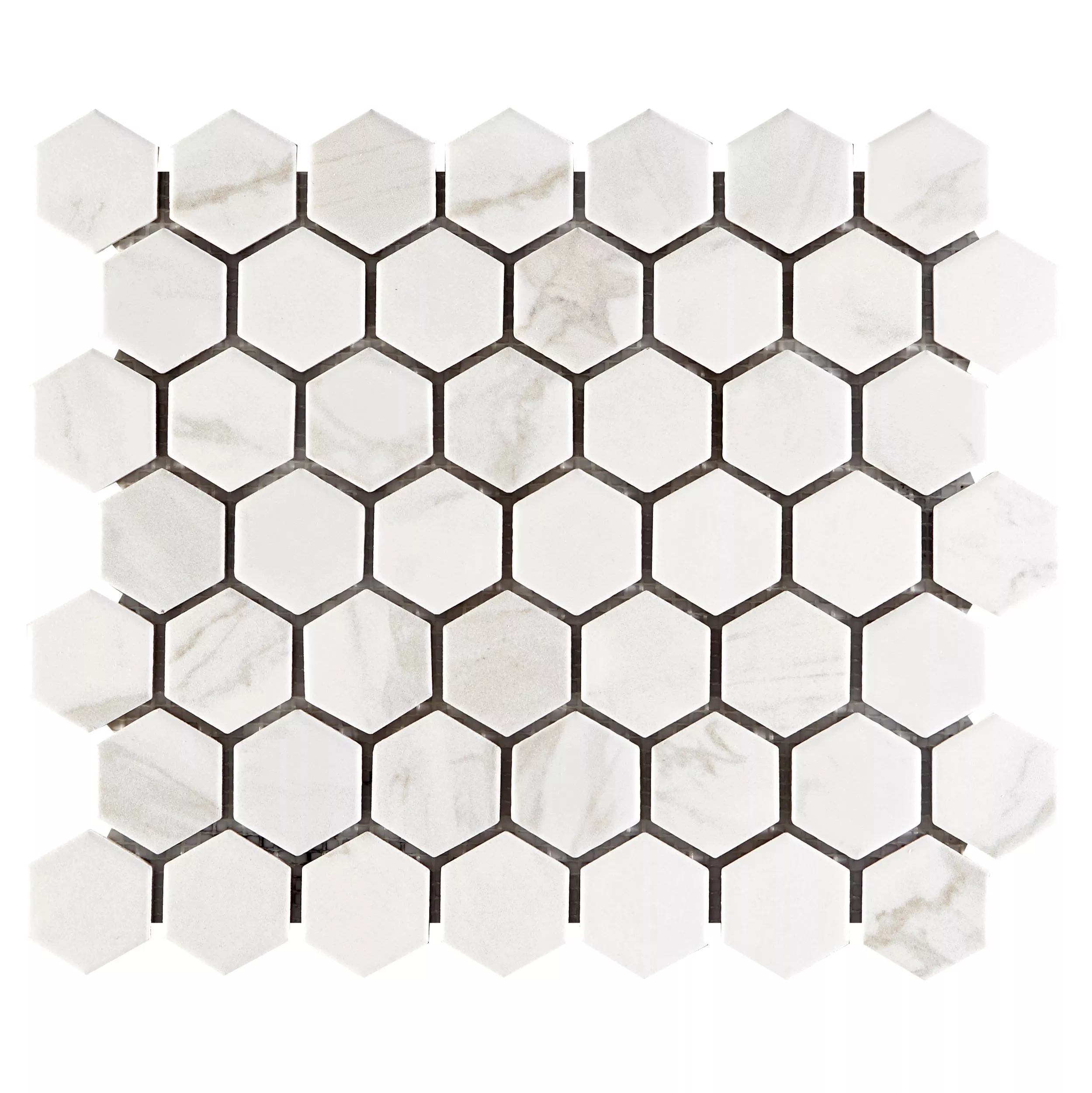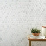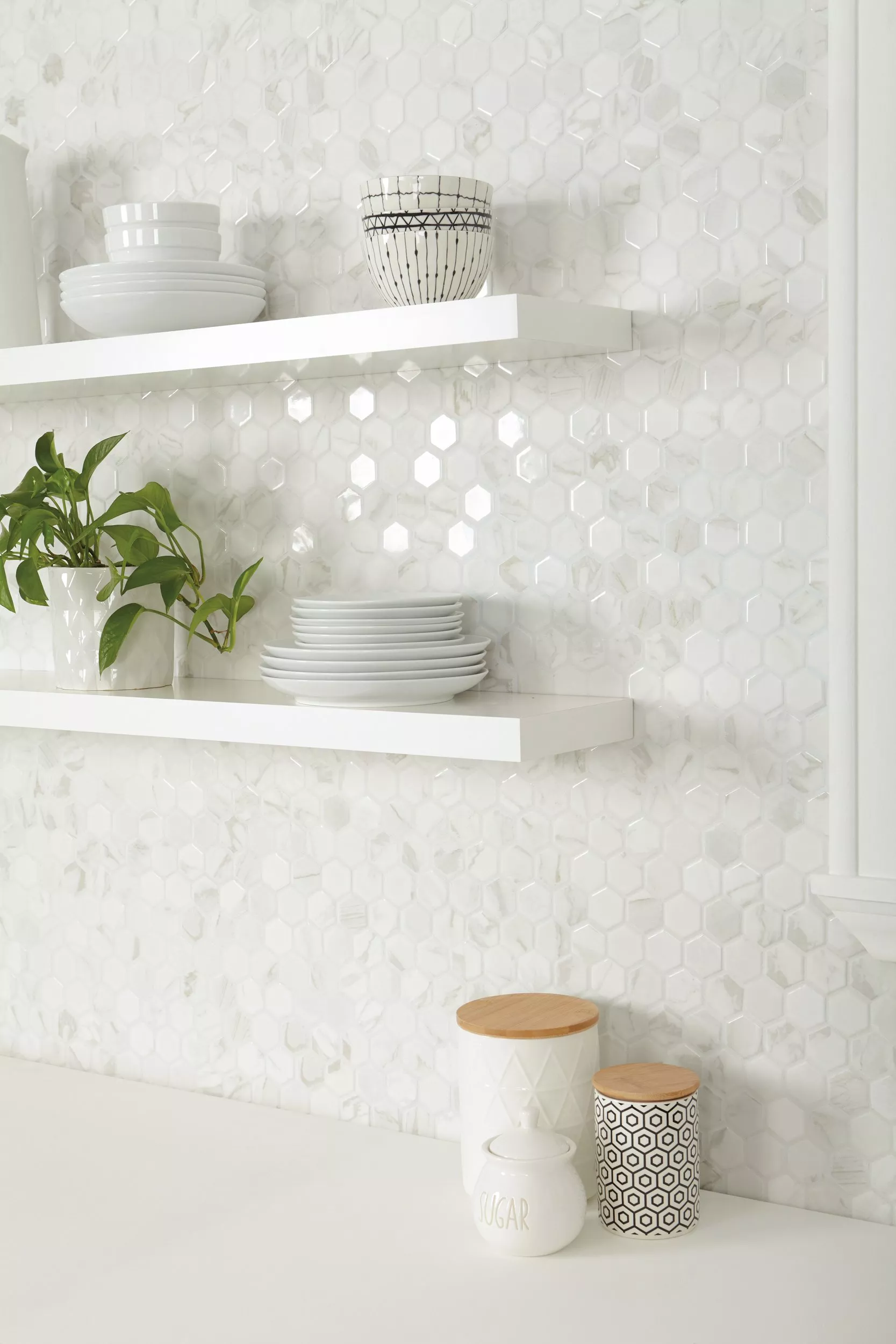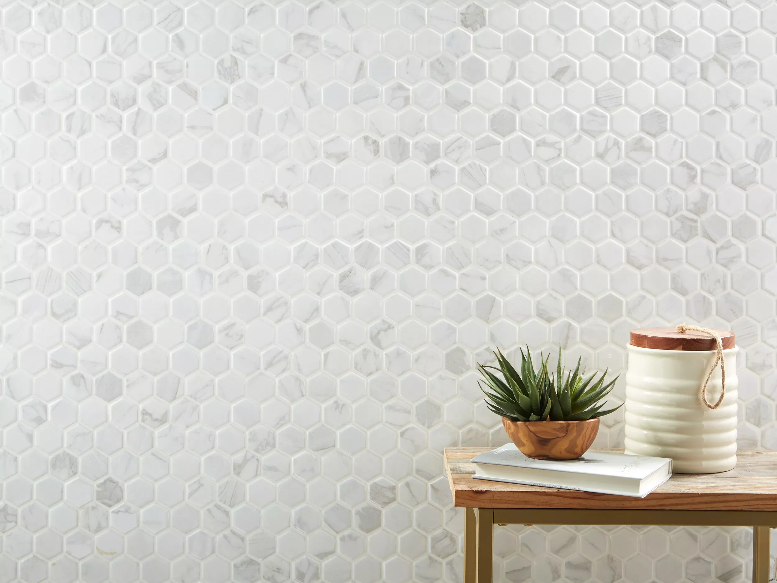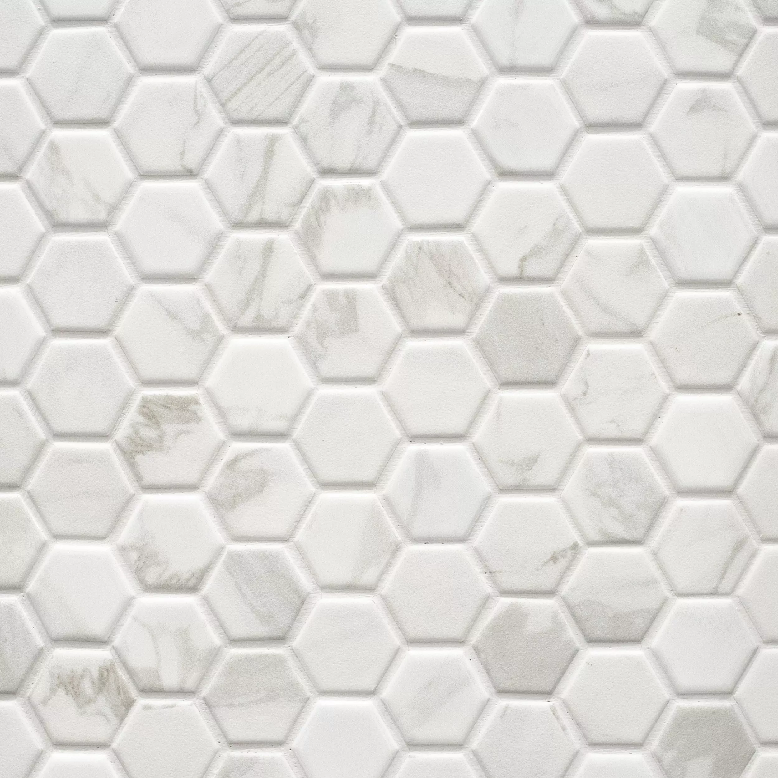 Enhance your home with the timeless beauty of the Marble Art Hexagon Ceramic Mosaic. This 12 x 12 tile features 1.5-inch hexagon chips with a realistic white marble look and subtle gray veining, offering a classic aesthetic with a modern twist. The high-gloss finish creates a bright, reflective surface that adds depth to any room. Crafted from durable ceramic, this water-resistant mosaic is an excellent choice for kitchen backsplashes, shower walls, and bathroom floors, providing a stylish and easy-to-maintain solution for your design projects.