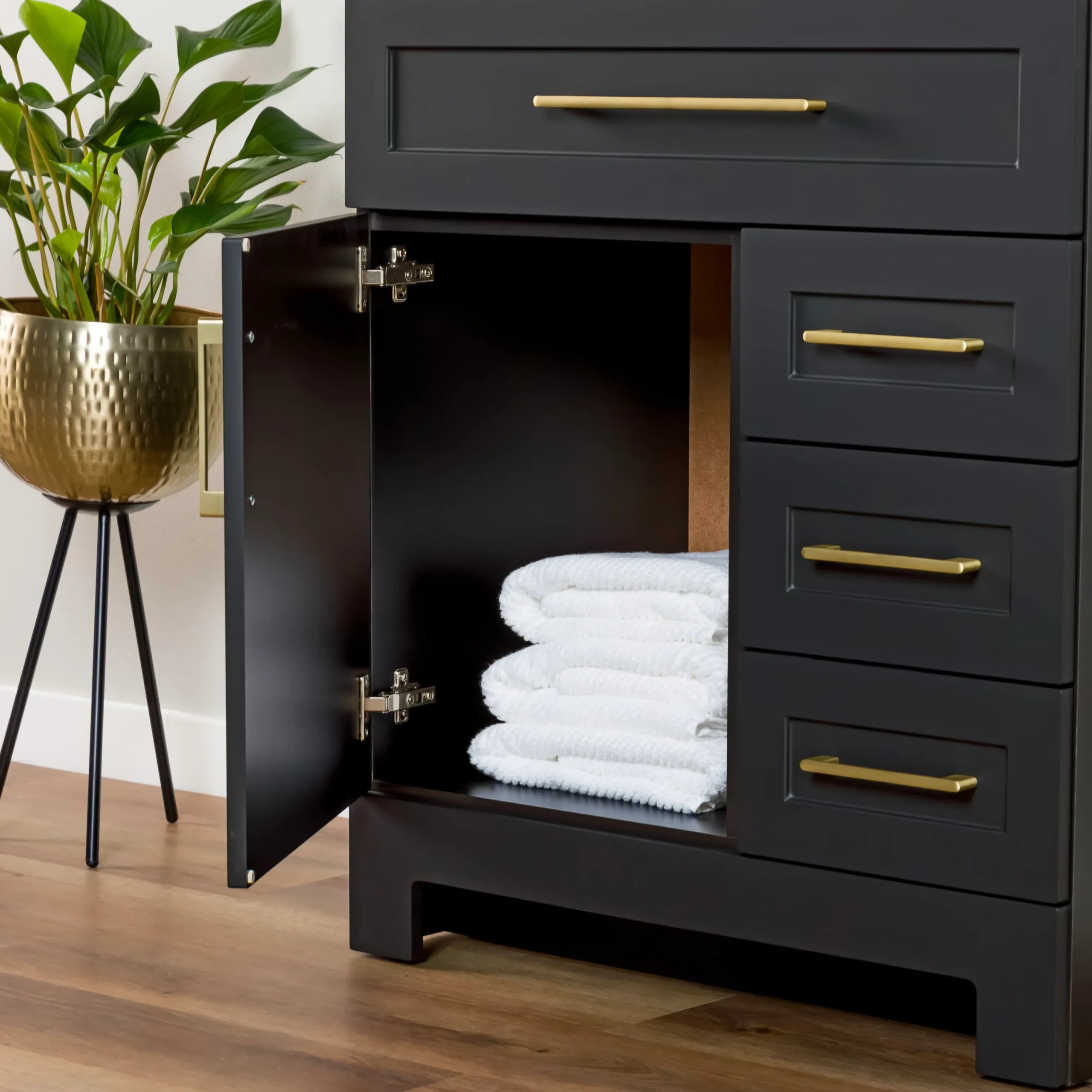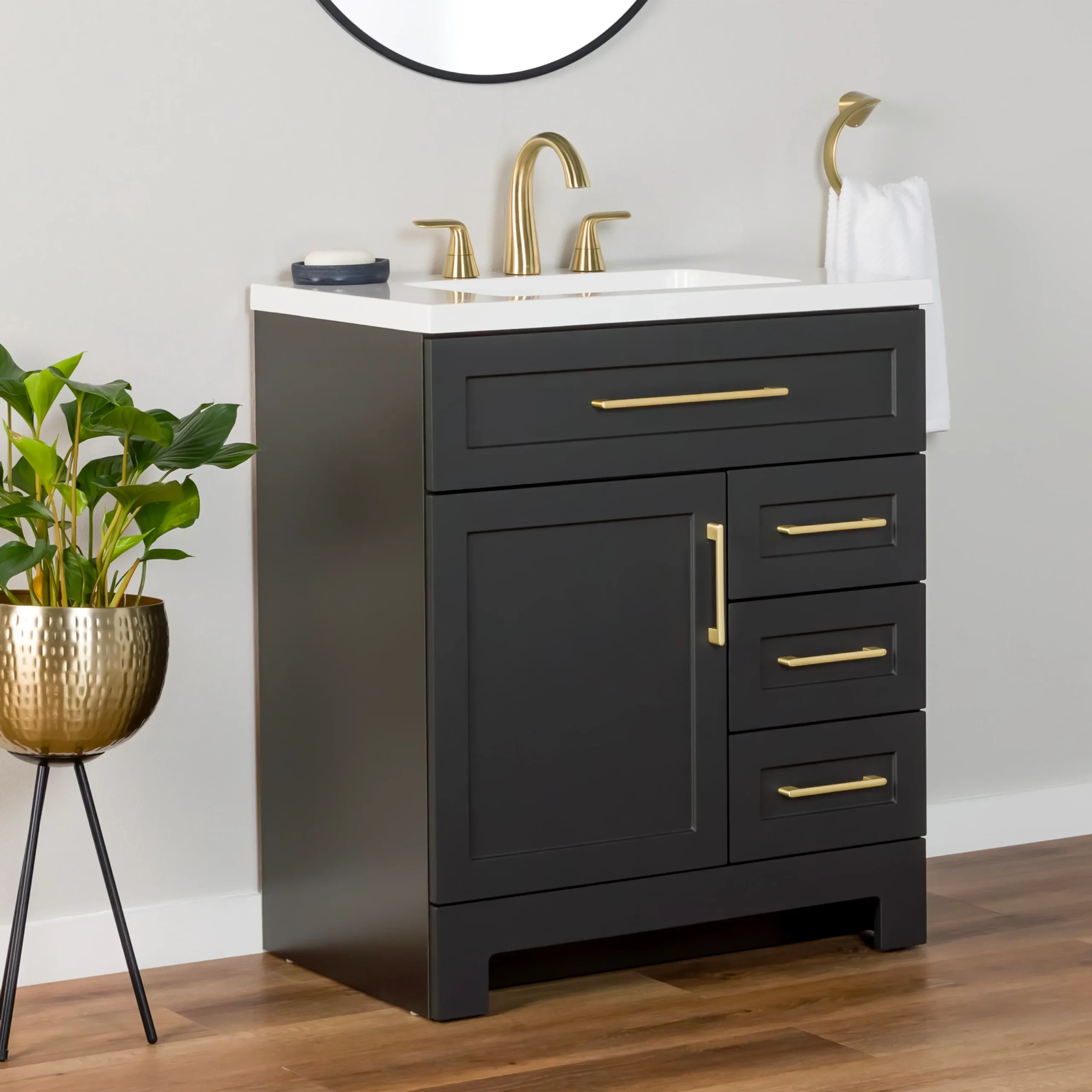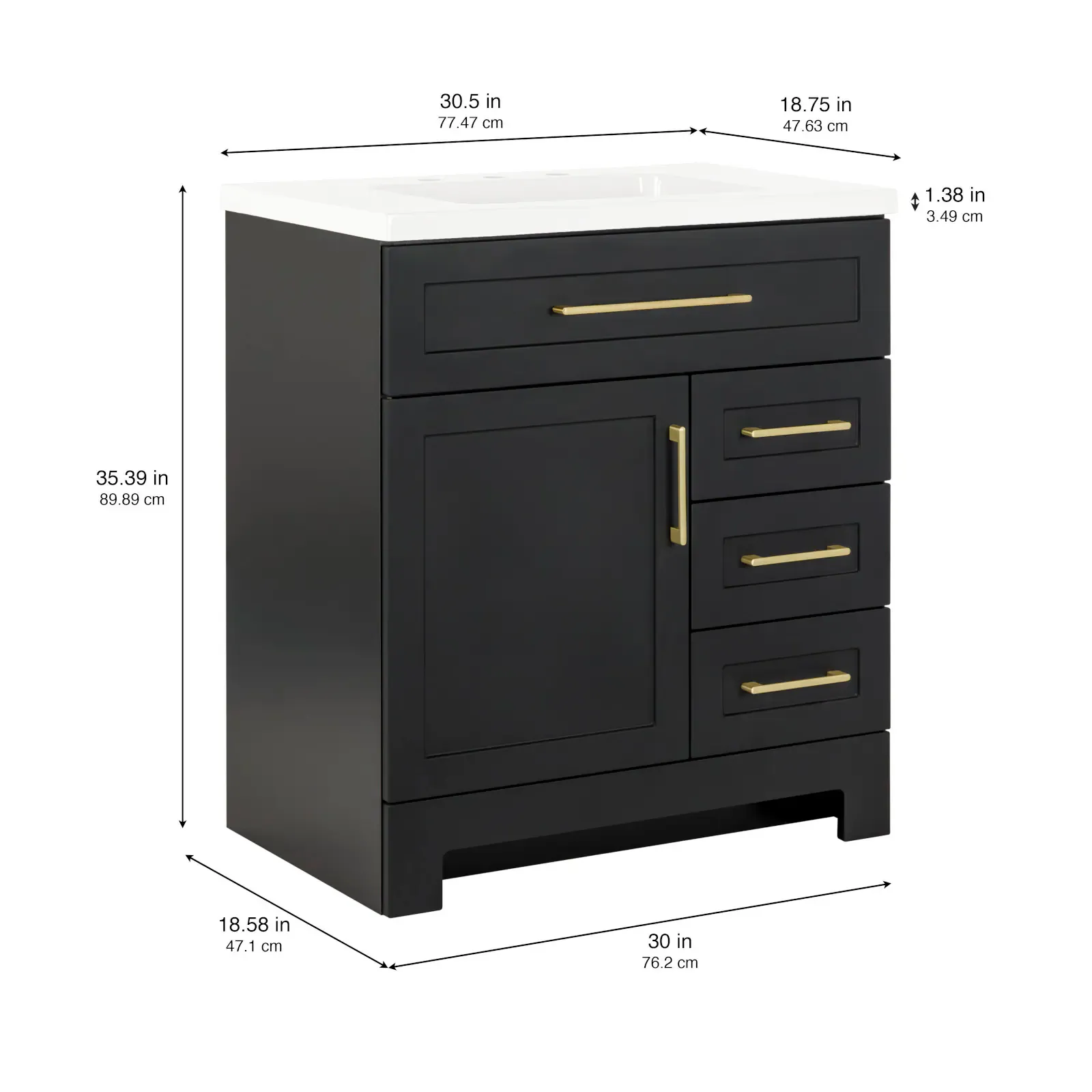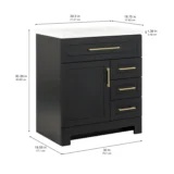 Elevate your bathroom remodel with the Style Selections Cauley Bathroom Vanity collection, a highly functional and durable choice for your home renovation. Built for daily use, this freestanding vanity combines a clean modern aesthetic with reliable construction. The sturdy engineered wood base features full overlay shaker style doors and is perfectly accented by matte black or bold gold hardware. It is topped with a beautiful white cultured marble surface that includes an easy to clean integrated rectangular sink. Available in a space saving 30 inch model for half baths, all the way up to an expansive 48 inch vanity for a larger master suite, the Cauley collection easily adapts to your specific layout. Choose from versatile finishes like crisp True White, Black and Navy Blue to match your exact style. Designed to maximize organization, the collection includes soft close cabinets and full extension drawers to keep your essentials neatly tucked away. Browse our catalog to discover the ideal size and color to complete your bathroom transformation.