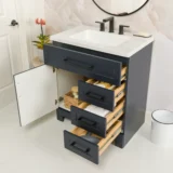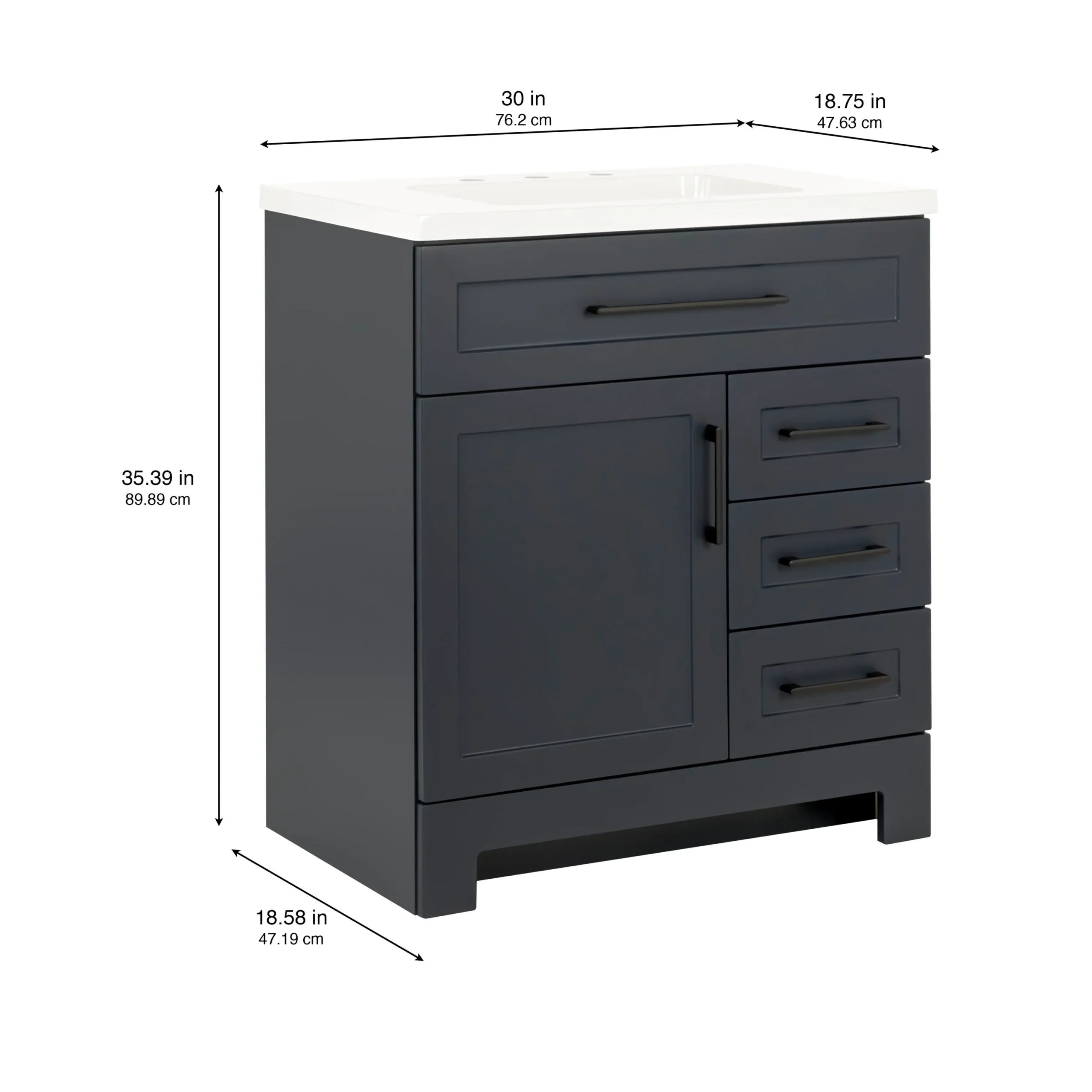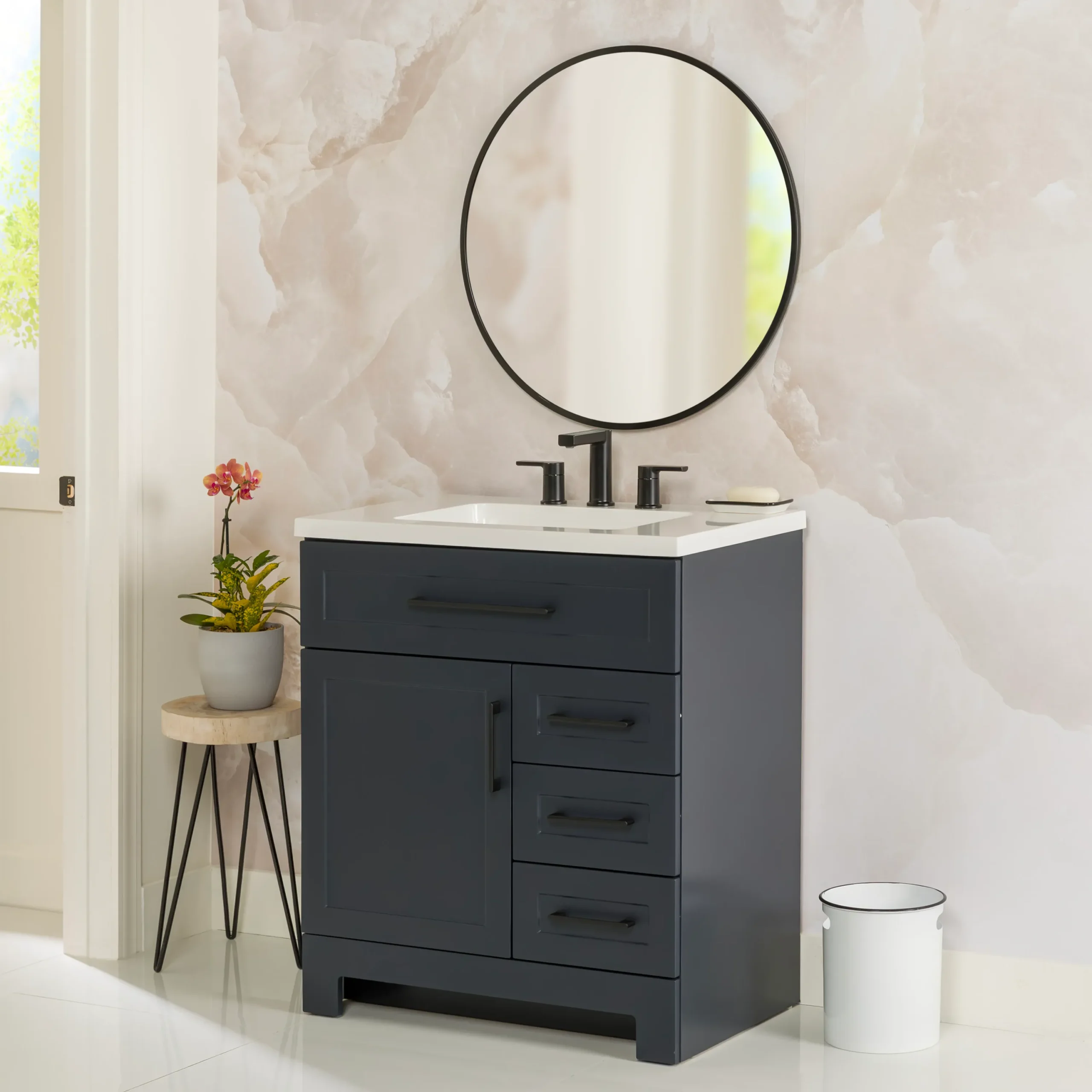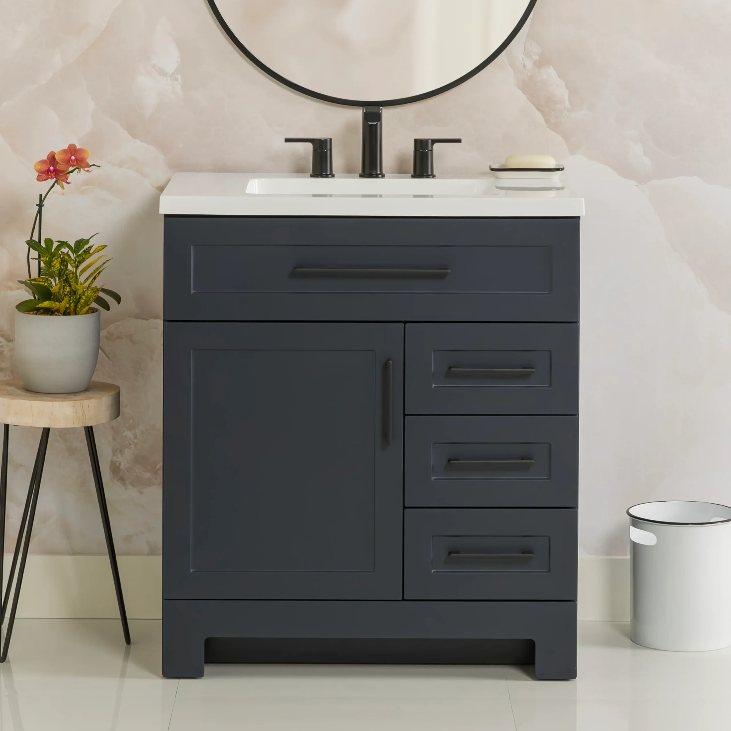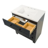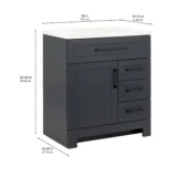 Elevate your bathroom remodel with the Style Selections Cauley Bathroom Vanity collection, a highly functional and durable choice for your home renovation. Built for daily use, this freestanding vanity combines a clean modern aesthetic with reliable construction. The sturdy engineered wood base features full overlay shaker style doors and is perfectly accented by matte black or bold gold hardware. It is topped with a beautiful white cultured marble surface that includes an easy to clean integrated rectangular sink. Available in a space saving 30 inch model for half baths, all the way up to an expansive 48 inch vanity for a larger master suite, the Cauley collection easily adapts to your specific layout. Choose from versatile finishes like crisp True White, Black and Navy Blue to match your exact style. Designed to maximize organization, the collection includes soft close cabinets and full extension drawers to keep your essentials neatly tucked away. Browse our catalog to discover the ideal size and color to complete your bathroom transformation.