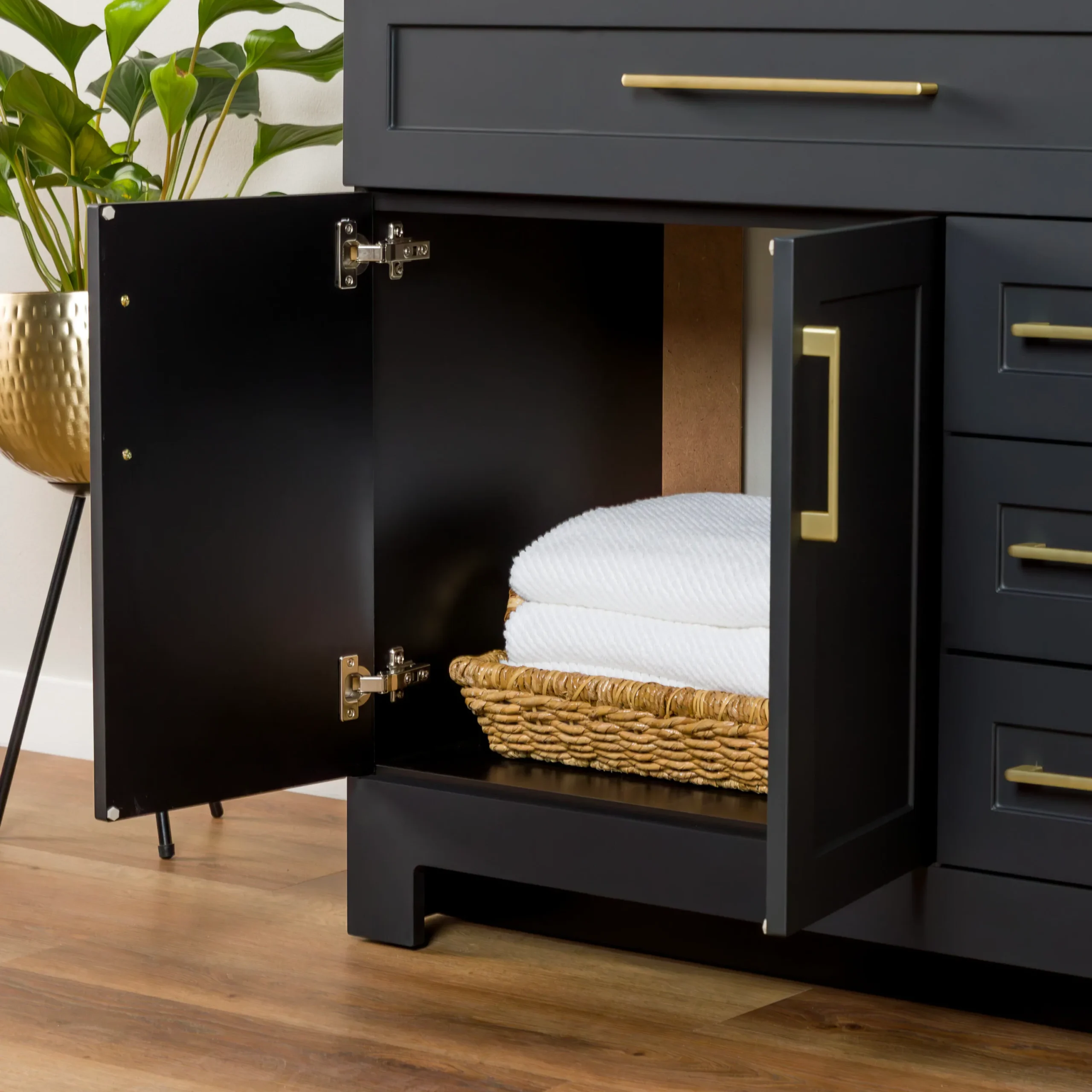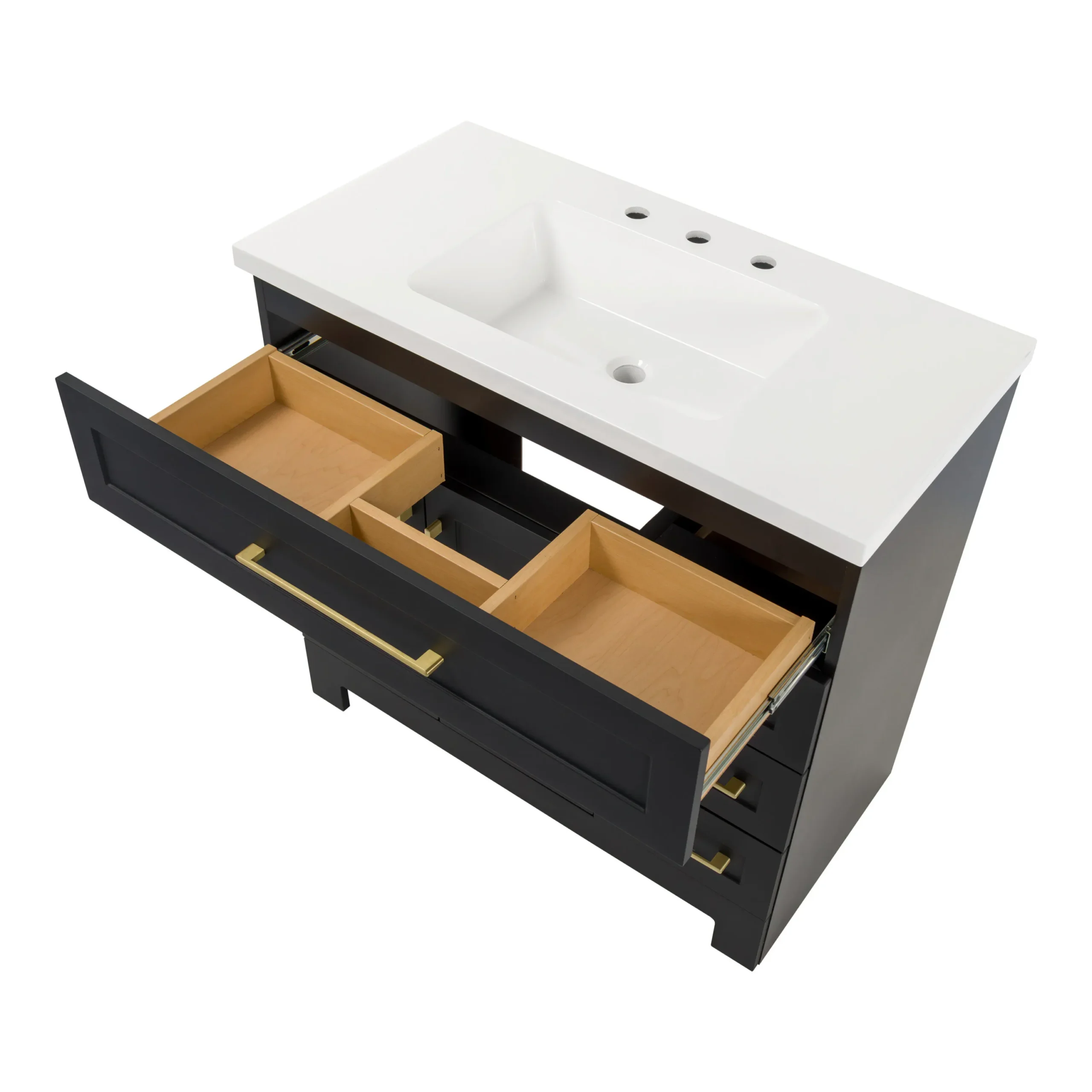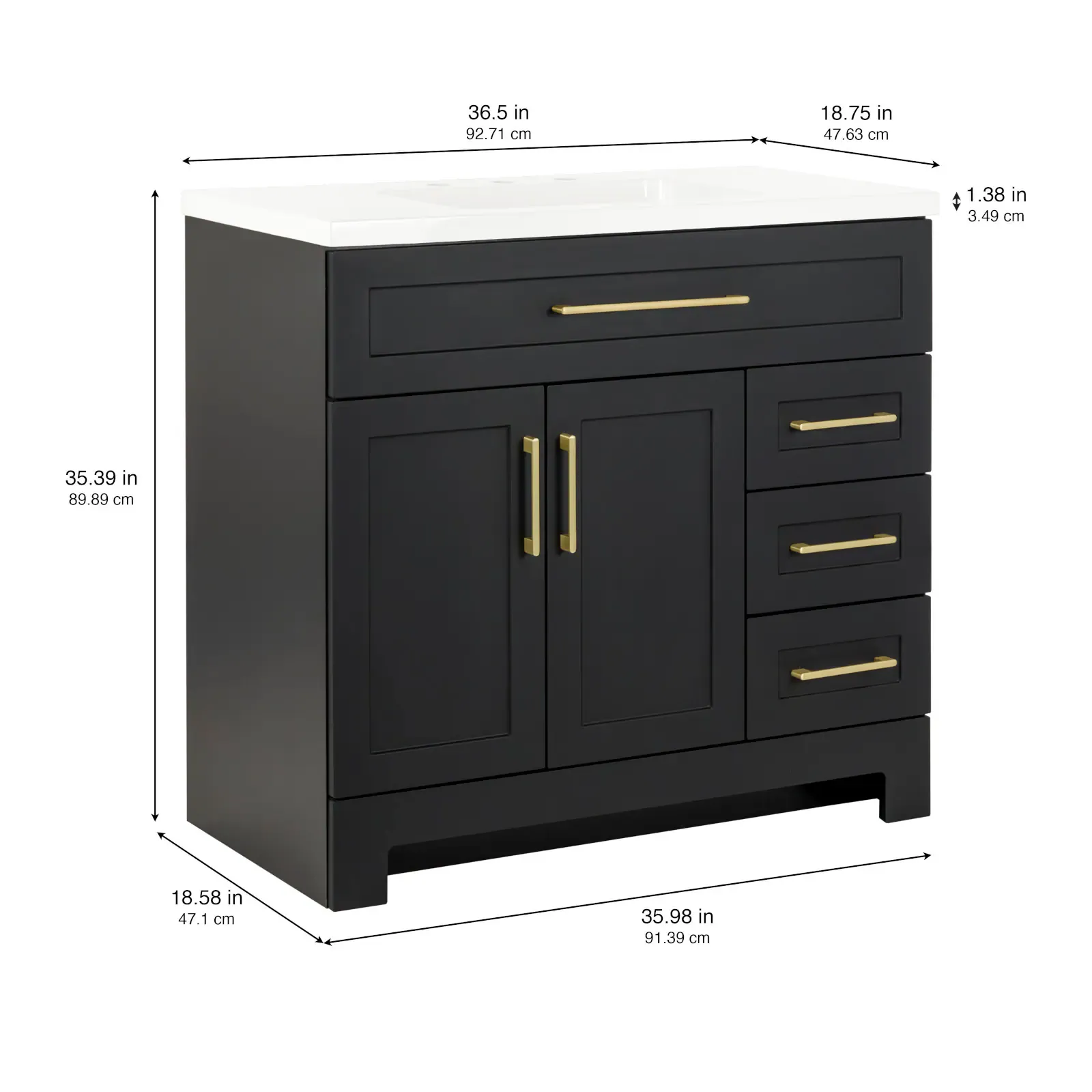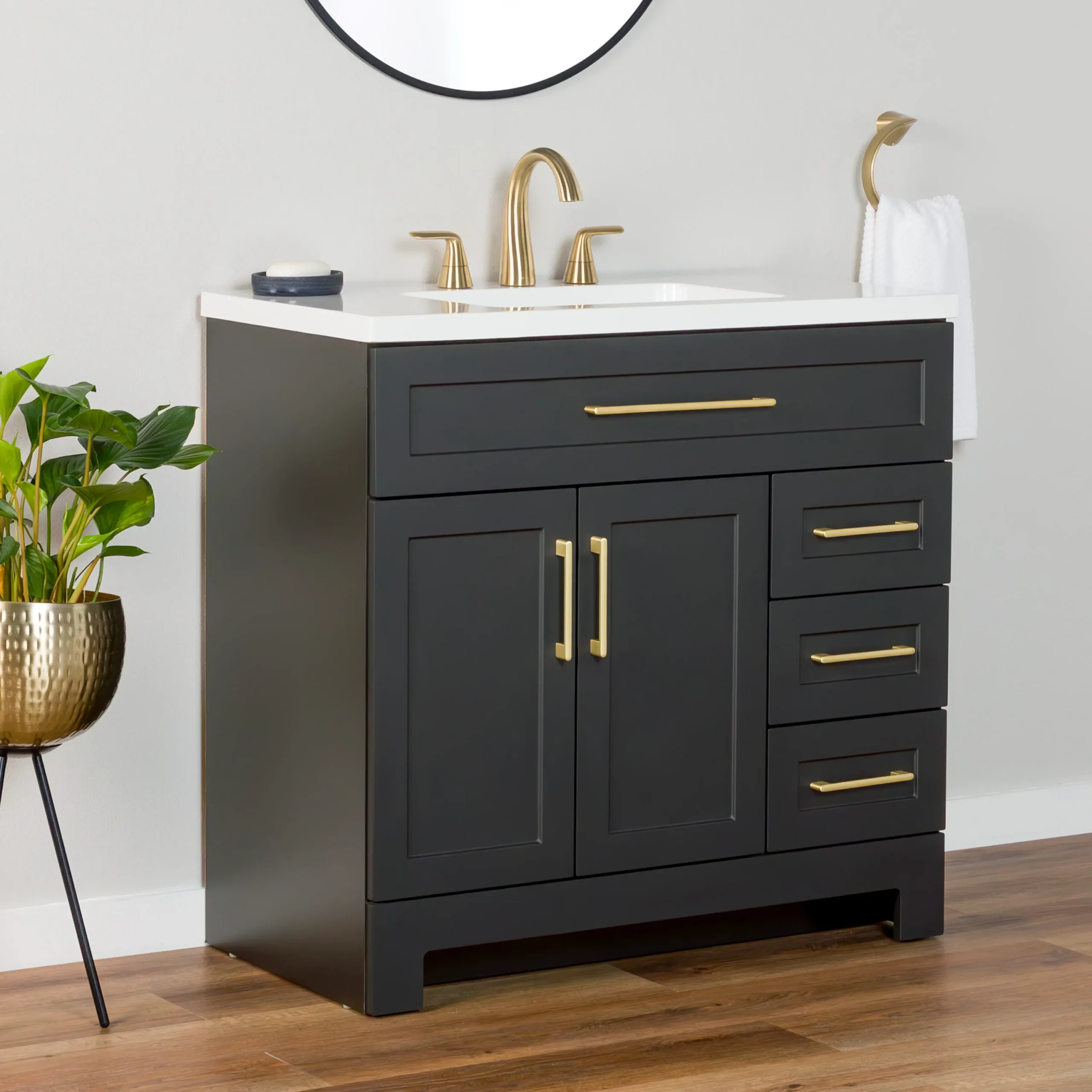Elevate your bathroom remodel with the Style Selections Cauley Bathroom Vanity collection, a highly functional and durable choice for your home renovation. Built for daily use, this freestanding vanity combines a clean modern aesthetic with reliable construction. The sturdy engineered wood base features full overlay shaker style doors and is perfectly accented by matte black or bold gold hardware. It is topped with a beautiful white cultured marble surface that includes an easy to clean integrated rectangular sink. Available in a space saving 30 inch model for half baths, all the way up to an expansive 48 inch vanity for a larger master suite, the Cauley collection easily adapts to your specific layout. Choose from versatile finishes like crisp True White, Black and Navy Blue to match your exact style. Designed to maximize organization, the collection includes soft close cabinets and full extension drawers to keep your essentials neatly tucked away. Browse our catalog to discover the ideal size and color to complete your bathroom transformation.