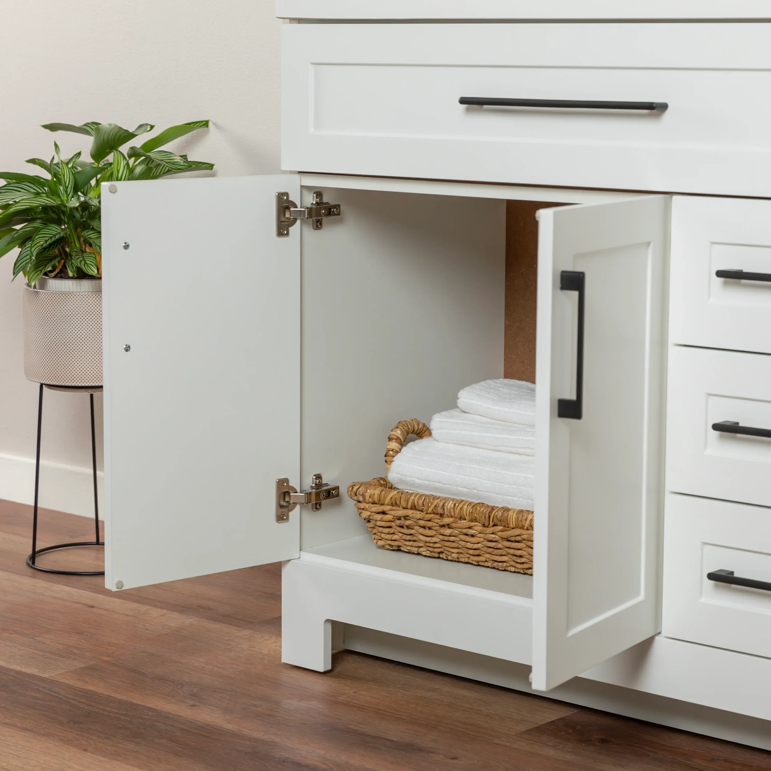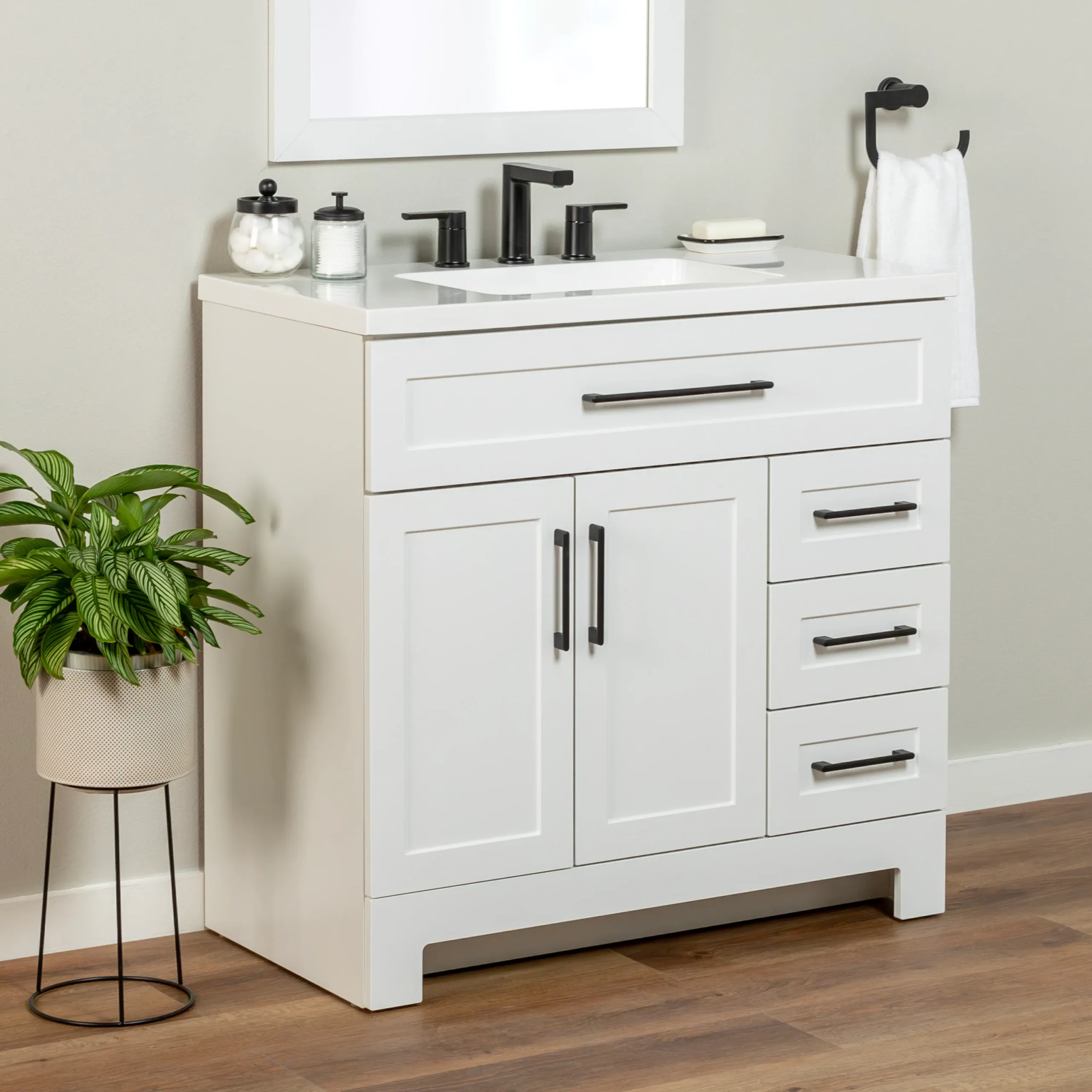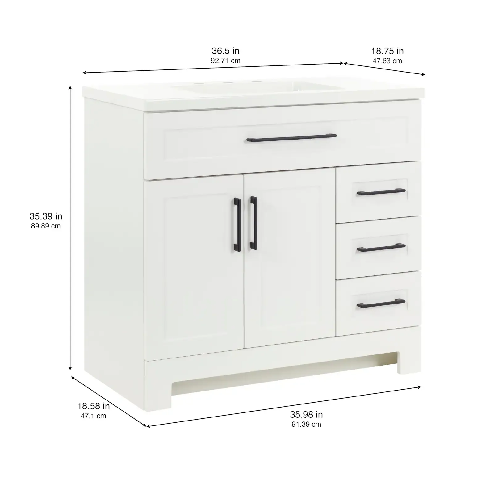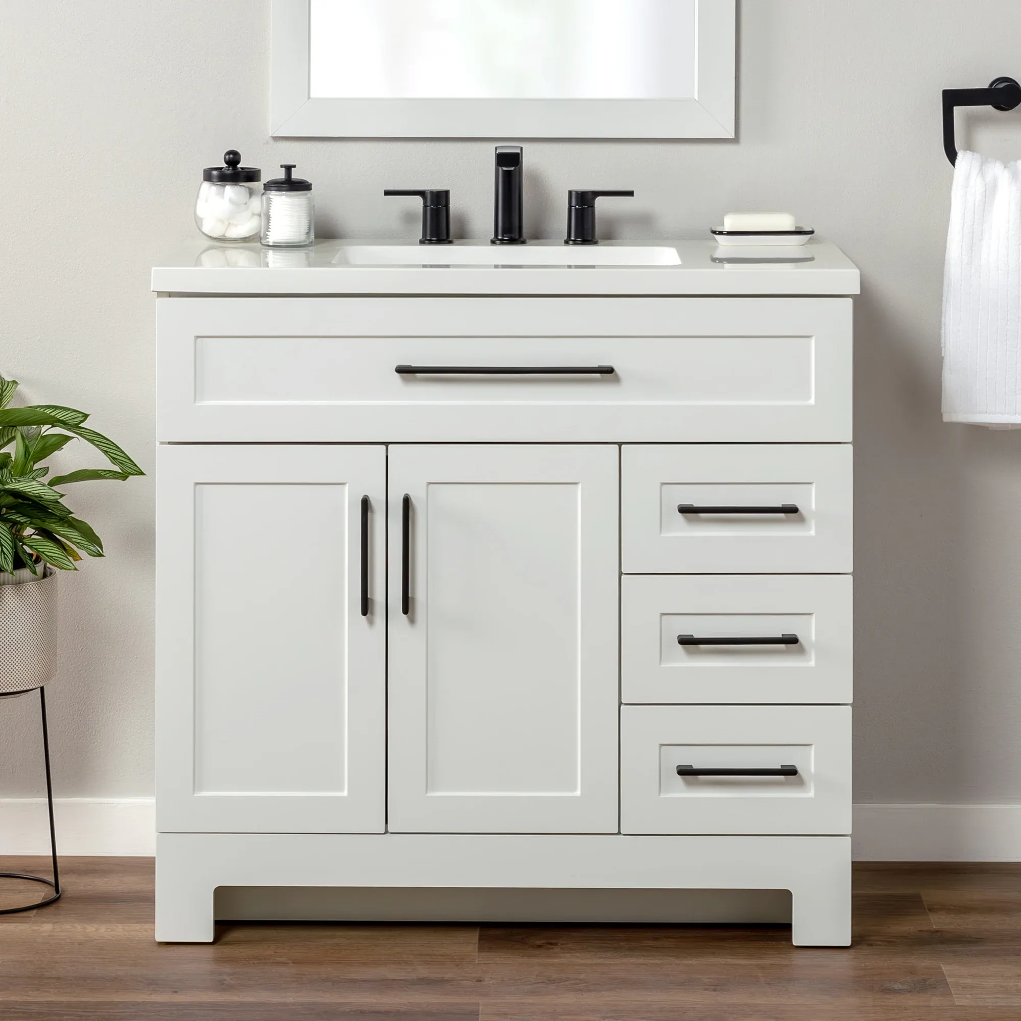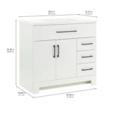 Elevate your bathroom remodel with the Style Selections Cauley Bathroom Vanity collection, a highly functional and durable choice for your home renovation. Built for daily use, this freestanding vanity combines a clean modern aesthetic with reliable construction. The sturdy engineered wood base features full overlay shaker style doors and is perfectly accented by matte black or bold gold hardware. It is topped with a beautiful white cultured marble surface that includes an easy to clean integrated rectangular sink. Available in a space saving 30 inch model for half baths, all the way up to an expansive 48 inch vanity for a larger master suite, the Cauley collection easily adapts to your specific layout. Choose from versatile finishes like crisp True White, Black and Navy Blue to match your exact style. Designed to maximize organization, the collection includes soft close cabinets and full extension drawers to keep your essentials neatly tucked away. Browse our catalog to discover the ideal size and color to complete your bathroom transformation.