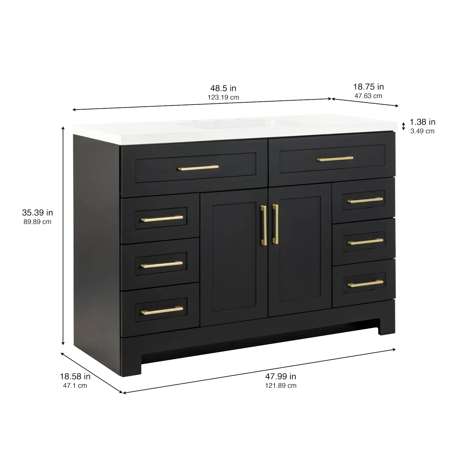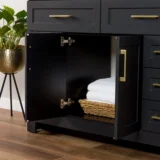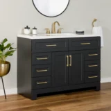 Elevate your bathroom remodel with the Style Selections Cauley Bathroom Vanity collection, a highly functional and durable choice for your home renovation. Built for daily use, this freestanding vanity combines a clean modern aesthetic with reliable construction. The sturdy engineered wood base features full overlay shaker style doors and is perfectly accented by matte black or bold gold hardware. It is topped with a beautiful white cultured marble surface that includes an easy to clean integrated rectangular sink. Available in a space saving 30 inch model for half baths, all the way up to an expansive 48 inch vanity for a larger master suite, the Cauley collection easily adapts to your specific layout. Choose from versatile finishes like crisp True White, Black and Navy Blue to match your exact style. Designed to maximize organization, the collection includes soft close cabinets and full extension drawers to keep your essentials neatly tucked away. Browse our catalog to discover the ideal size and color to complete your bathroom transformation.