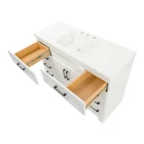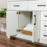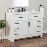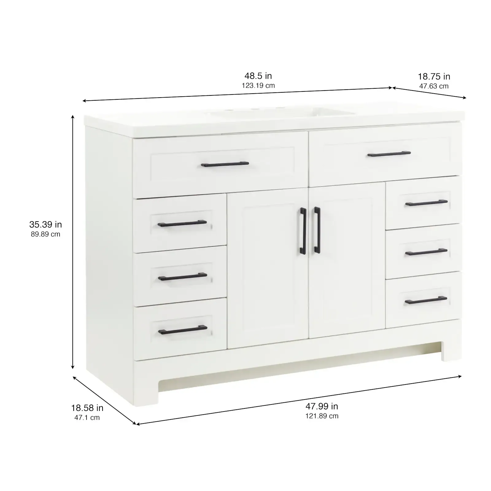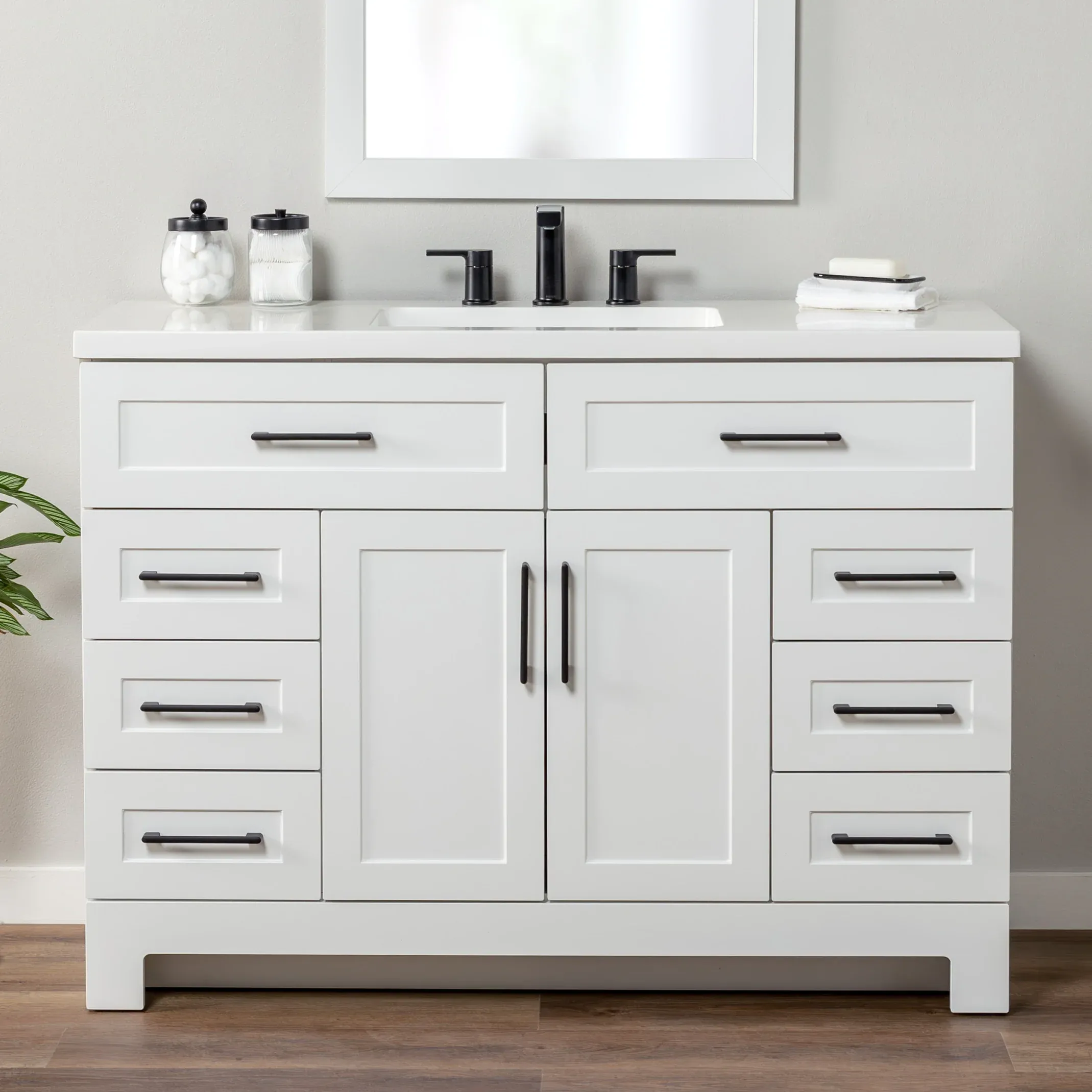Elevate your bathroom remodel with the Style Selections Cauley Bathroom Vanity collection, a highly functional and durable choice for your home renovation. Built for daily use, this freestanding vanity combines a clean modern aesthetic with reliable construction. The sturdy engineered wood base features full overlay shaker style doors and is perfectly accented by matte black or bold gold hardware. It is topped with a beautiful white cultured marble surface that includes an easy to clean integrated rectangular sink. Available in a space saving 30 inch model for half baths, all the way up to an expansive 48 inch vanity for a larger master suite, the Cauley collection easily adapts to your specific layout. Choose from versatile finishes like crisp True White, Black and Navy Blue to match your exact style. Designed to maximize organization, the collection includes soft close cabinets and full extension drawers to keep your essentials neatly tucked away. Browse our catalog to discover the ideal size and color to complete your bathroom transformation.