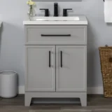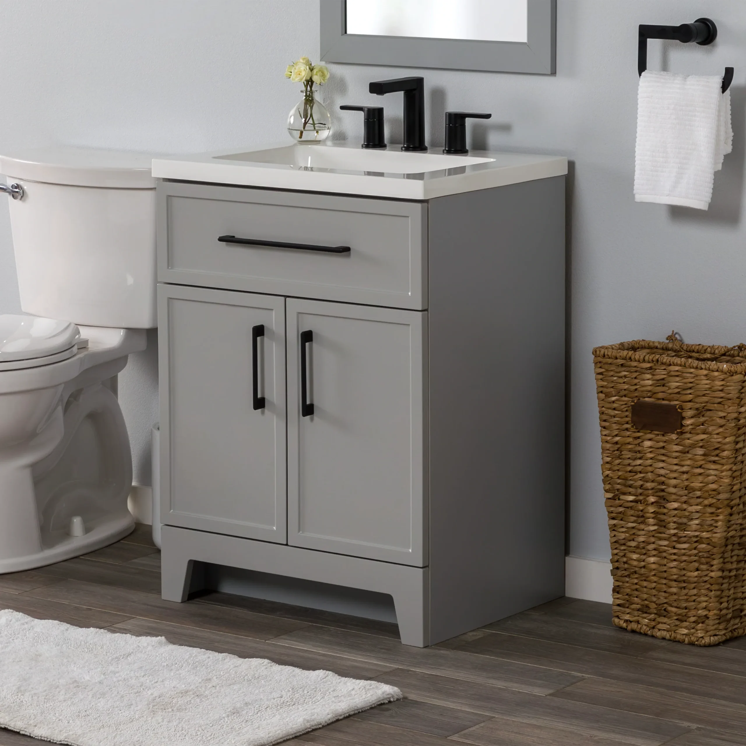 Discover the perfect balance of modern style and everyday functionality with the Style Selections Potter Bathroom Vanity collection. Crafted to easily elevate any bathroom remodel, this vanity features clean lines, full overlay shaker style doors, and bold matte black hardware for a striking and trend right look. Its durable engineered wood construction is paired with a sleek and easy to clean white cultured marble top that includes integrated rectangular sinks. Available in a variety of versatile finishes including crisp True White, classic Light Gray, and deep Navy Blue. Spanning sizes from a space saving 24 inch single sink to a master bath ready 60 inch double vanity, this collection effortlessly adapts to any floor plan. Designed with organization in mind, the vanities include full extension wraparound drawers and spacious cabinets to keep essentials neatly tucked away. Browse our catalog to find the ideal size and color to complete your next bathroom renovation project.