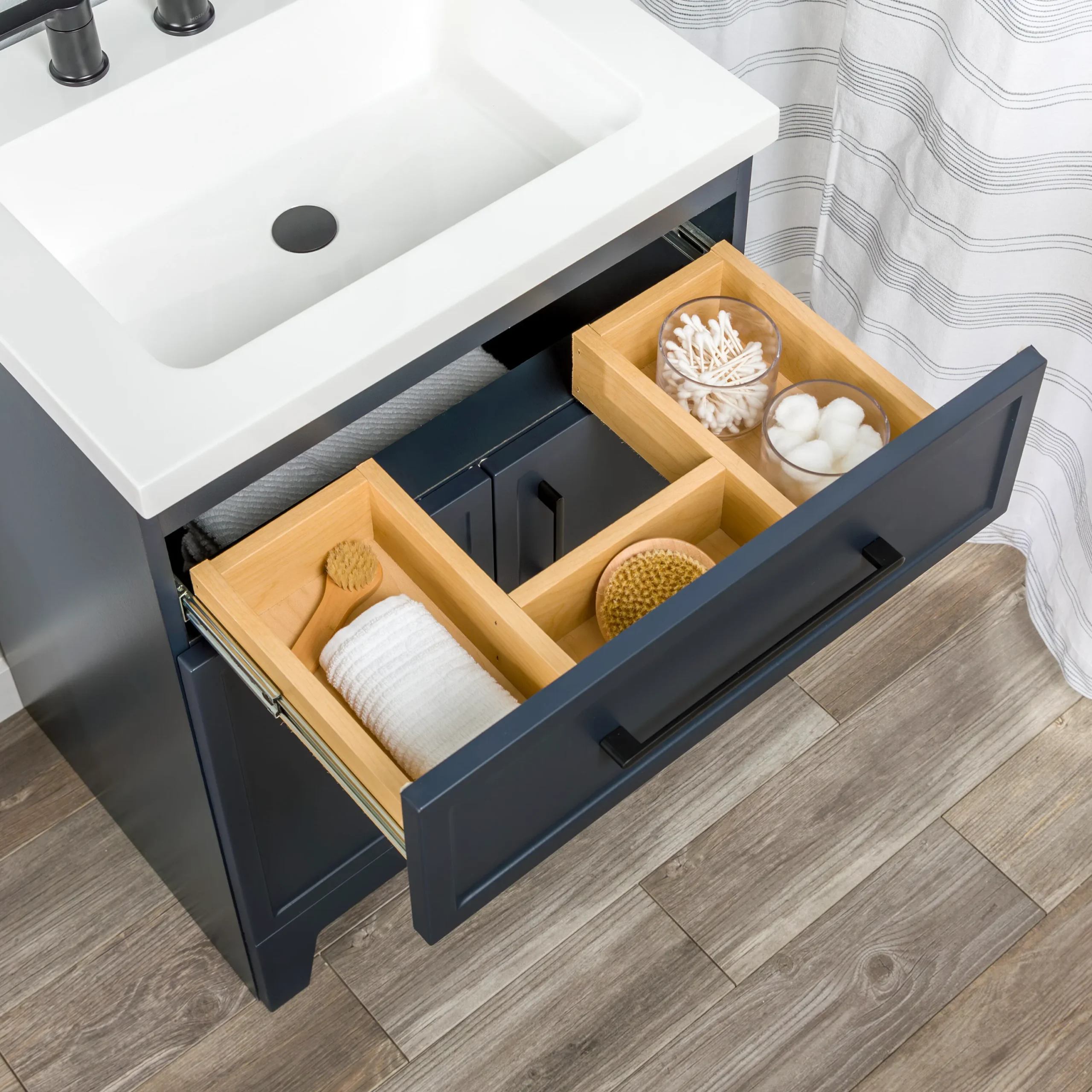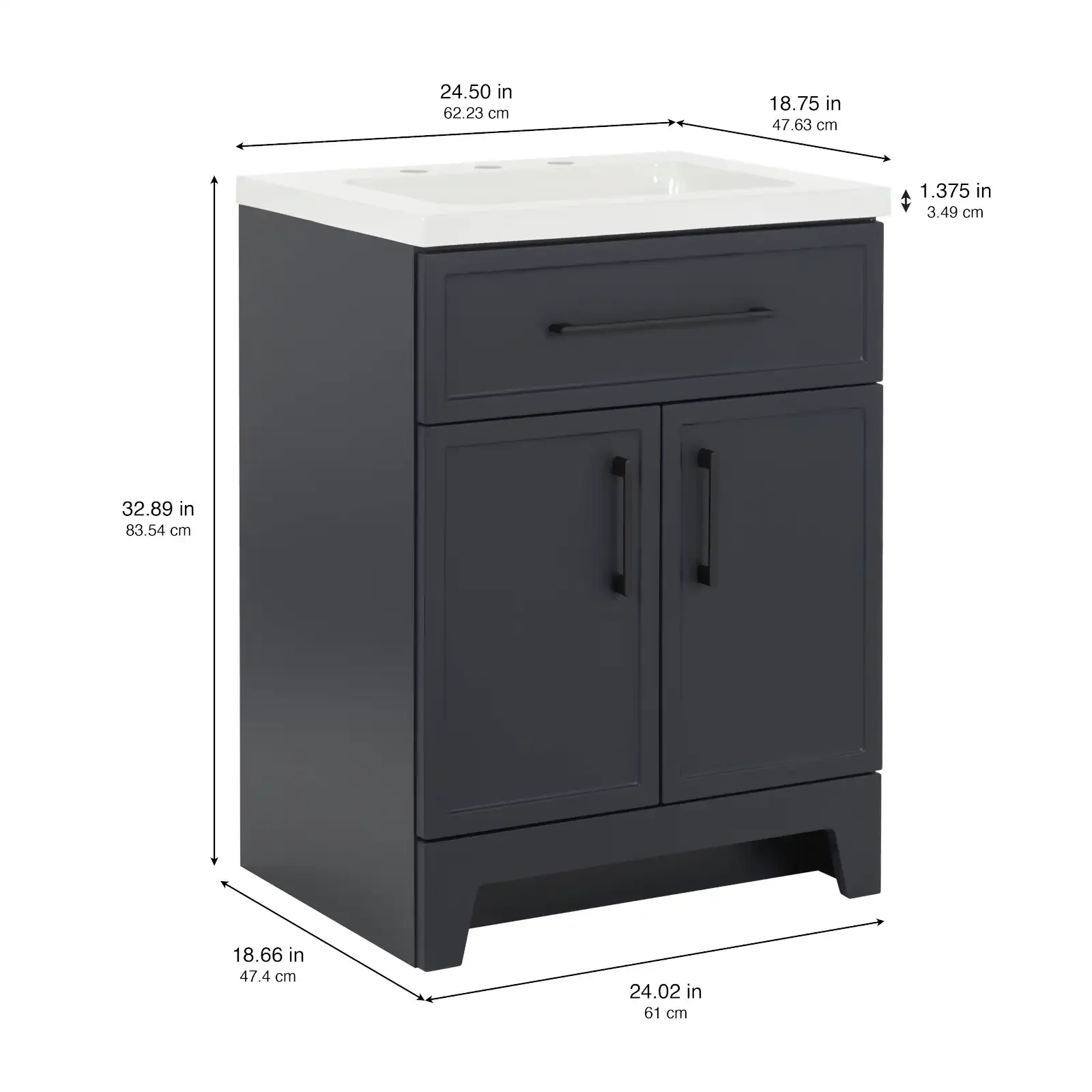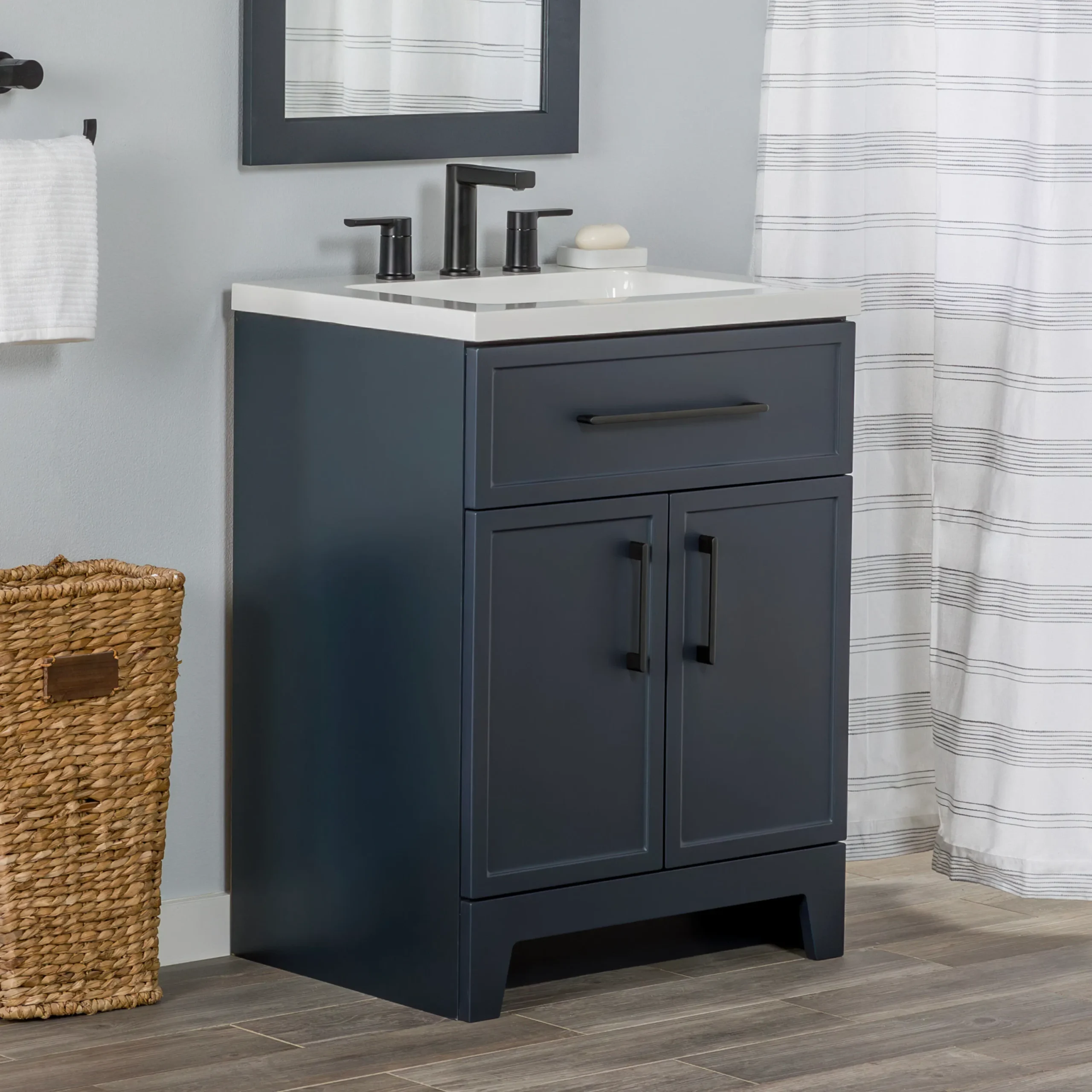 Discover the perfect balance of modern style and everyday functionality with the Style Selections Potter Bathroom Vanity collection. Crafted to easily elevate any bathroom remodel, this vanity features clean lines, full overlay shaker style doors, and bold matte black hardware for a striking and trend right look. Its durable engineered wood construction is paired with a sleek and easy to clean white cultured marble top that includes integrated rectangular sinks. Available in a variety of versatile finishes including crisp True White, classic Light Gray, and deep Navy Blue. Spanning sizes from a space saving 24 inch single sink to a master bath ready 60 inch double vanity, this collection effortlessly adapts to any floor plan. Designed with organization in mind, the vanities include full extension wraparound drawers and spacious cabinets to keep essentials neatly tucked away. Browse our catalog to find the ideal size and color to complete your next bathroom renovation project.