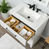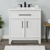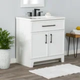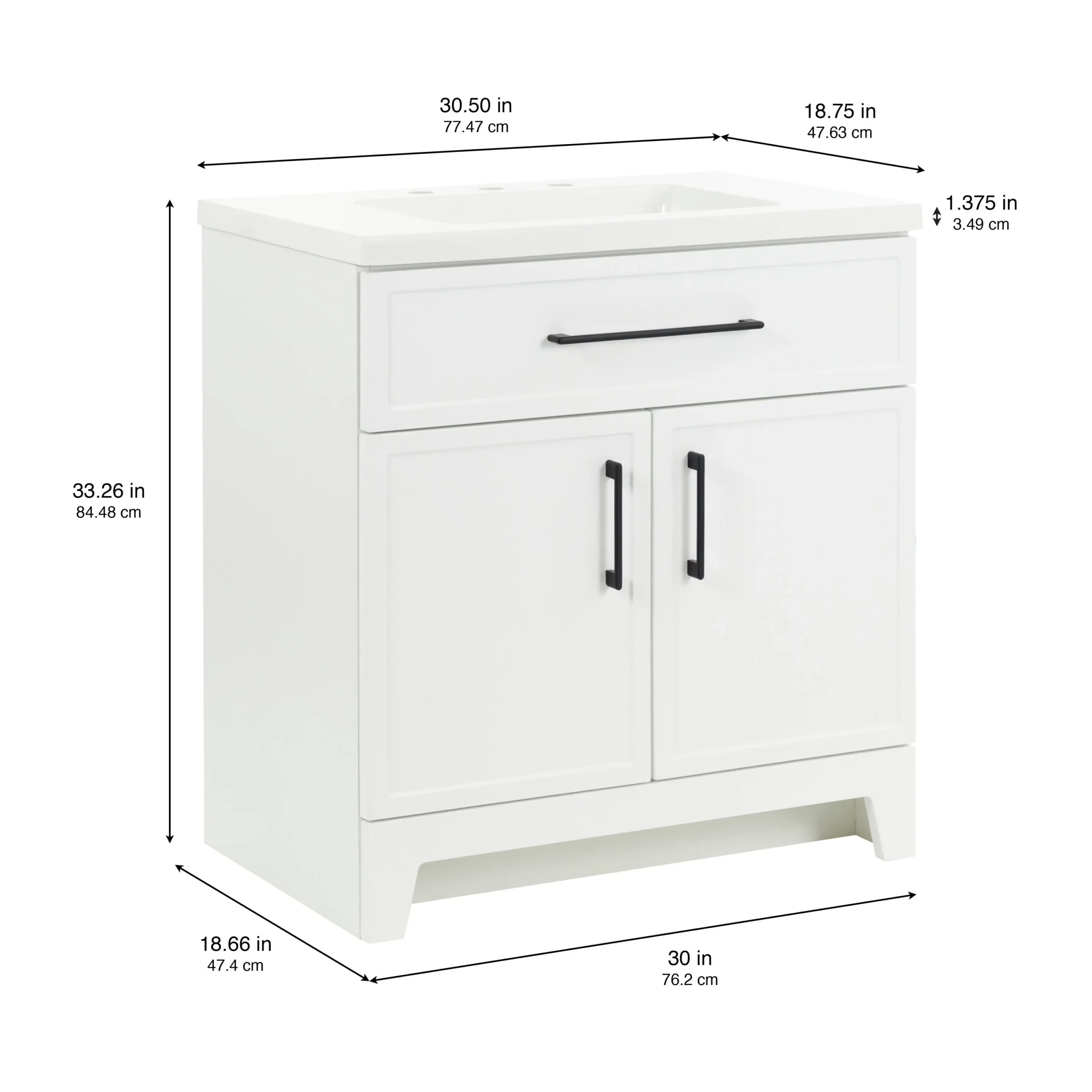 Discover the perfect balance of modern style and everyday functionality with the Style Selections Potter Bathroom Vanity collection. Crafted to easily elevate any bathroom remodel, this vanity features clean lines, full overlay shaker style doors, and bold matte black hardware for a striking and trend right look. Its durable engineered wood construction is paired with a sleek and easy to clean white cultured marble top that includes integrated rectangular sinks. Available in a variety of versatile finishes including crisp True White, classic Light Gray, and deep Navy Blue. Spanning sizes from a space saving 24 inch single sink to a master bath ready 60 inch double vanity, this collection effortlessly adapts to any floor plan. Designed with organization in mind, the vanities include full extension wraparound drawers and spacious cabinets to keep essentials neatly tucked away. Browse our catalog to find the ideal size and color to complete your next bathroom renovation project.
