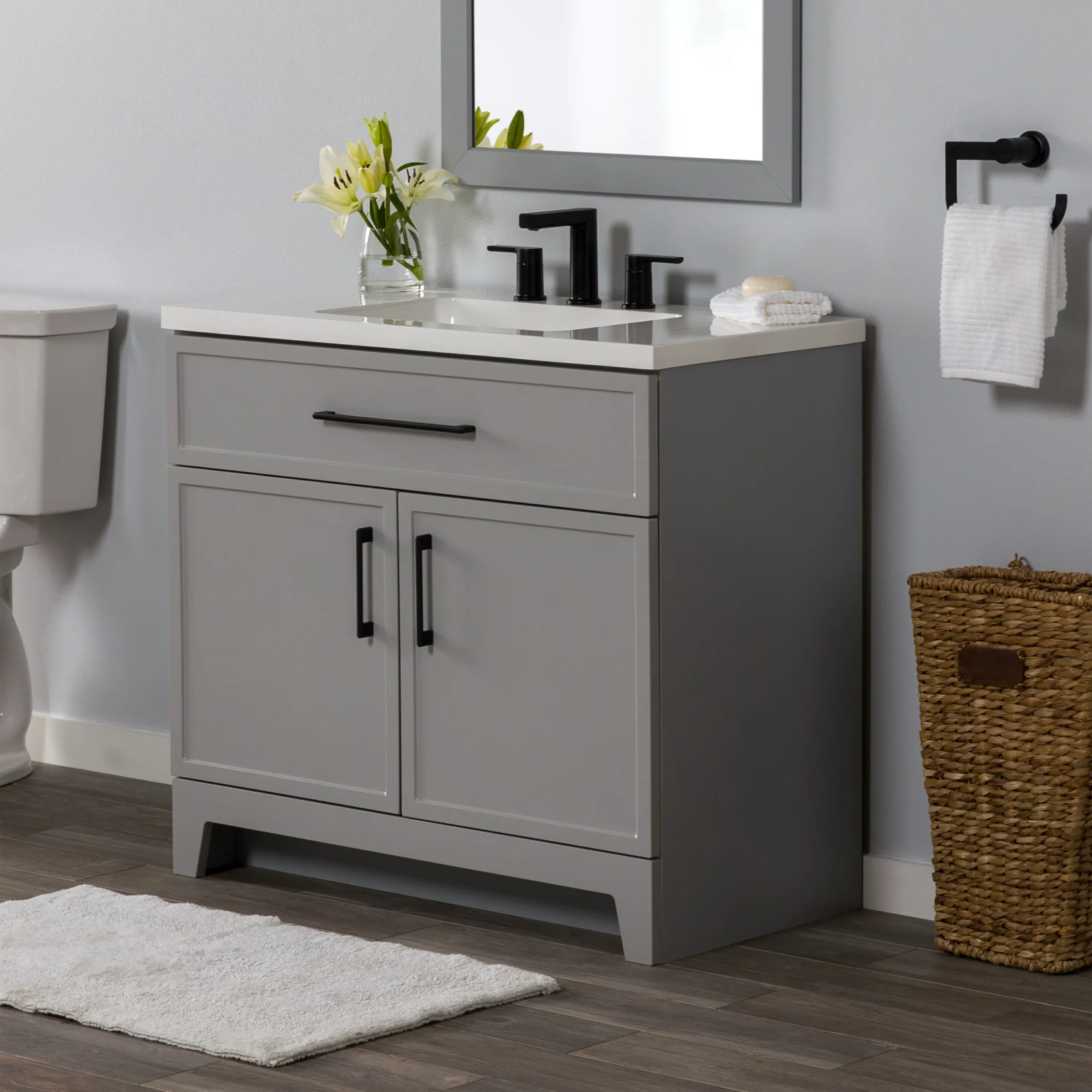 Discover the perfect balance of modern style and everyday functionality with the Style Selections Potter Bathroom Vanity collection. Crafted to easily elevate any bathroom remodel, this vanity features clean lines, full overlay shaker style doors, and bold matte black hardware for a striking and trend right look. Its durable engineered wood construction is paired with a sleek and easy to clean white cultured marble top that includes integrated rectangular sinks. Available in a variety of versatile finishes including crisp True White, classic Light Gray, and deep Navy Blue. Spanning sizes from a space saving 24 inch single sink to a master bath ready 60 inch double vanity, this collection effortlessly adapts to any floor plan. Designed with organization in mind, the vanities include full extension wraparound drawers and spacious cabinets to keep essentials neatly tucked away. Browse our catalog to find the ideal size and color to complete your next bathroom renovation project.