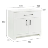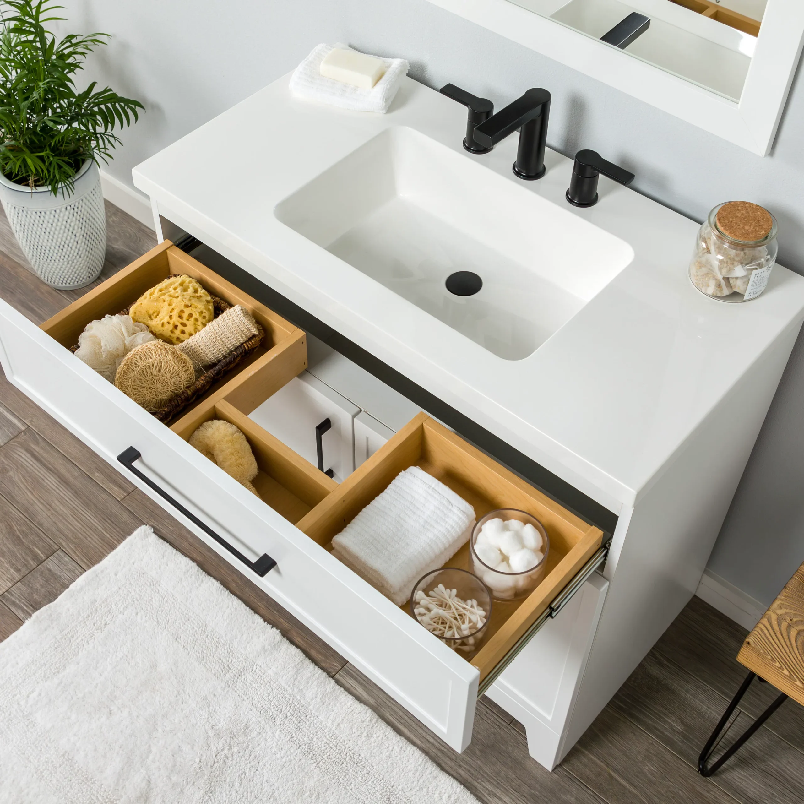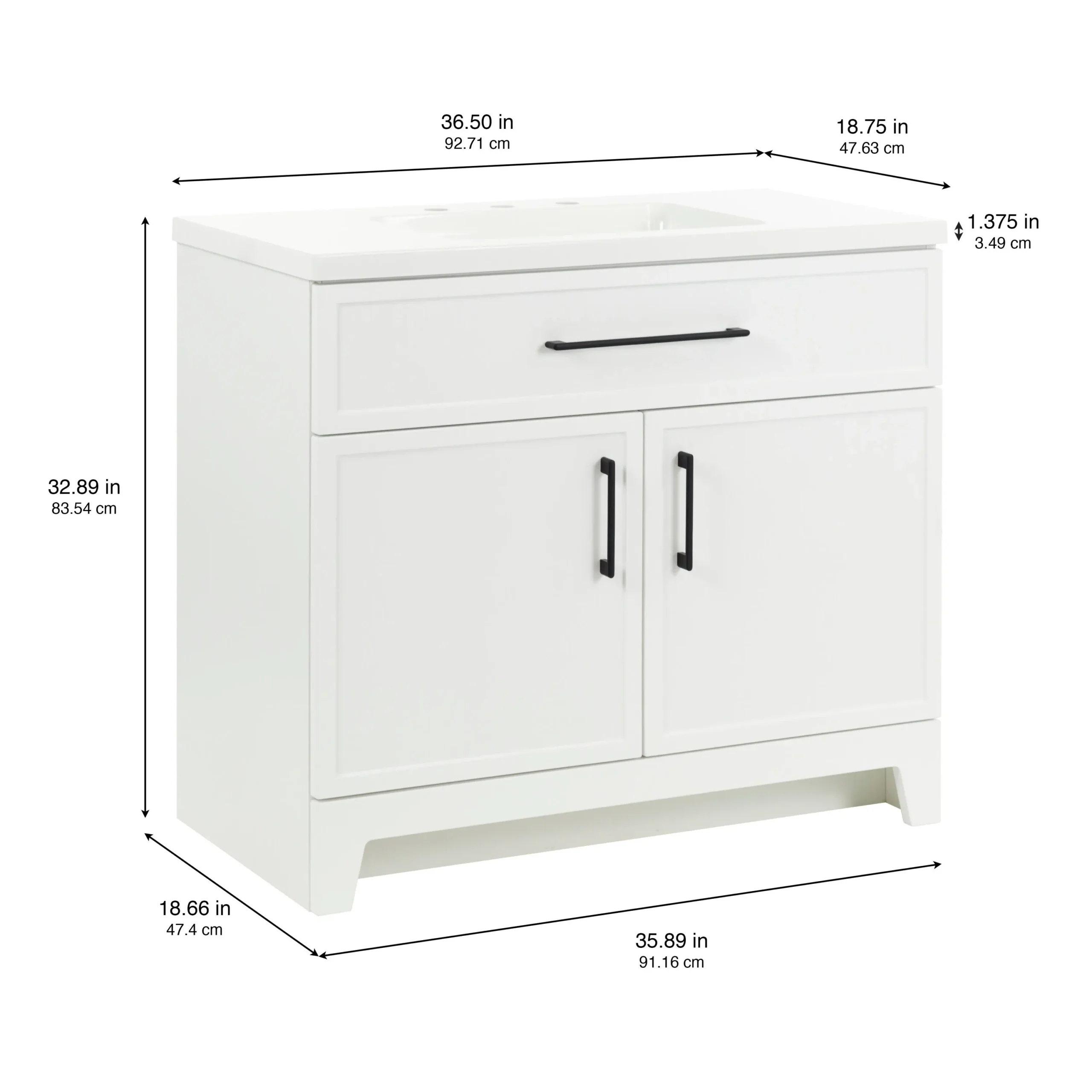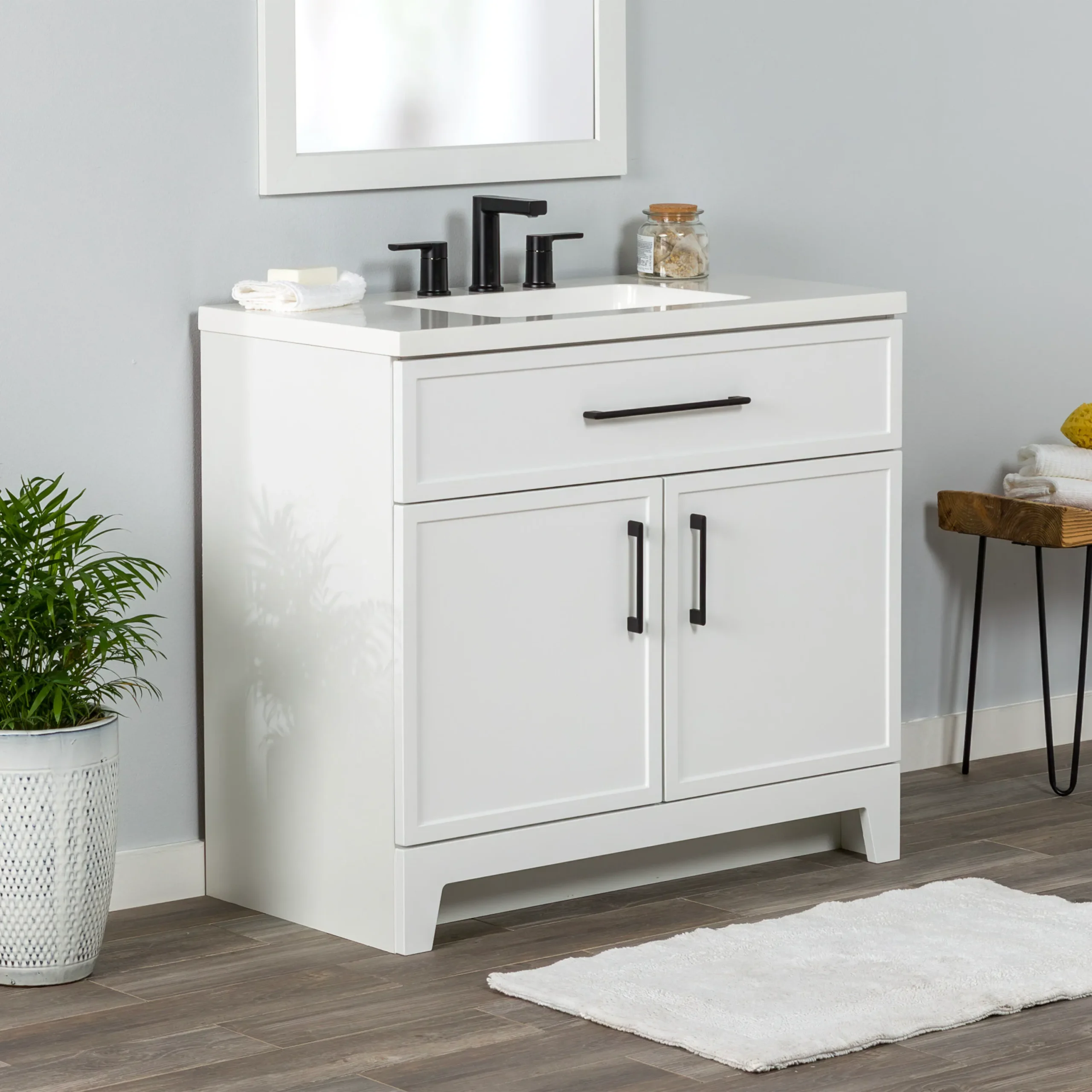 Discover the perfect balance of modern style and everyday functionality with the Style Selections Potter Bathroom Vanity collection. Crafted to easily elevate any bathroom remodel, this vanity features clean lines, full overlay shaker style doors, and bold matte black hardware for a striking and trend right look. Its durable engineered wood construction is paired with a sleek and easy to clean white cultured marble top that includes integrated rectangular sinks. Available in a variety of versatile finishes including crisp True White, classic Light Gray, and deep Navy Blue. Spanning sizes from a space saving 24 inch single sink to a master bath ready 60 inch double vanity, this collection effortlessly adapts to any floor plan. Designed with organization in mind, the vanities include full extension wraparound drawers and spacious cabinets to keep essentials neatly tucked away. Browse our catalog to find the ideal size and color to complete your next bathroom renovation project.