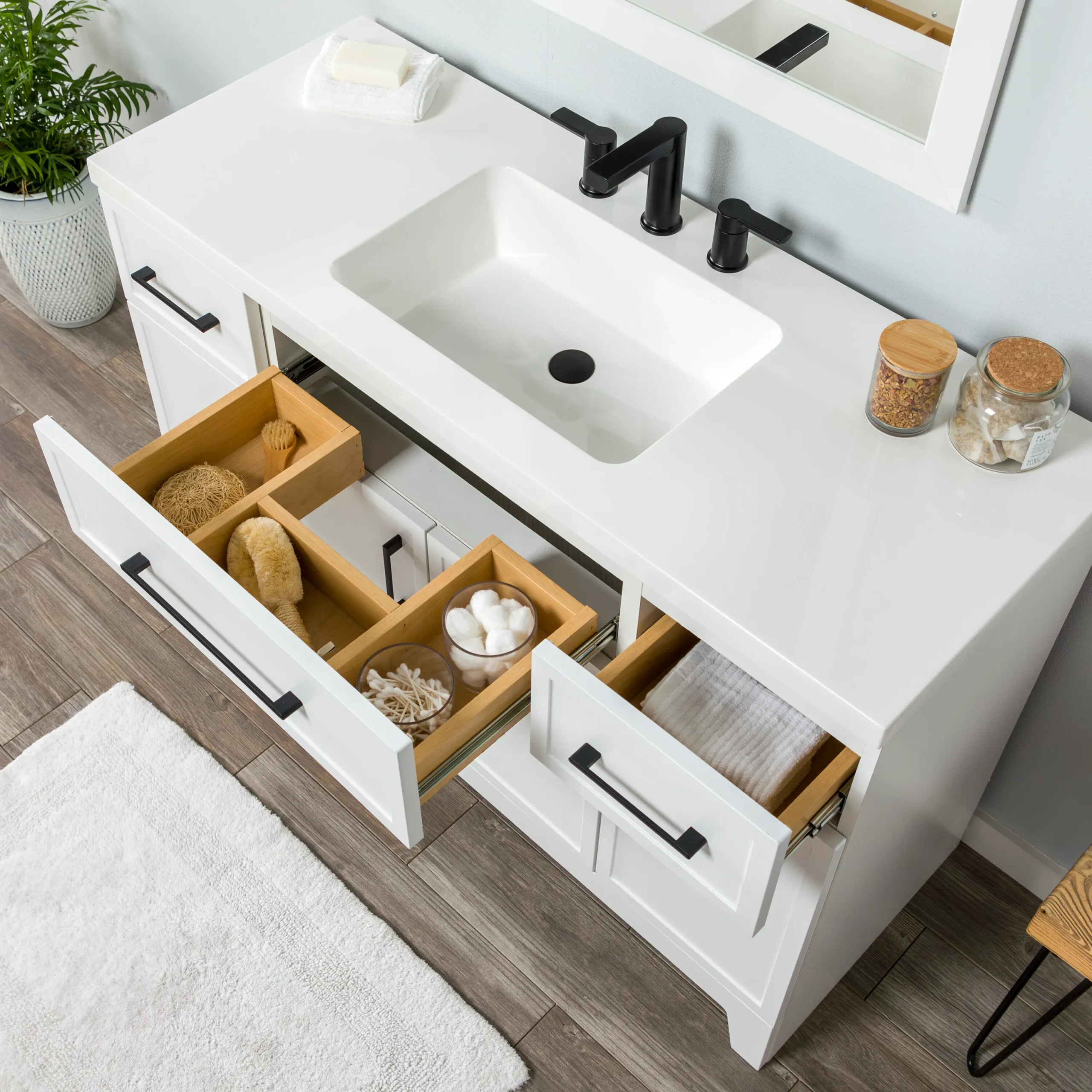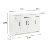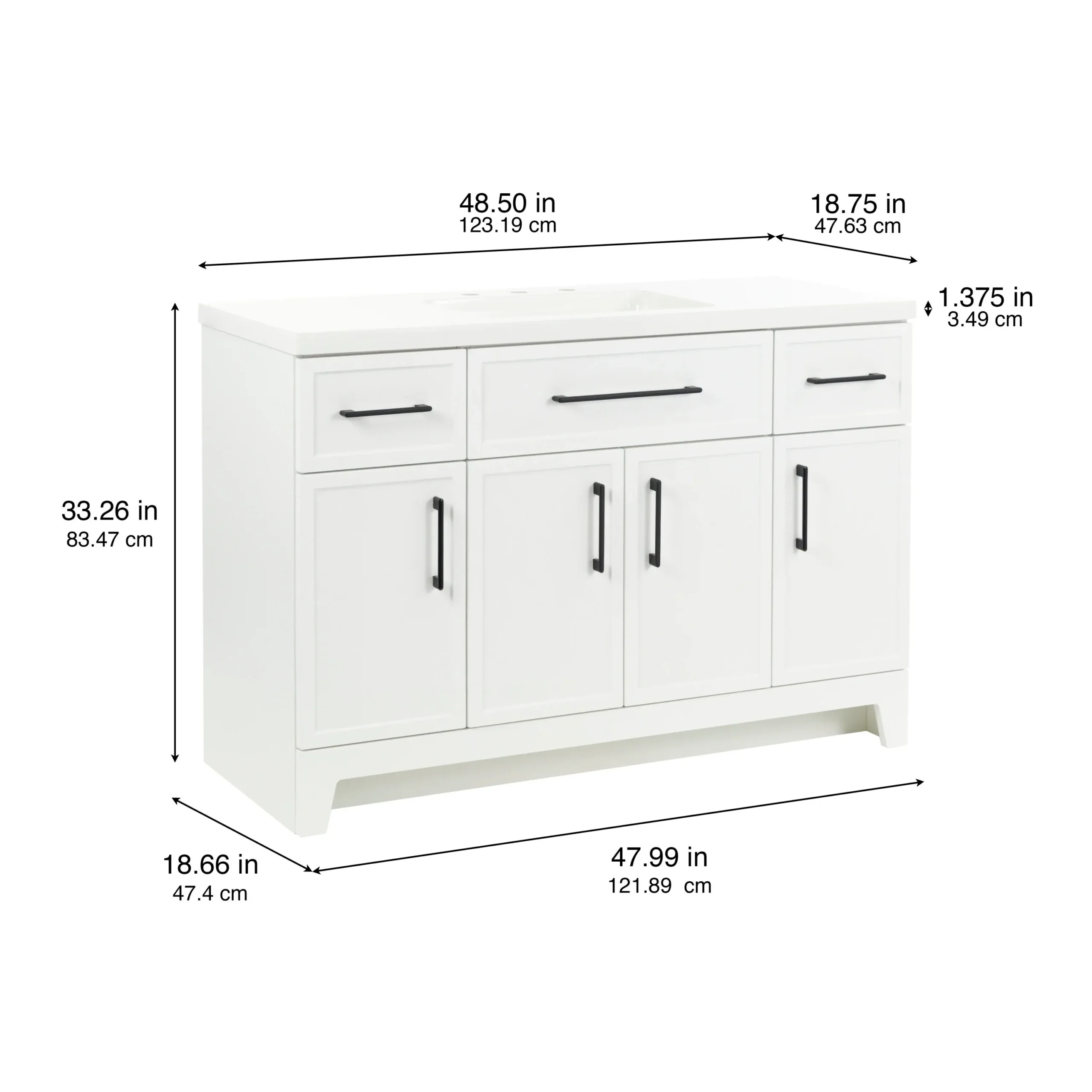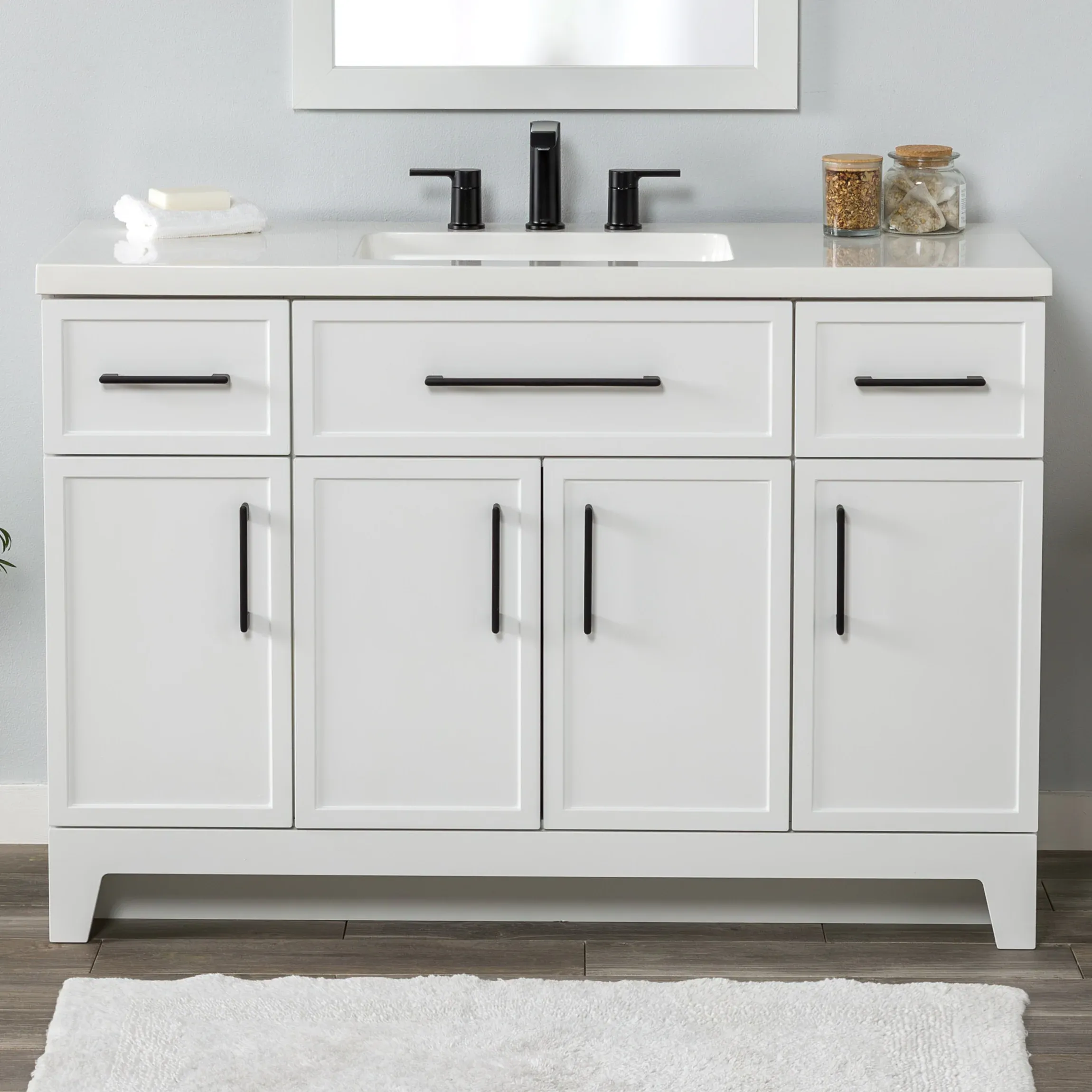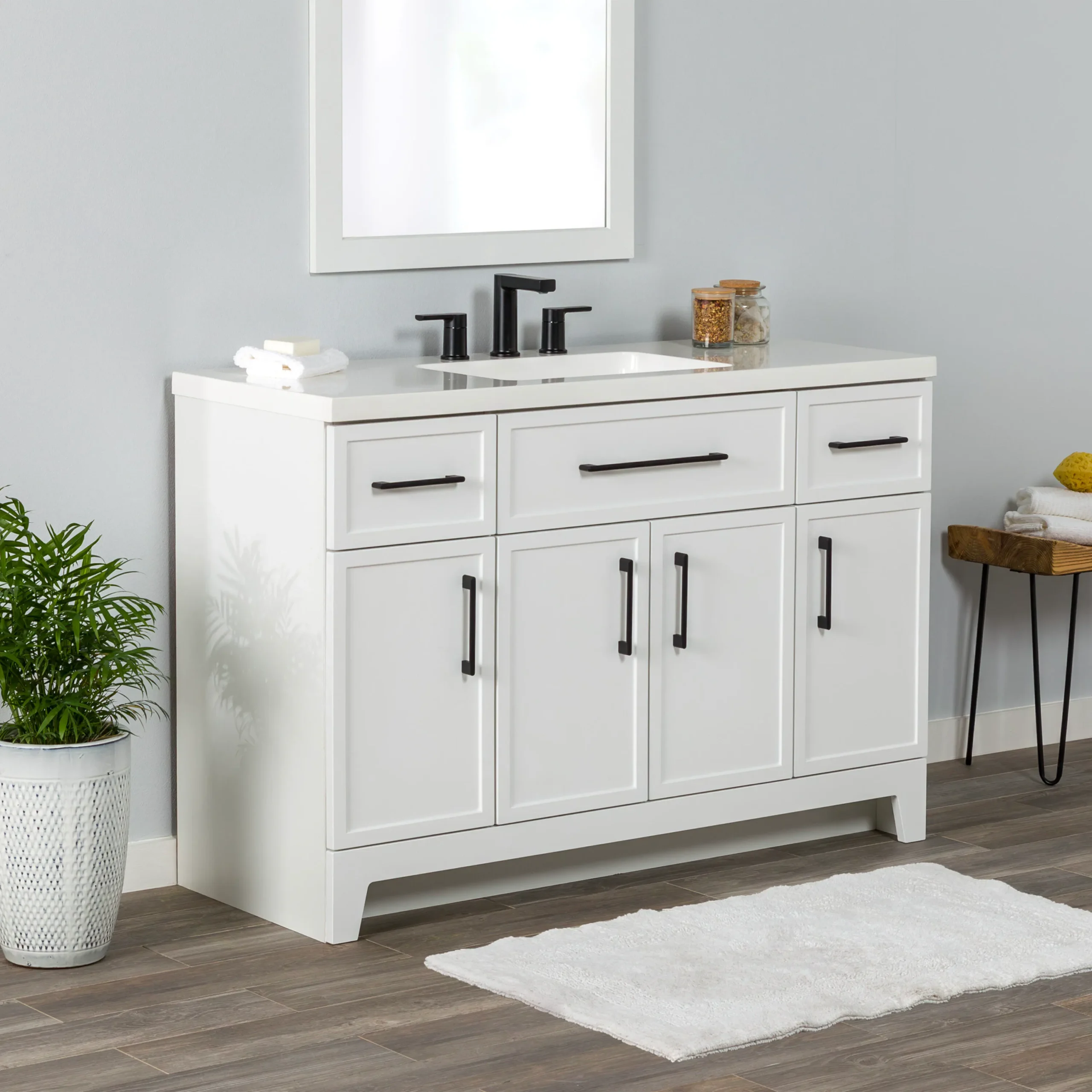 Discover the perfect balance of modern style and everyday functionality with the Style Selections Potter Bathroom Vanity collection. Crafted to easily elevate any bathroom remodel, this vanity features clean lines, full overlay shaker style doors, and bold matte black hardware for a striking and trend right look. Its durable engineered wood construction is paired with a sleek and easy to clean white cultured marble top that includes integrated rectangular sinks. Available in a variety of versatile finishes including crisp True White, classic Light Gray, and deep Navy Blue. Spanning sizes from a space saving 24 inch single sink to a master bath ready 60 inch double vanity, this collection effortlessly adapts to any floor plan. Designed with organization in mind, the vanities include full extension wraparound drawers and spacious cabinets to keep essentials neatly tucked away. Browse our catalog to find the ideal size and color to complete your next bathroom renovation project.