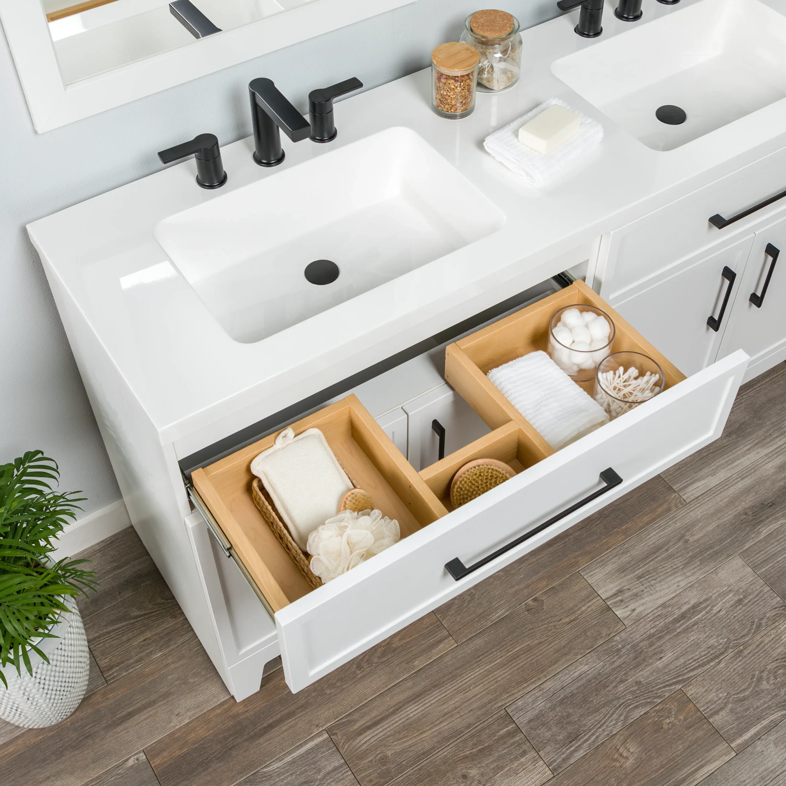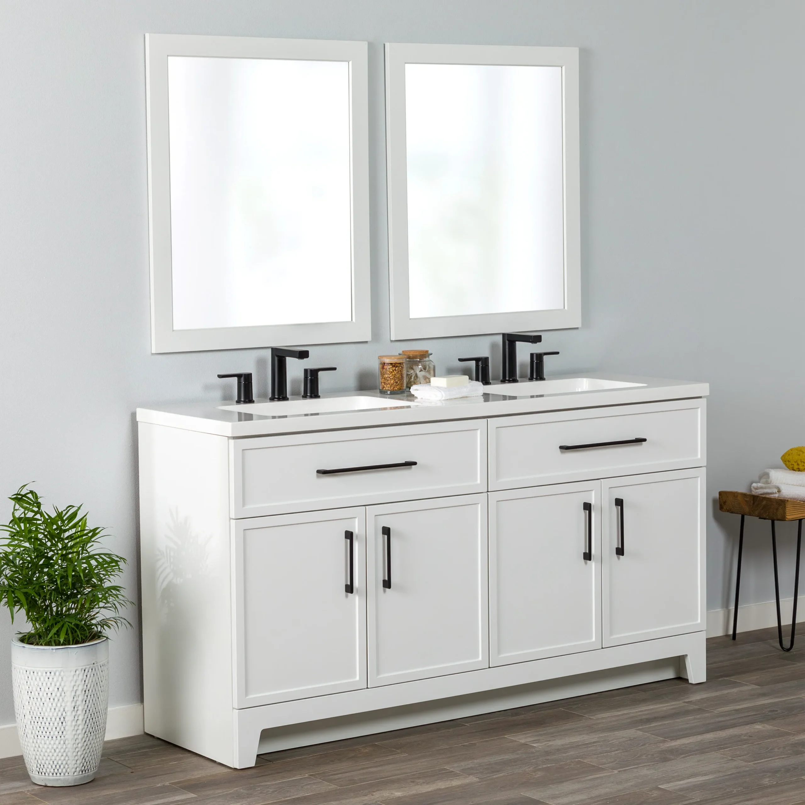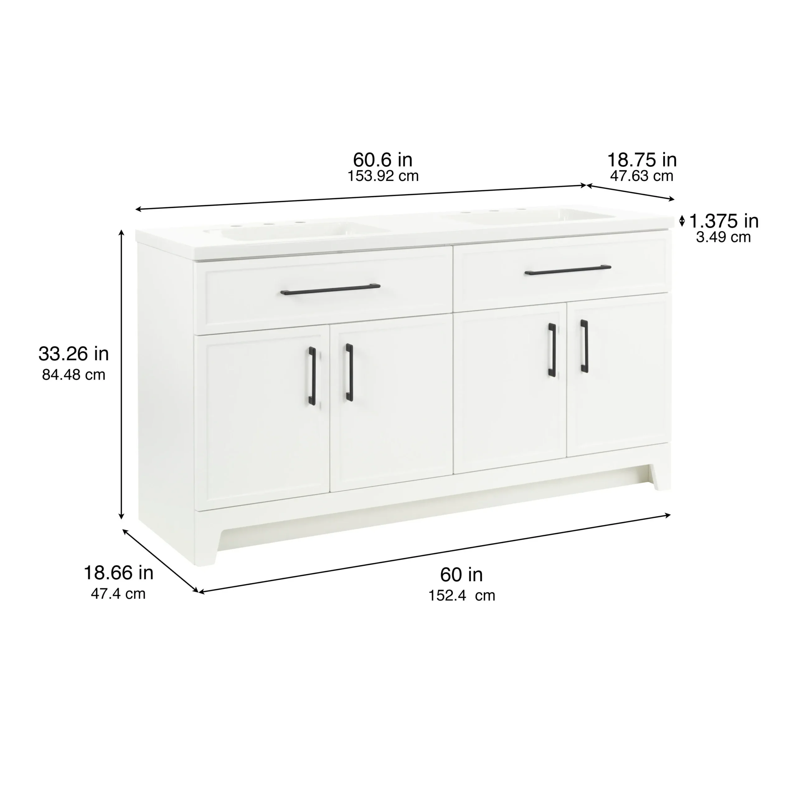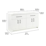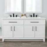 Discover the perfect balance of modern style and everyday functionality with the Style Selections Potter Bathroom Vanity collection. Crafted to easily elevate any bathroom remodel, this vanity features clean lines, full overlay shaker style doors, and bold matte black hardware for a striking and trend right look. Its durable engineered wood construction is paired with a sleek and easy to clean white cultured marble top that includes integrated rectangular sinks. Available in a variety of versatile finishes including crisp True White, classic Light Gray, and deep Navy Blue. Spanning sizes from a space saving 24 inch single sink to a master bath ready 60 inch double vanity, this collection effortlessly adapts to any floor plan. Designed with organization in mind, the vanities include full extension wraparound drawers and spacious cabinets to keep essentials neatly tucked away. Browse our catalog to find the ideal size and color to complete your next bathroom renovation project.