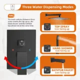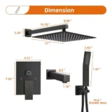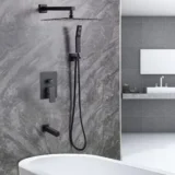 Elevate your daily routine with the meticulously crafted Zalerock Rainfall Tub and Shower Faucet System, designed to perfectly simulate the soothing sensation of a gentle natural rainstorm. Featuring an ultra slim 12 inch square rainfall shower head and an extended shower arm, this system boasts a generous water coverage area and delivers a high pressure experience even in low water pressure conditions. It includes a versatile handheld shower and a sleek bathtub spout to provide a comprehensive and luxurious bathing experience. With a simple turn of the knob, you can effortlessly switch between the rainfall and handheld modes. The solid brass, pressure balancing valve core actively monitors water pressure to safeguard against sudden temperature fluctuations and prevent scalding. Designed for incredibly easy maintenance, the silicone nozzles allow you to simply wipe away mineral deposits with the swipe of a finger to prevent clogging. Complete with a bold matte black finish, this contemporary fixture perfectly embraces modern decor trends. Browse our catalog to discover how this durable and elegant shower system can complete your home.