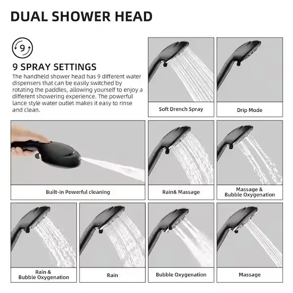 Transform your bathroom routine with the Zalerock Wall Mounted Dual Shower Head System, designed to bring a luxurious and immersive experience to your daily wash. This impressive kit features a large 12 inch square rainfall shower head that provides full body coverage, making you feel like you are standing in a gentle rainstorm. Paired with a versatile handheld shower wand, it offers nine distinct spray settings—including a powerful top jet mode—to easily customize your clean. The handheld wand is equipped with an innovative filtration attachment that purifies your water, protecting your hair and skin from harsh minerals. Switching between the overhead rain shower and the wand is completely effortless thanks to the smoothly rotating 3 way diverter valve. Designed for a highly adjustable and easy DIY installation, it includes an S shaped extension arm so you can set the perfect height and angle, while the adhesive patch makes mounting the handheld wand incredibly simple without the need to replace your entire shower system. Browse our catalog to explore how this high performance fixture can affordably upgrade your space.